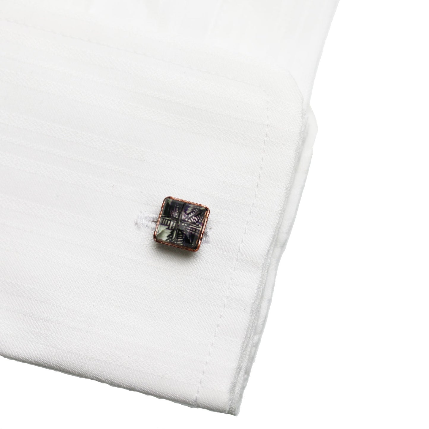 Se trata de un botón para gemelos que utiliza las piezas cuadradas de resina de "Lily Series" (Morado). Bastante púrpura atrae nuestros ojos. Puedes disfrutar de los puños únicos casuales de moda.