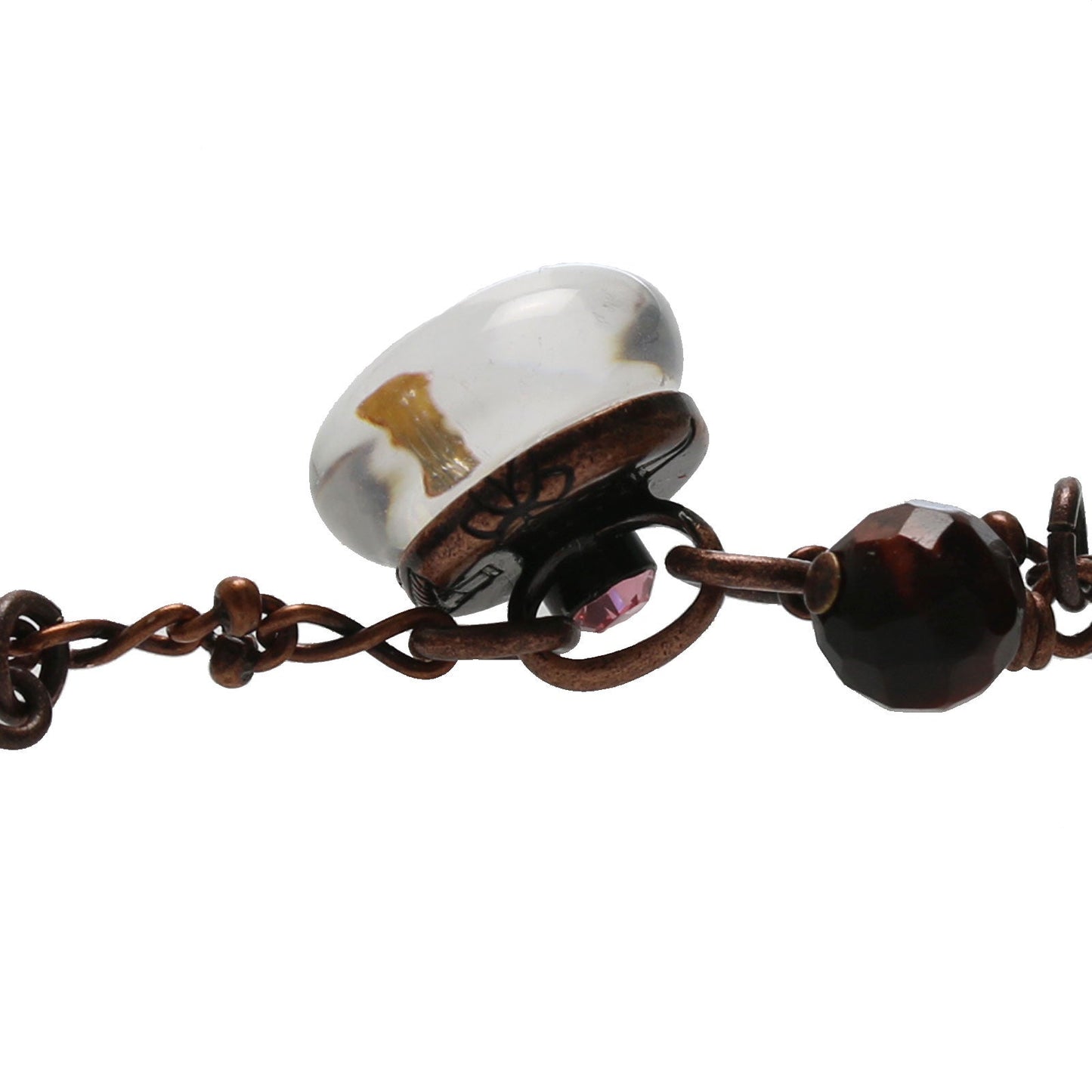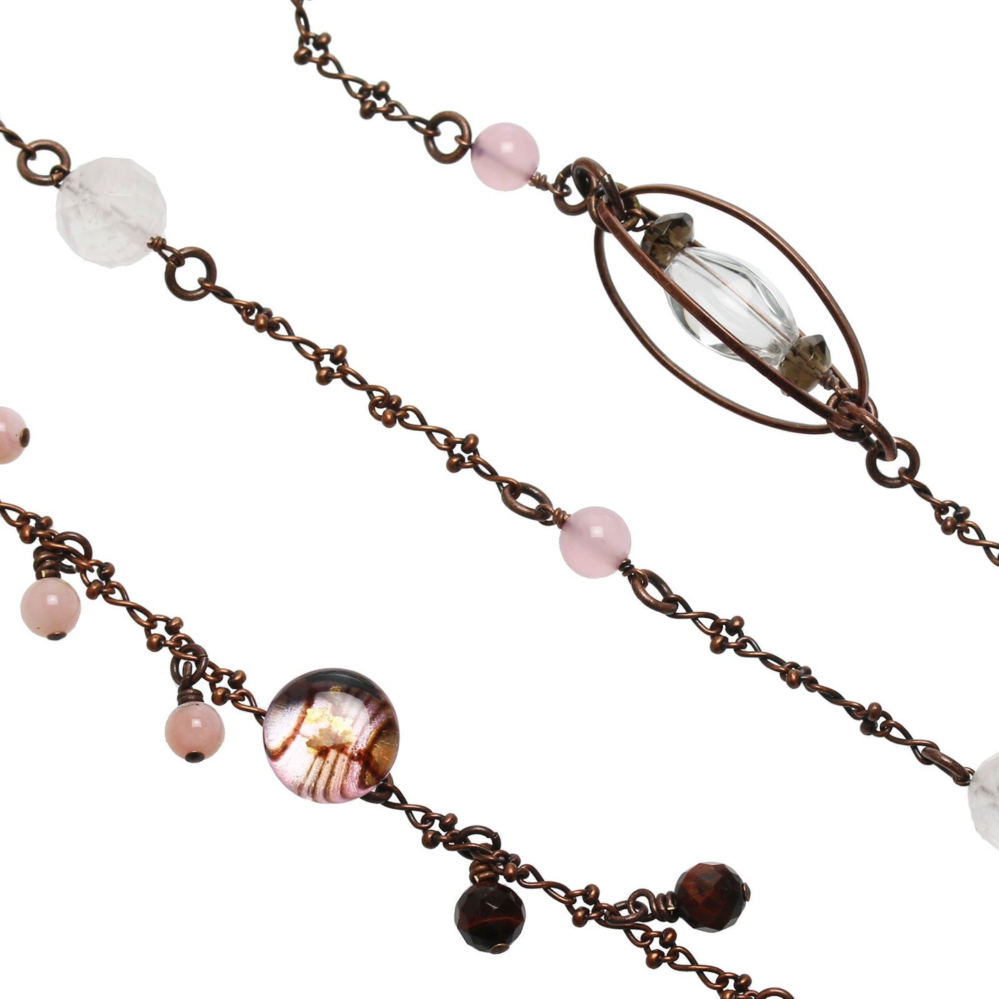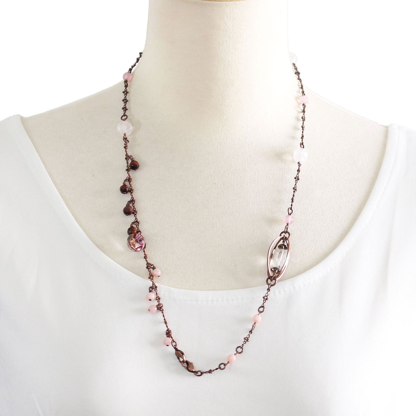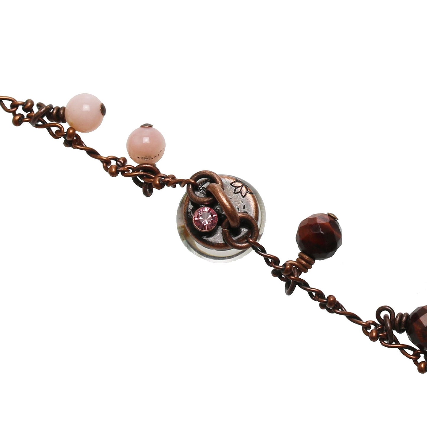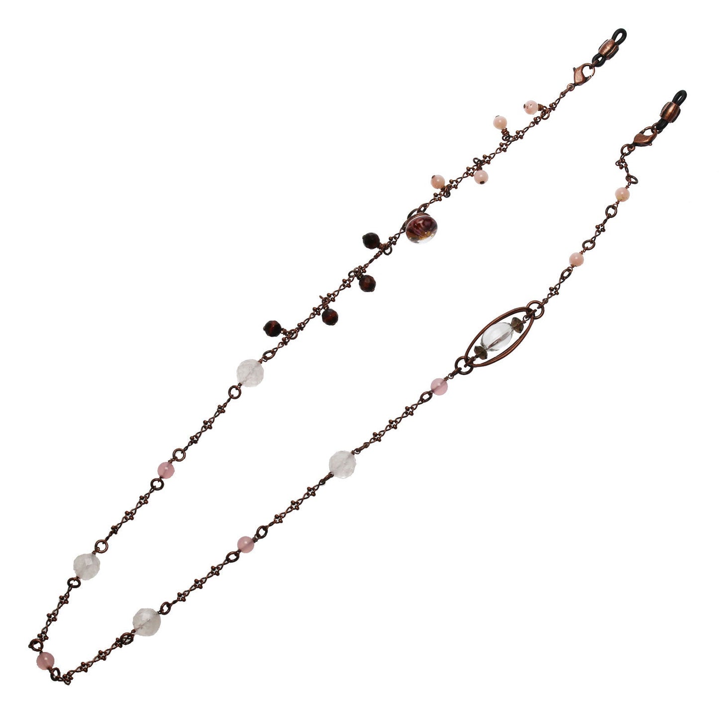 - Ópalo común rosa, Ojo de tigre, Cuarzo rosa, Cuarzo, Cuarzo ahumado, Calcedonia (teñida)
