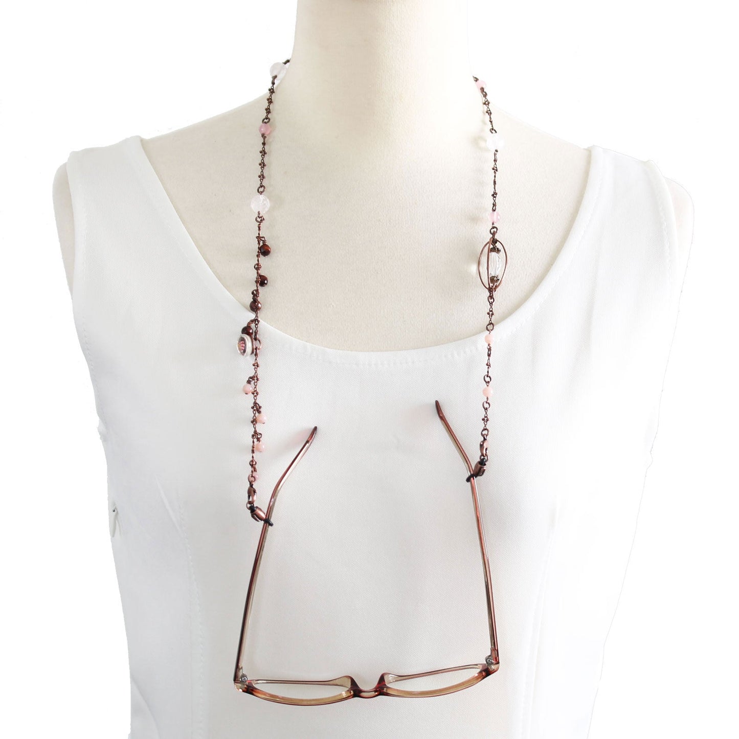 Los anteojos de sol y los anteojos para leer se ponen y se quitan con frecuencia, pero es una molestia guardarlos en un estuche y guardarlos en una bolsa cada vez que se los quita, y tiene que buscar a tientas en su bolso cuando los necesita. Muchas personas los usan en la cabeza como una capa, lo cual es genial, pero no me gusta la sensación de tirantez en mi cabeza. Solía pensar que usar una correa alrededor de mi cuello era un poco incómodo, pero cuando se trata de la incomodidad en mi cabeza vs. mi cuello, mi cabeza es más incómoda... así que durante muchos años usé una correa de gafas para "qué hacer cuando te la quitas".