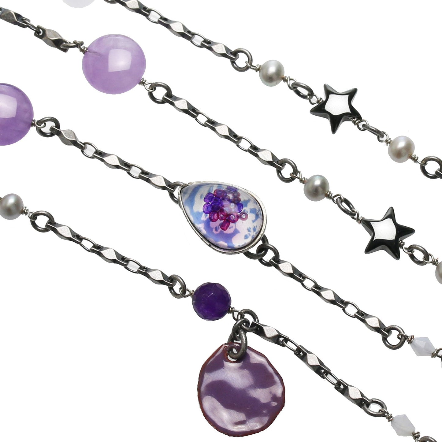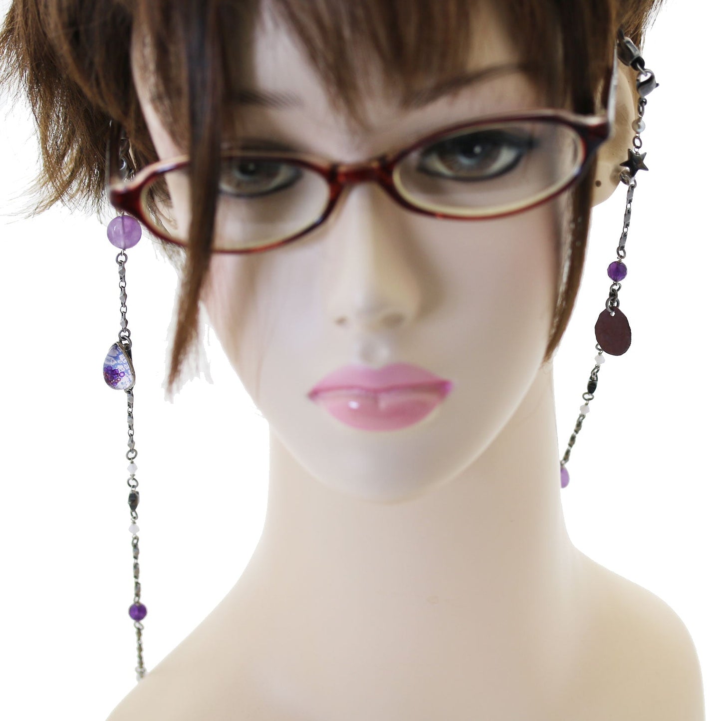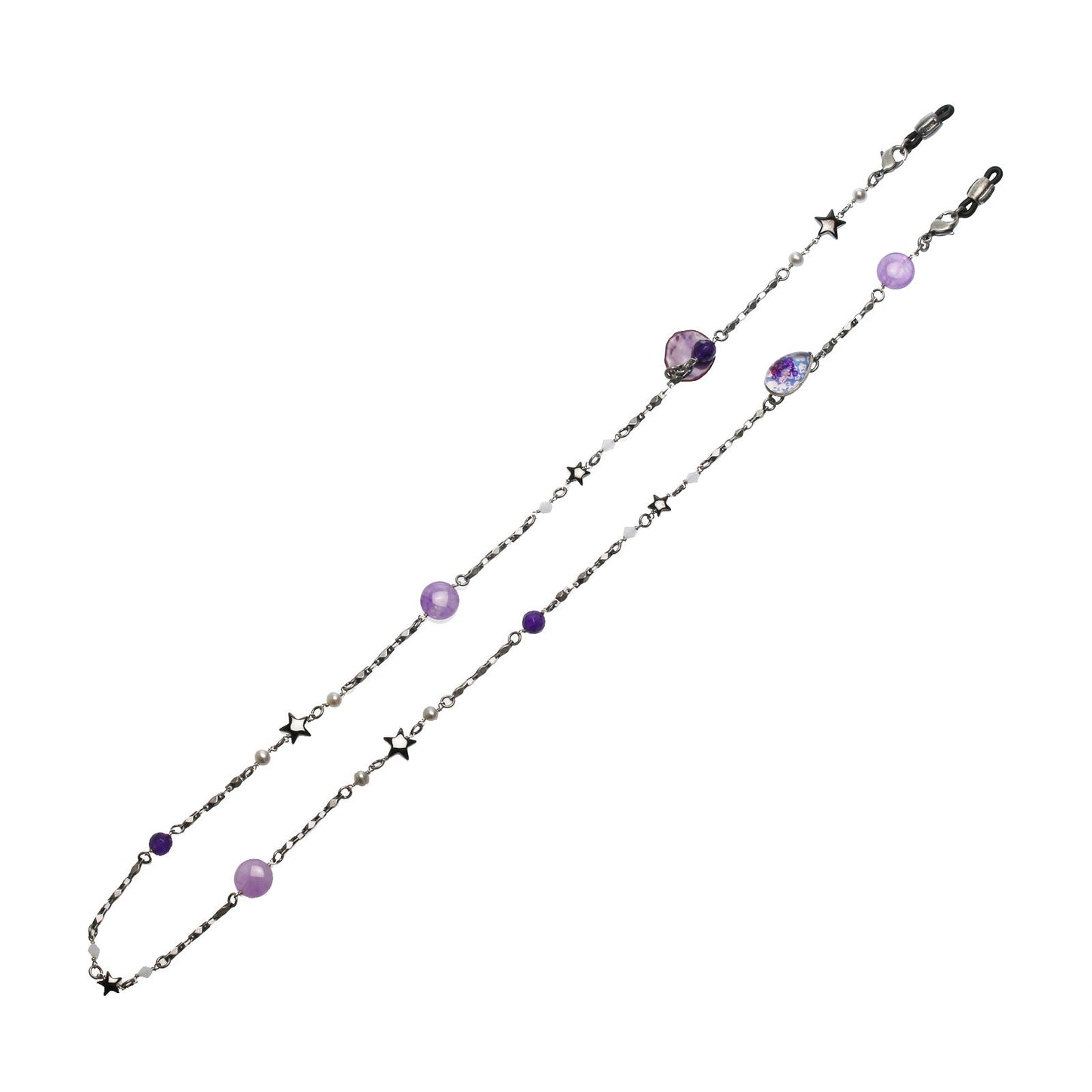 Es un collar de cadena de anteojos que utiliza partes de resina de "Plum Cake Series" (Púrpura). perla de agua dulce, amatista y encaje azul se combinaron según el color de la resina. Puedes usarlo como collar porque tiene un broche en la punta. Recomendado para el acento individual del estilo de anteojos.