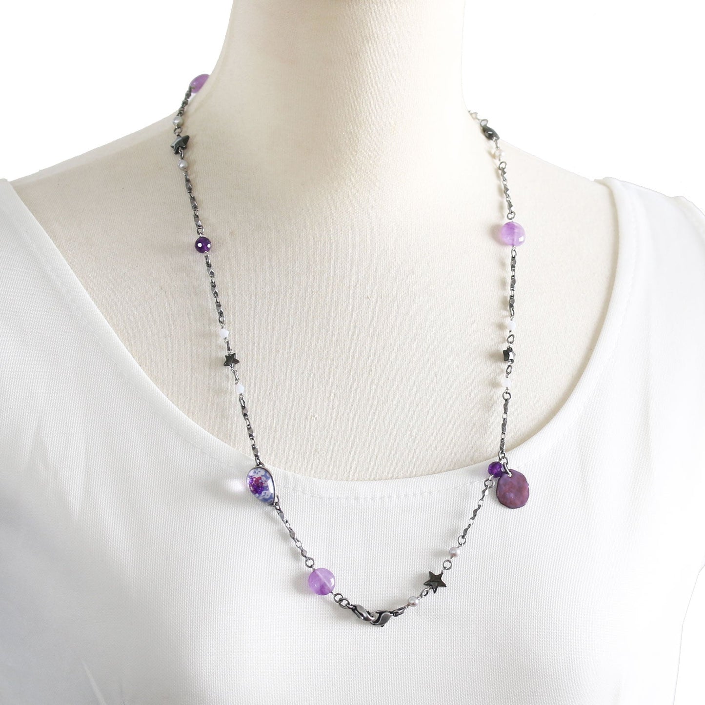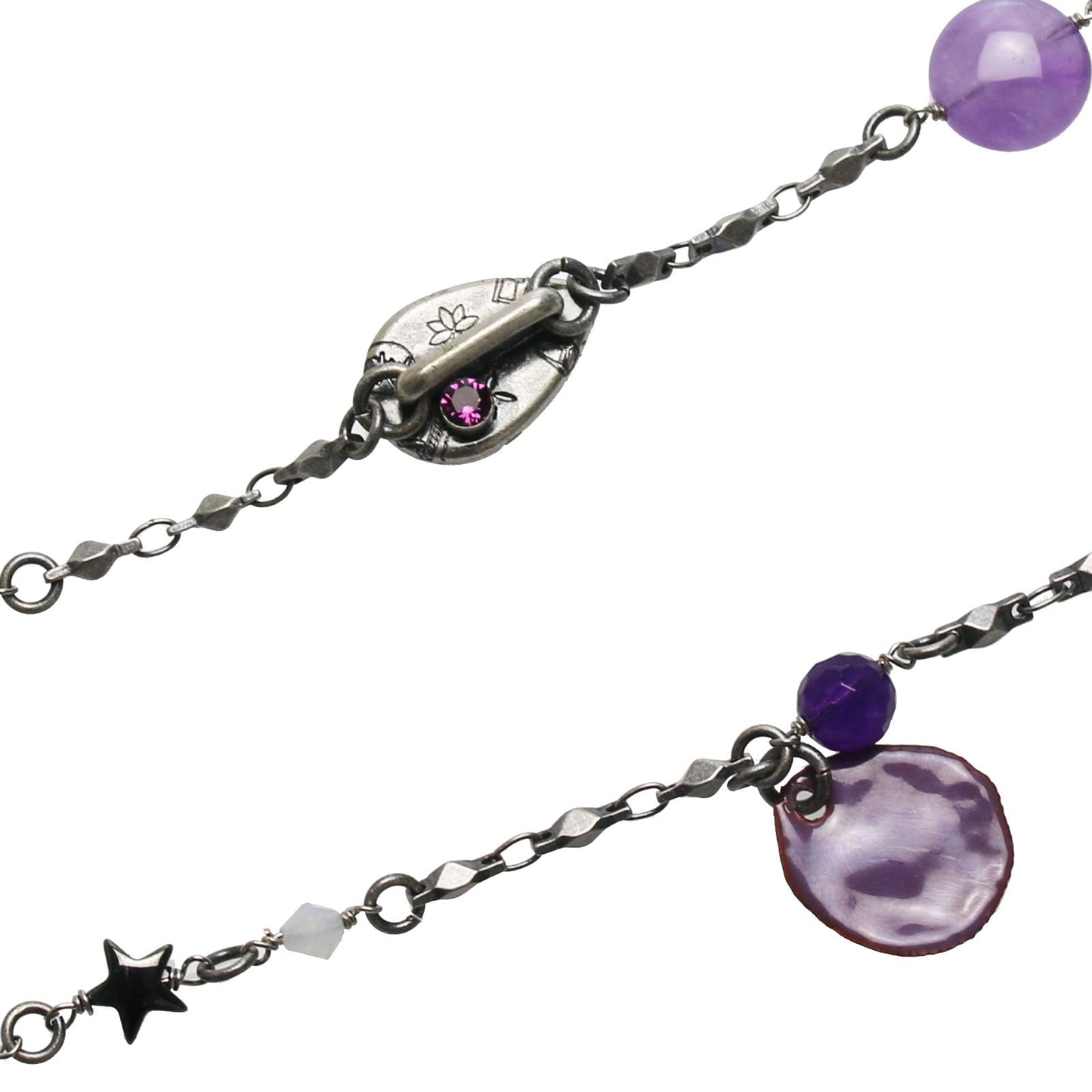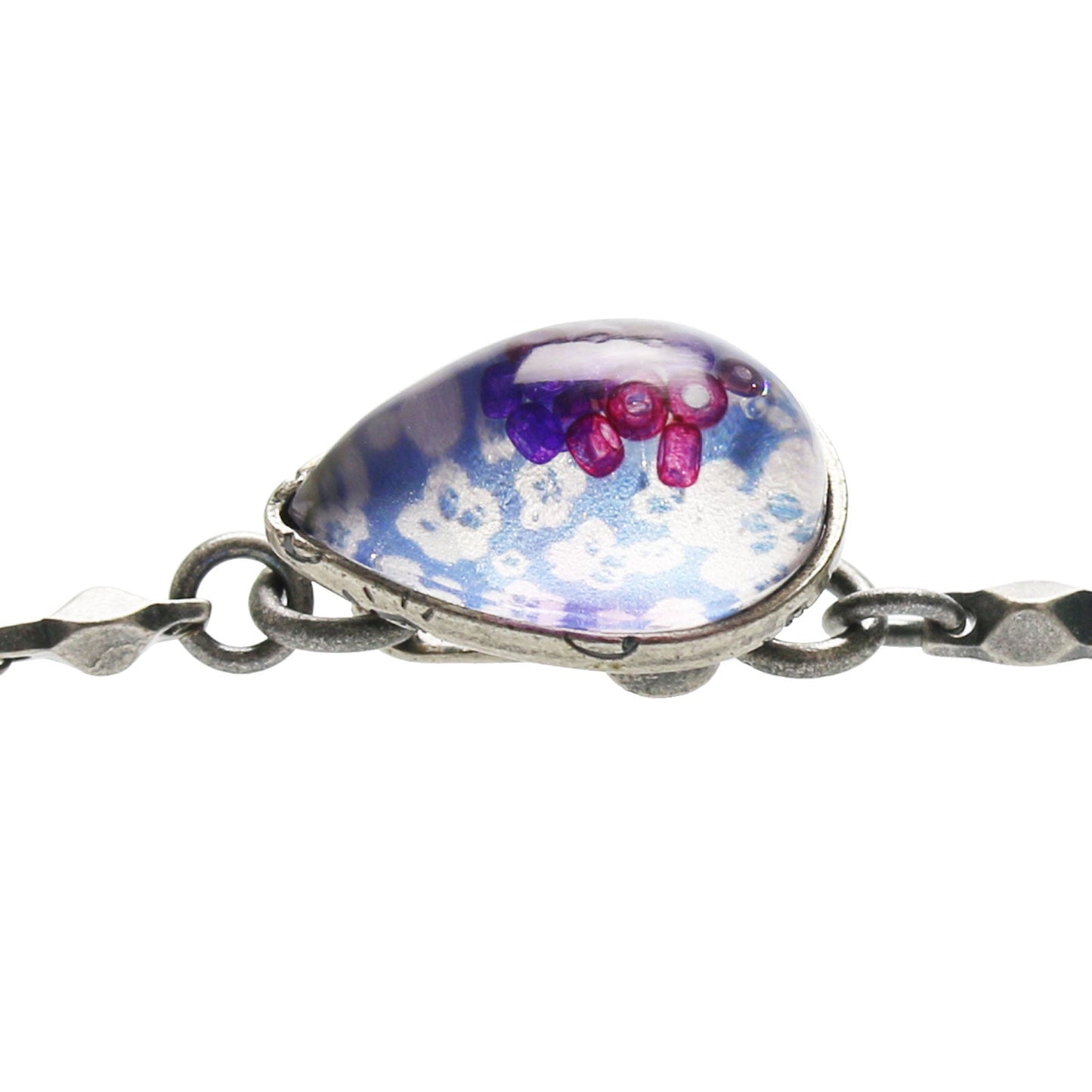 Es un collar de cadena de anteojos que utiliza partes de resina de "Plum Cake Series" (Púrpura). perla de agua dulce, amatista y encaje azul se combinaron según el color de la resina. Puedes usarlo como collar porque tiene un broche en la punta. Recomendado para el acento individual del estilo de anteojos.