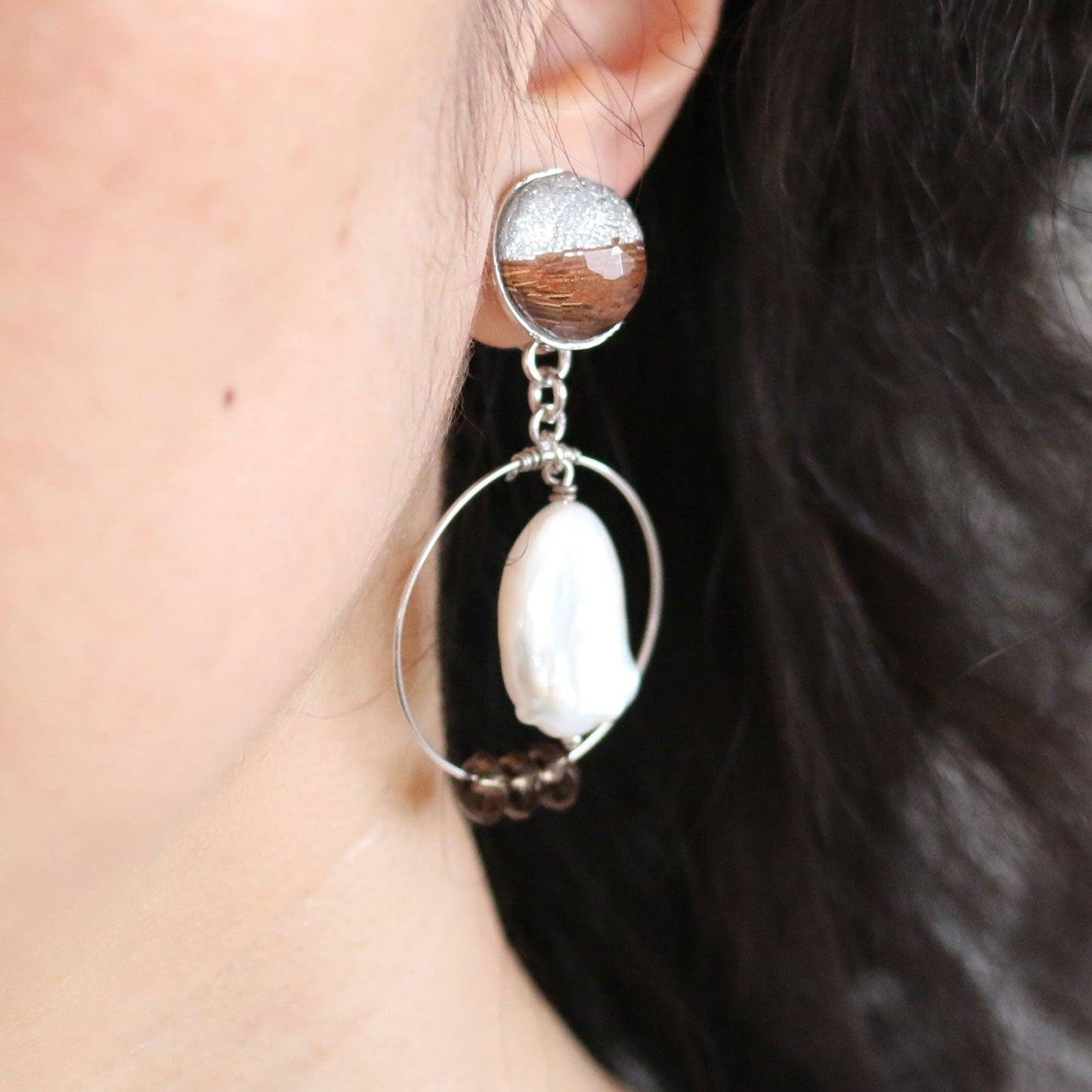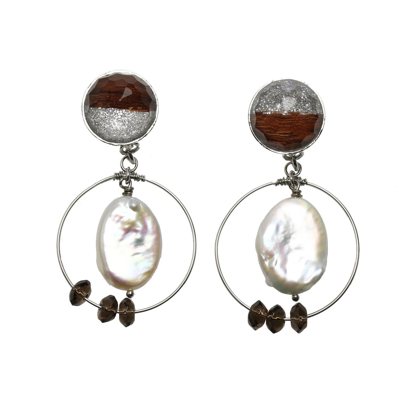 This hoop earrings using the "Wood & Lame Series" of resin parts. To match the hue of the resin was a combination of freshwater pearl and smoky quartz. It is a big size, but is easy to coordinate Because the chic shades. Also fit for everyday use in the party scene.