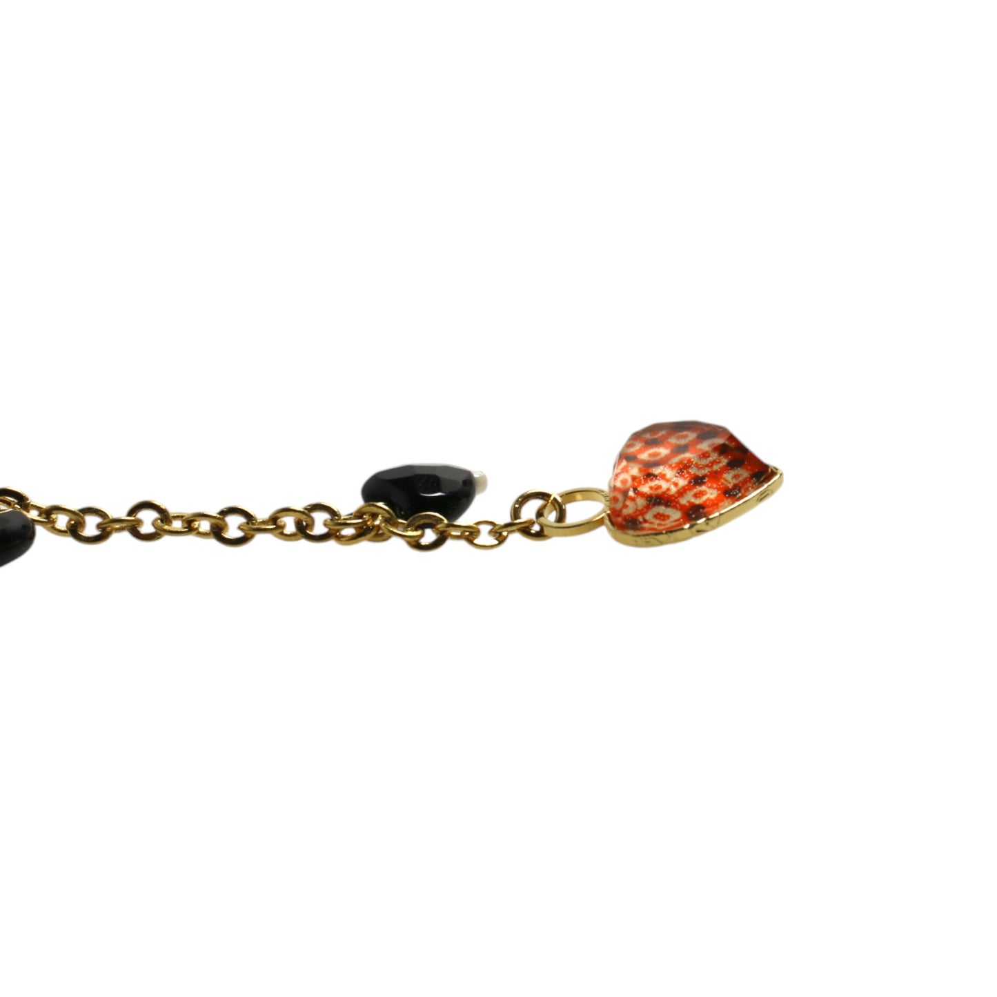 This bag charm is made of resin parts with a fawn pattern. The contrast between orange and black is a unique combination. The heart-shaped onyx shakes as you walk. It is perfect as a strap or key chain, or as a small accent. This accessory is recommended as a gift.