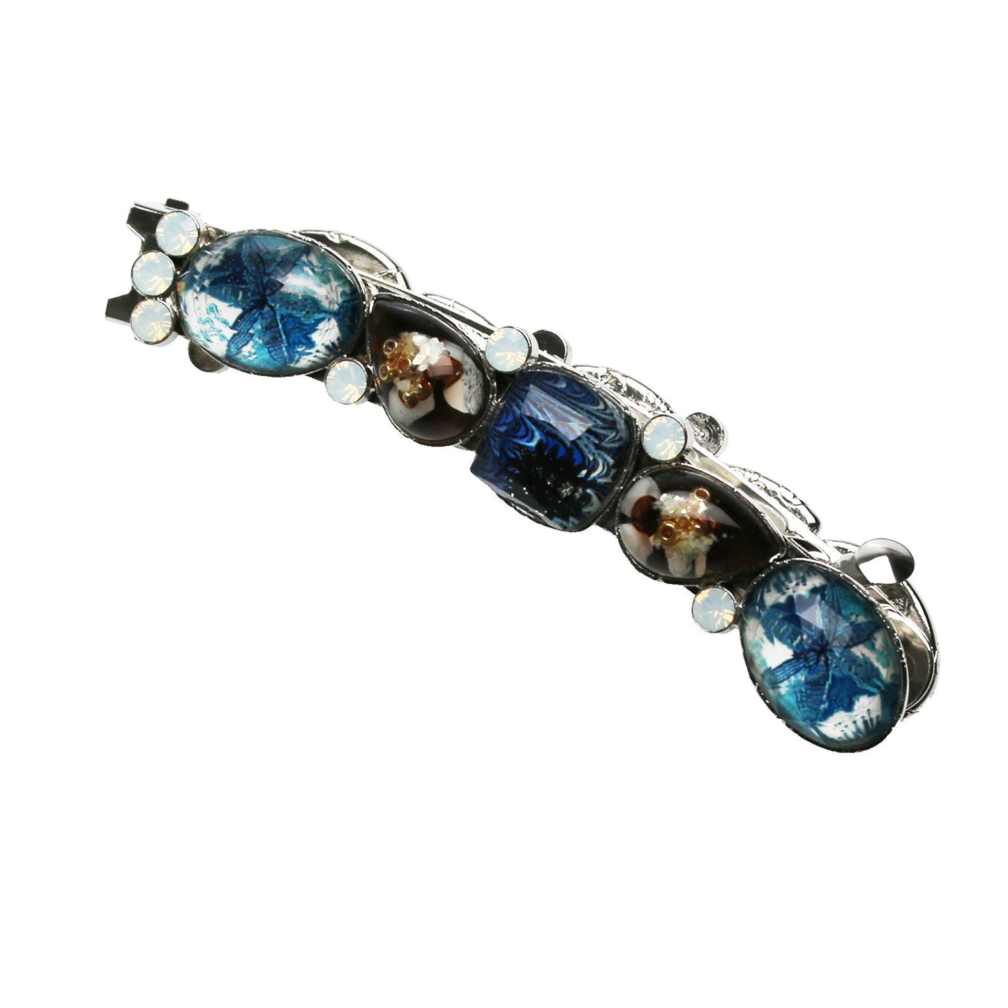 This barrette using the resin parts of the "Marble Series", "Lily Series (Blue)," "Chocolate" Series. With a combination of blue and chocolate color, shine to the hair. It is recommended to fashionable accent of hair style.