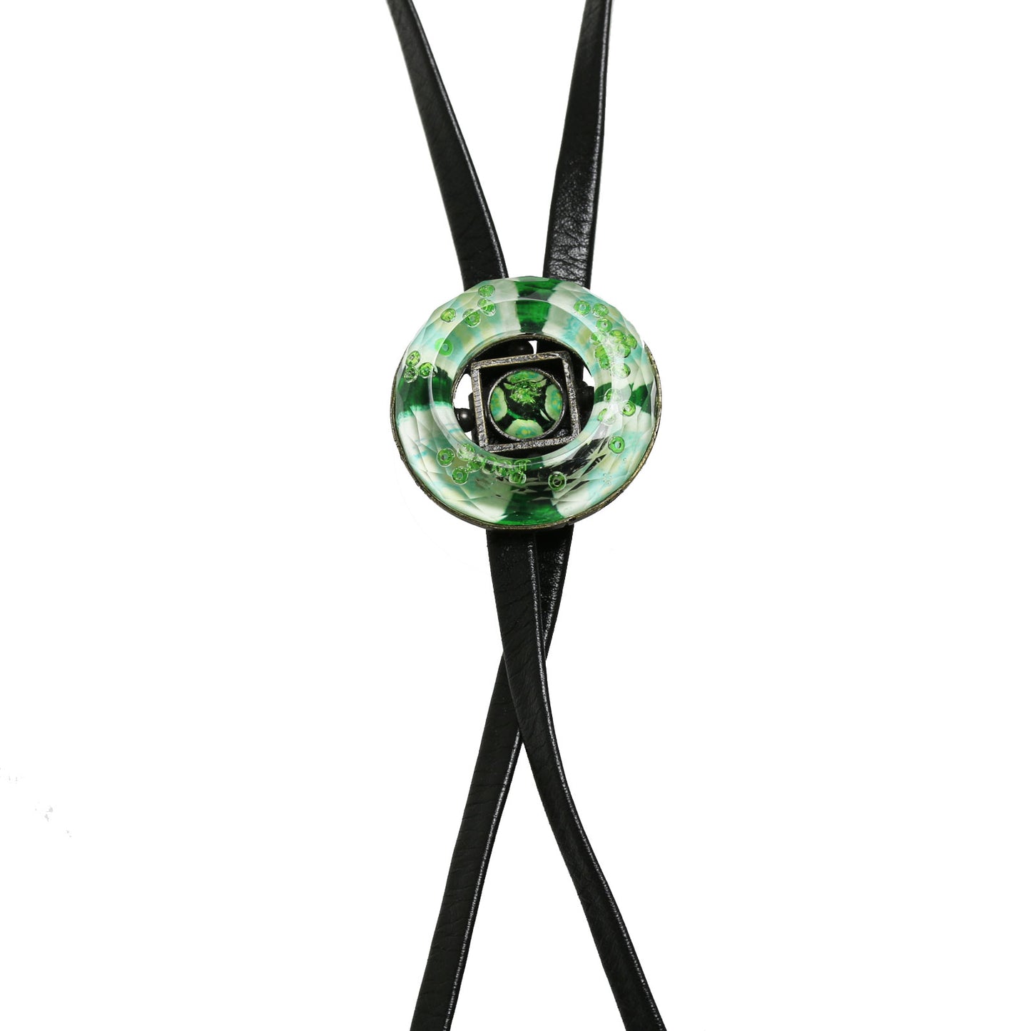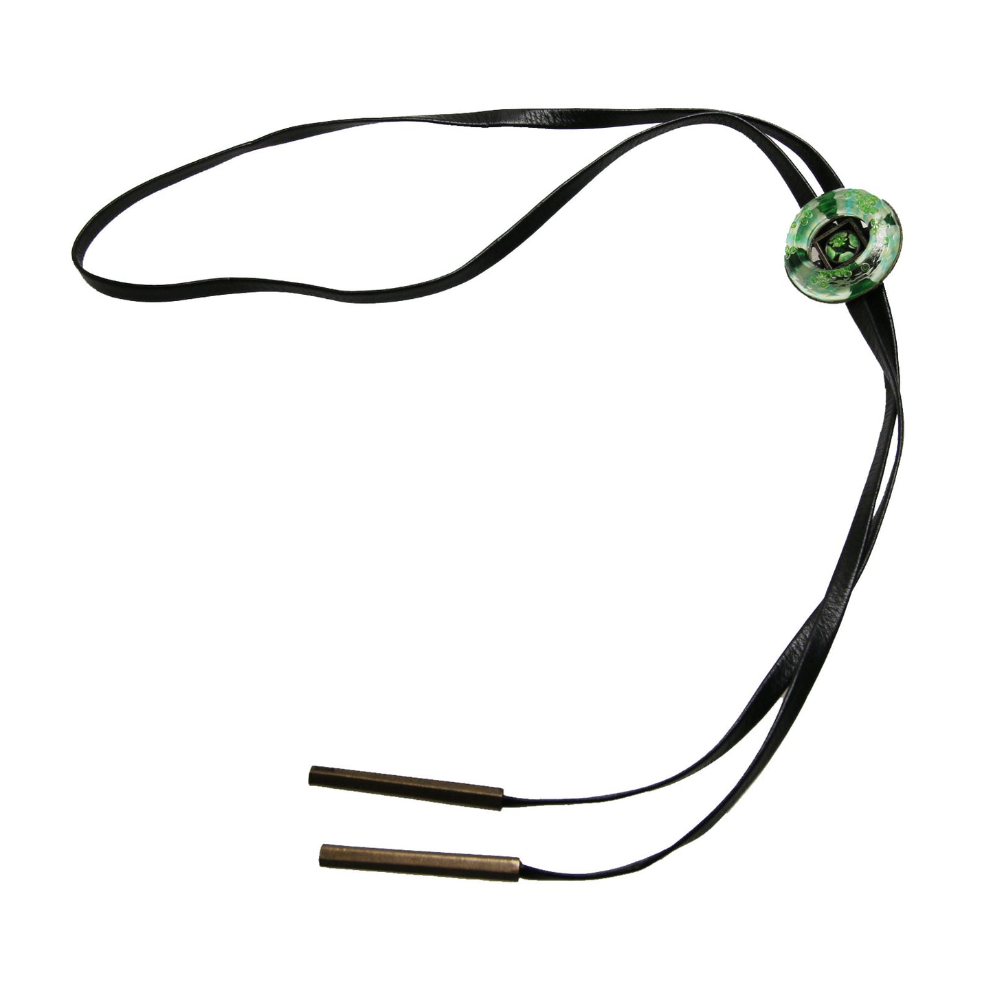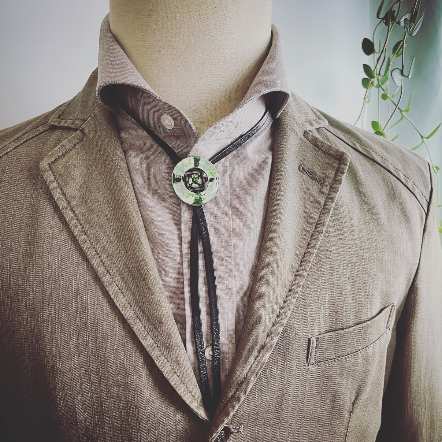 It is a bolo tie using the resin parts from the "Watermelon Series" (Green). The transparency and green gradation is beautiful. It is feature that the flat leather cord crosses when worn due to its structure. The main part can move and suit your favorite position on neck. It is designed for both men and women.