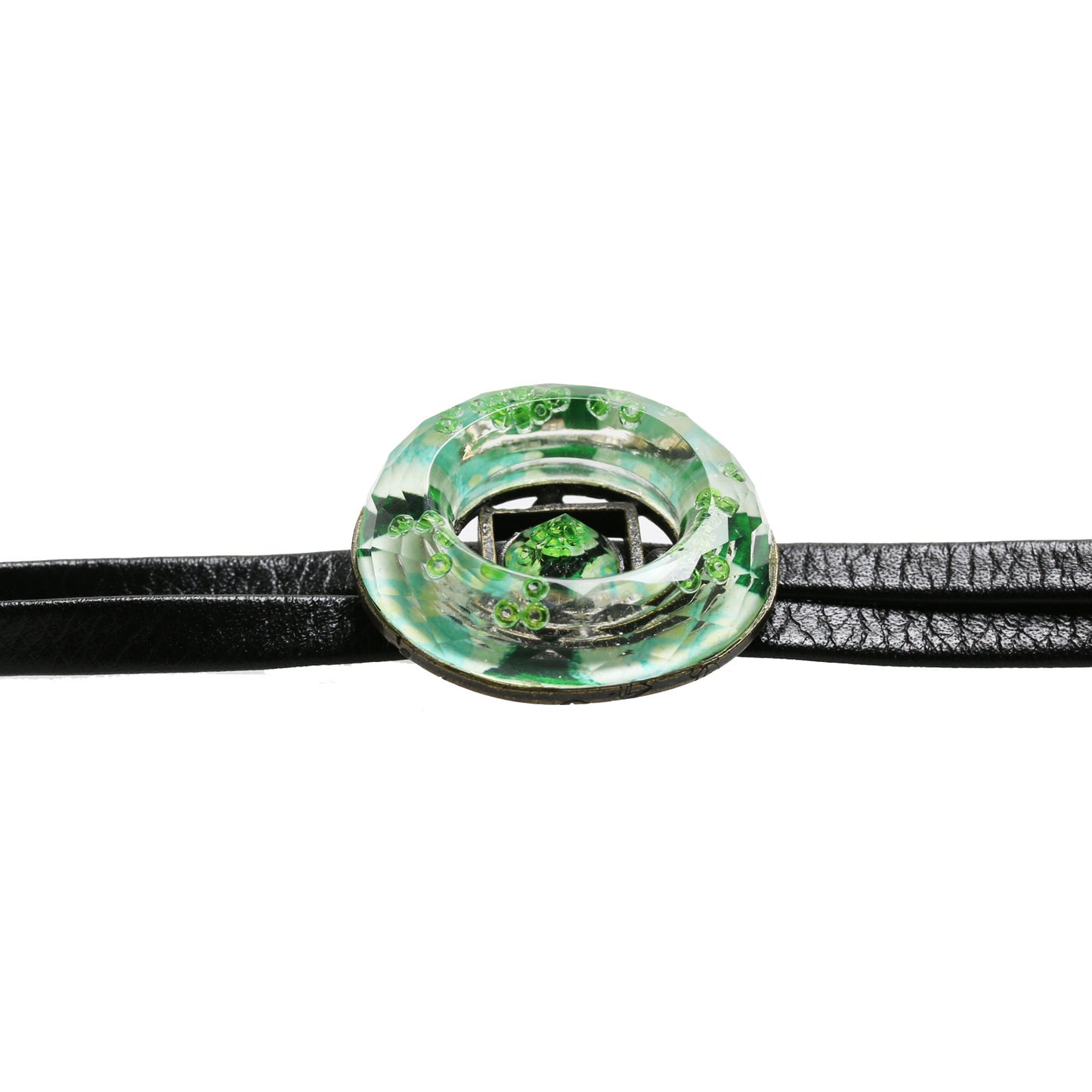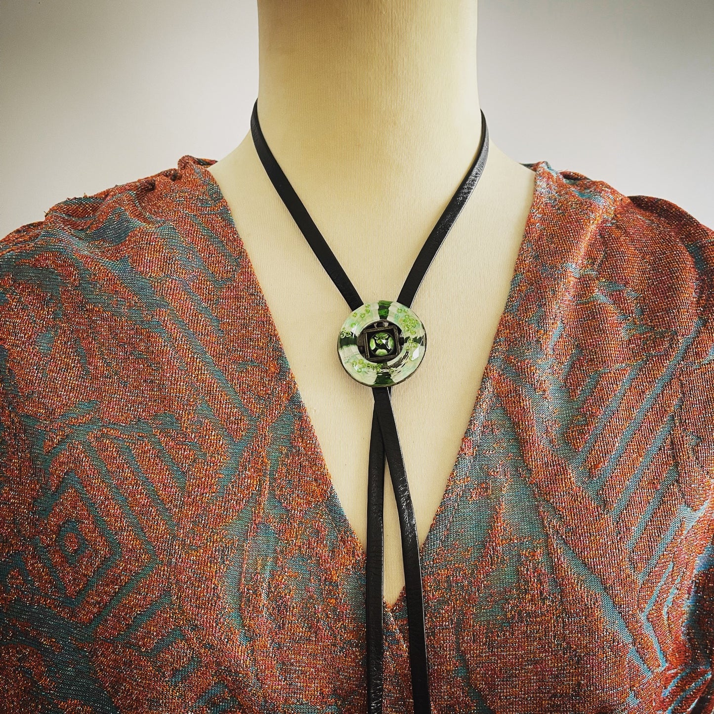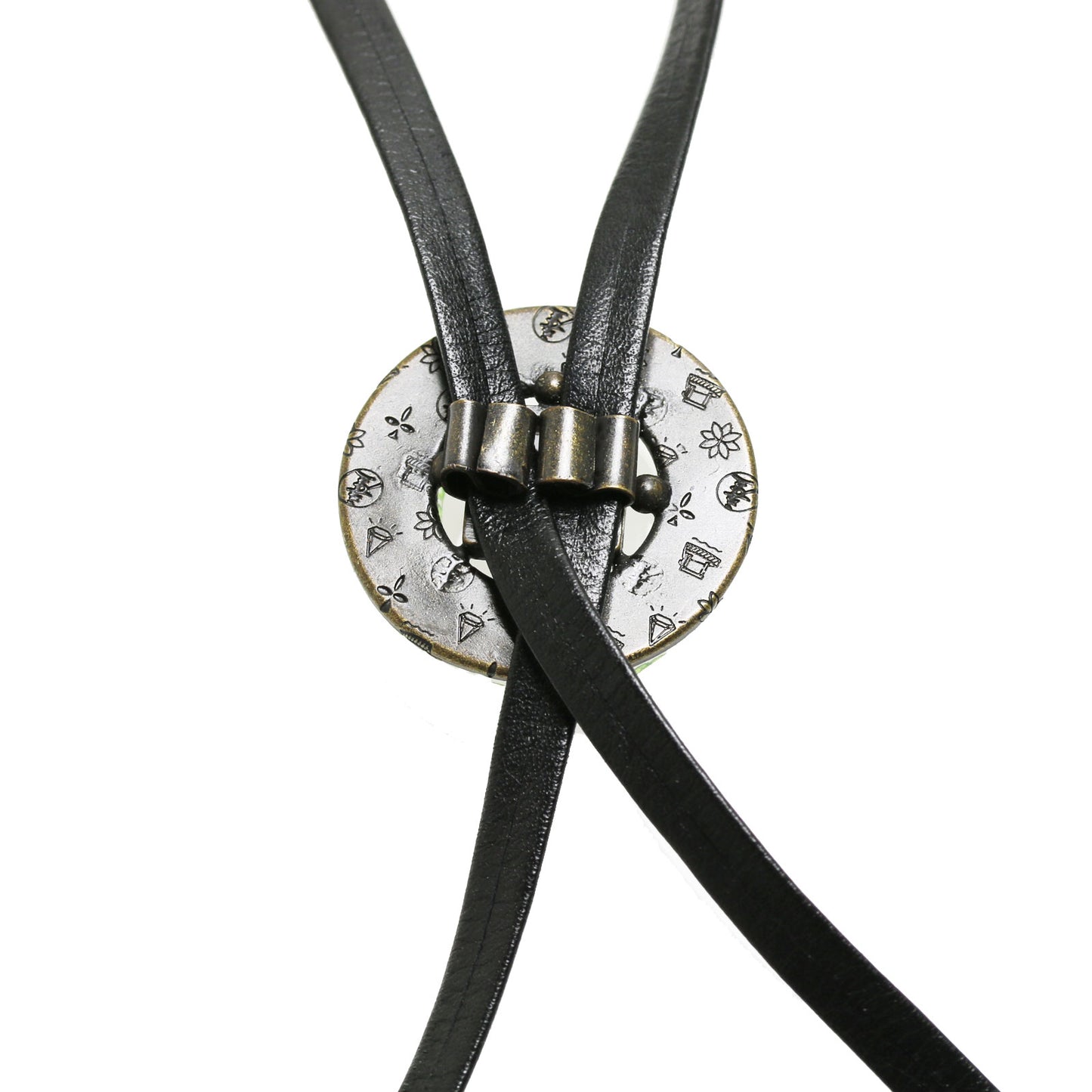 It is a bolo tie using the resin parts from the "Watermelon Series" (Green). The transparency and green gradation is beautiful. It is feature that the flat leather cord crosses when worn due to its structure. The main part can move and suit your favorite position on neck. It is designed for both men and women.
