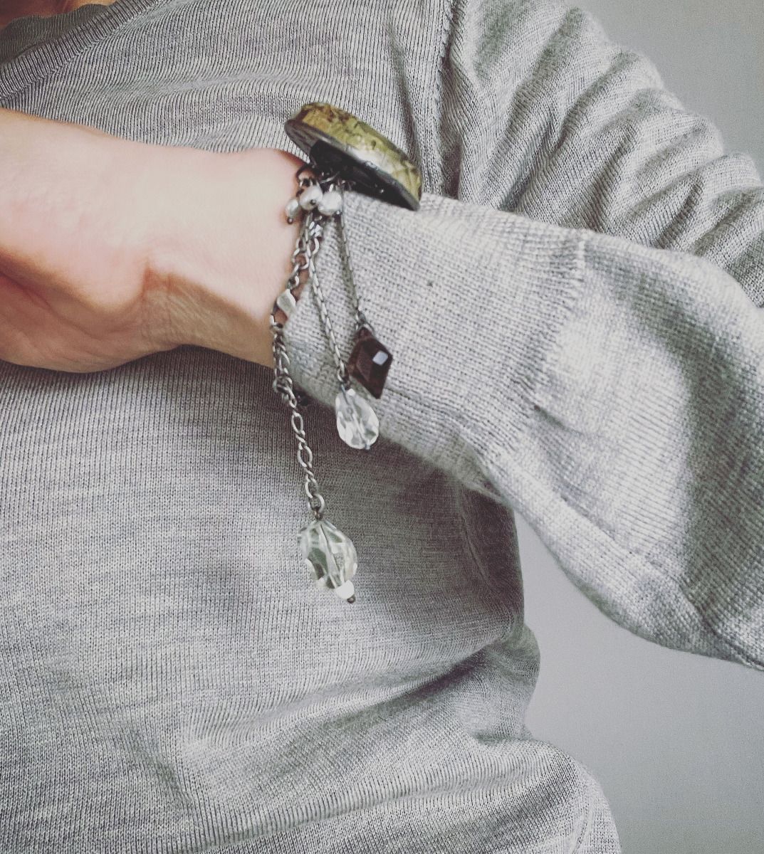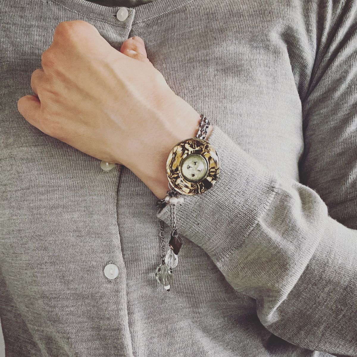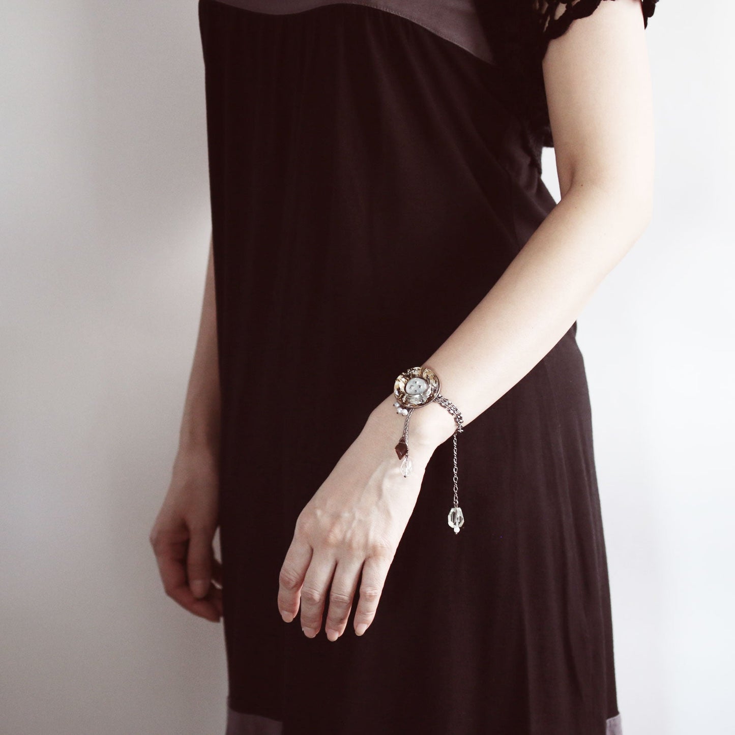 It is a bracelet using resin parts of "Dandy Series" and "Backyard Series". Amethyst, crystal, smoky quartz and freshwater pearl were combined according to the color of the resin. It draws an eye with chic hues and unique design.