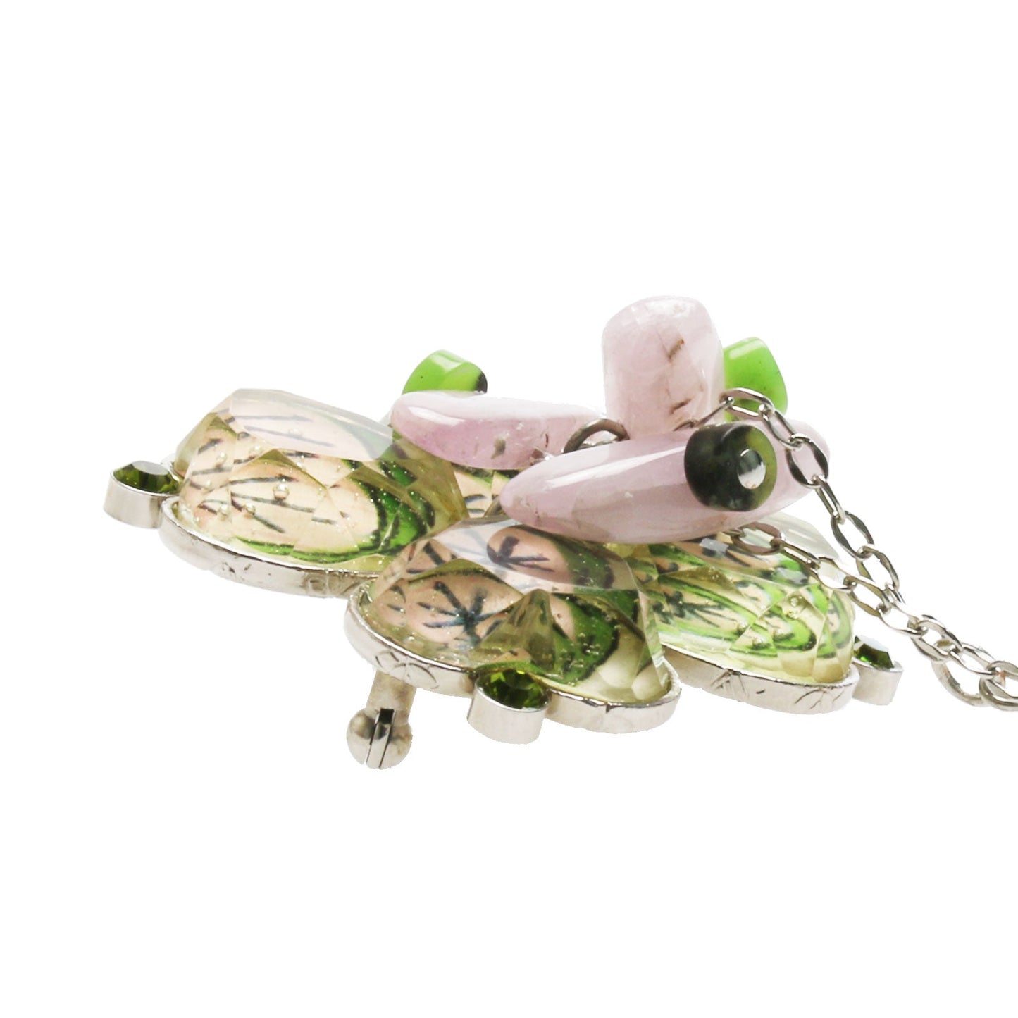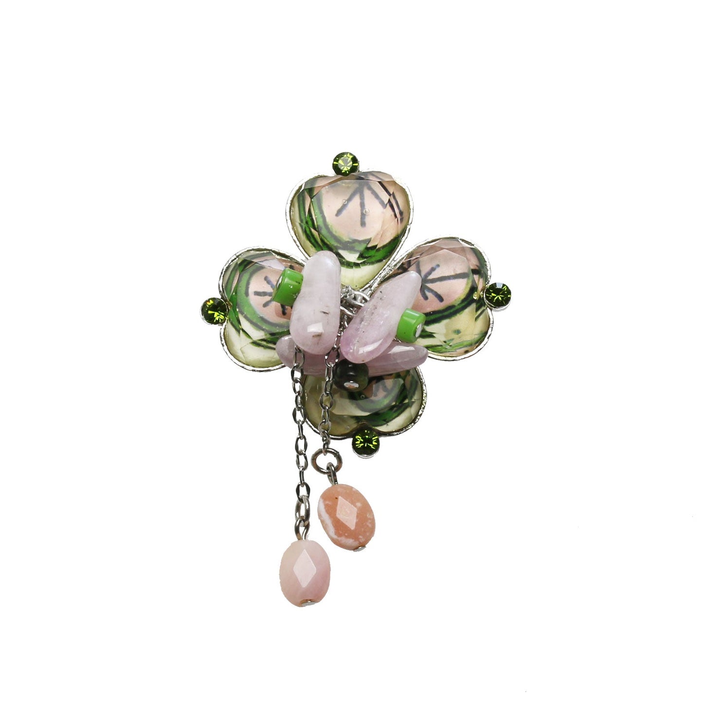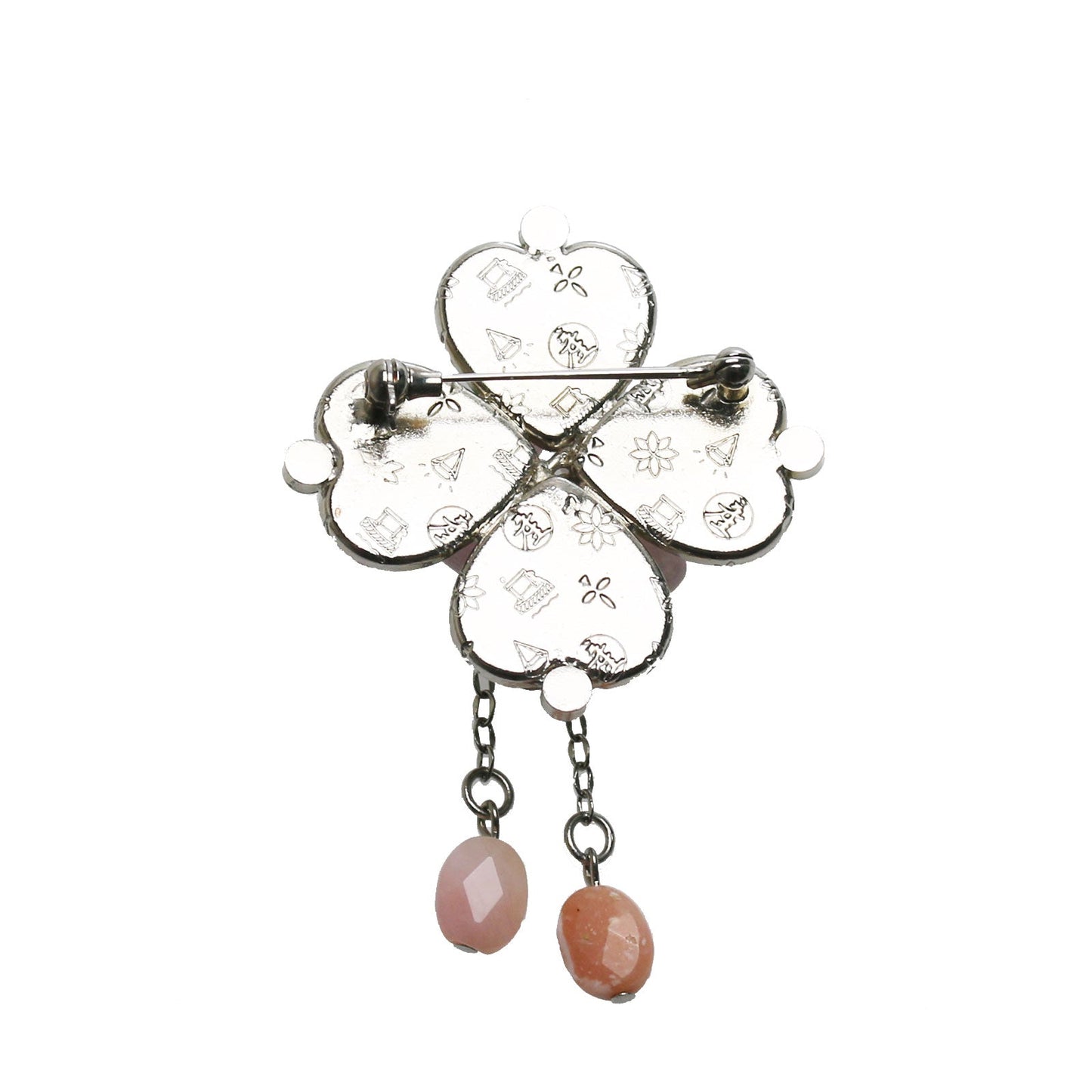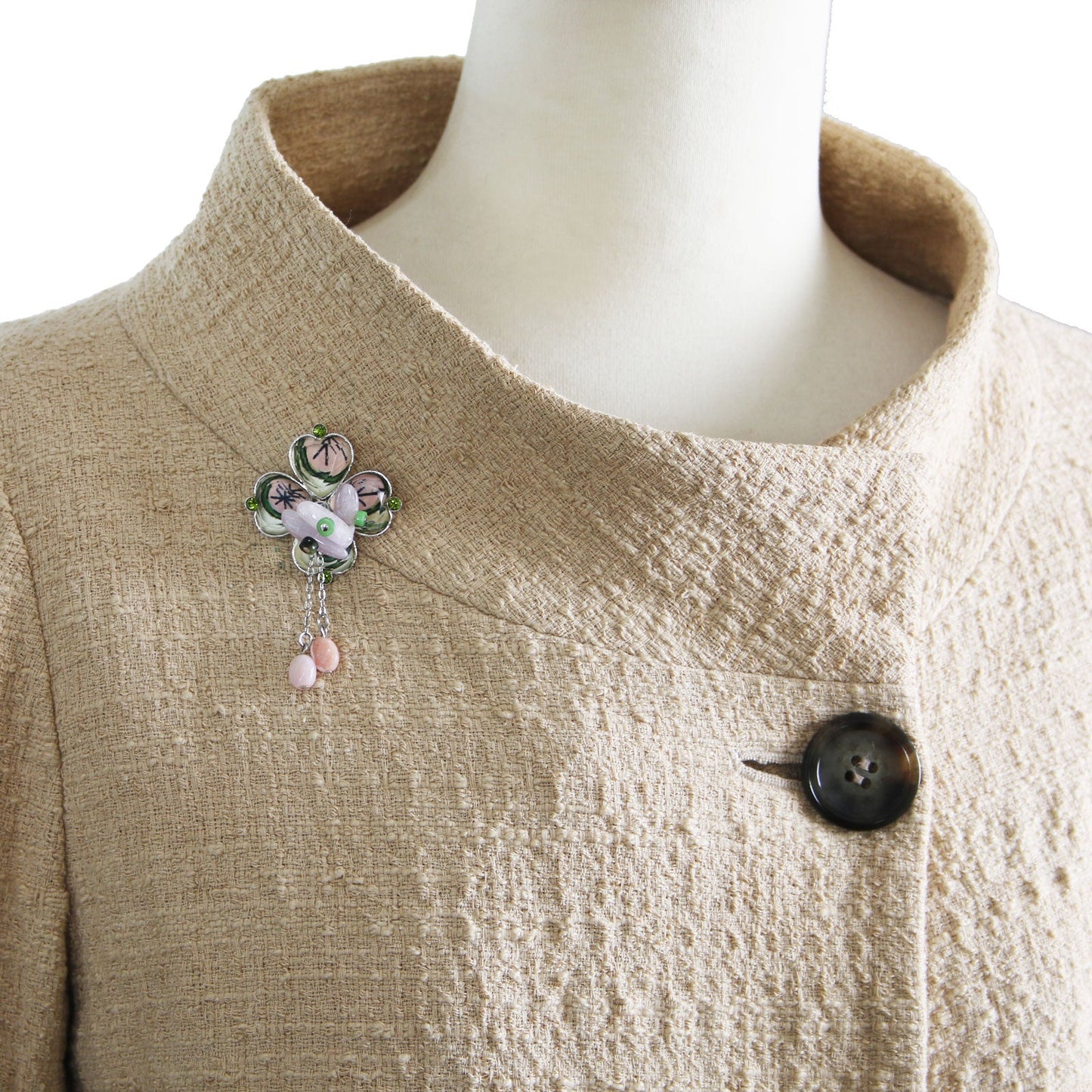 It is a four-leaf brooch using the resin parts from the "Lemon Series" (Pink). The resin parts and the metal are all handmade. The kunzite, chrysoprase, and pink opal are combined to match the color of the resin parts. It is cute and shakes when you walk. This luxurious brooch is a must-have style staple.