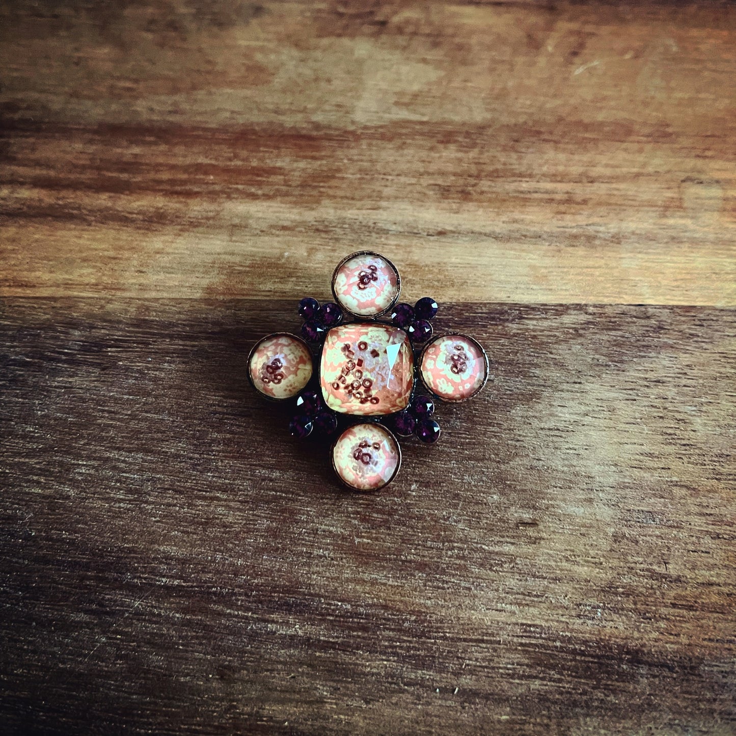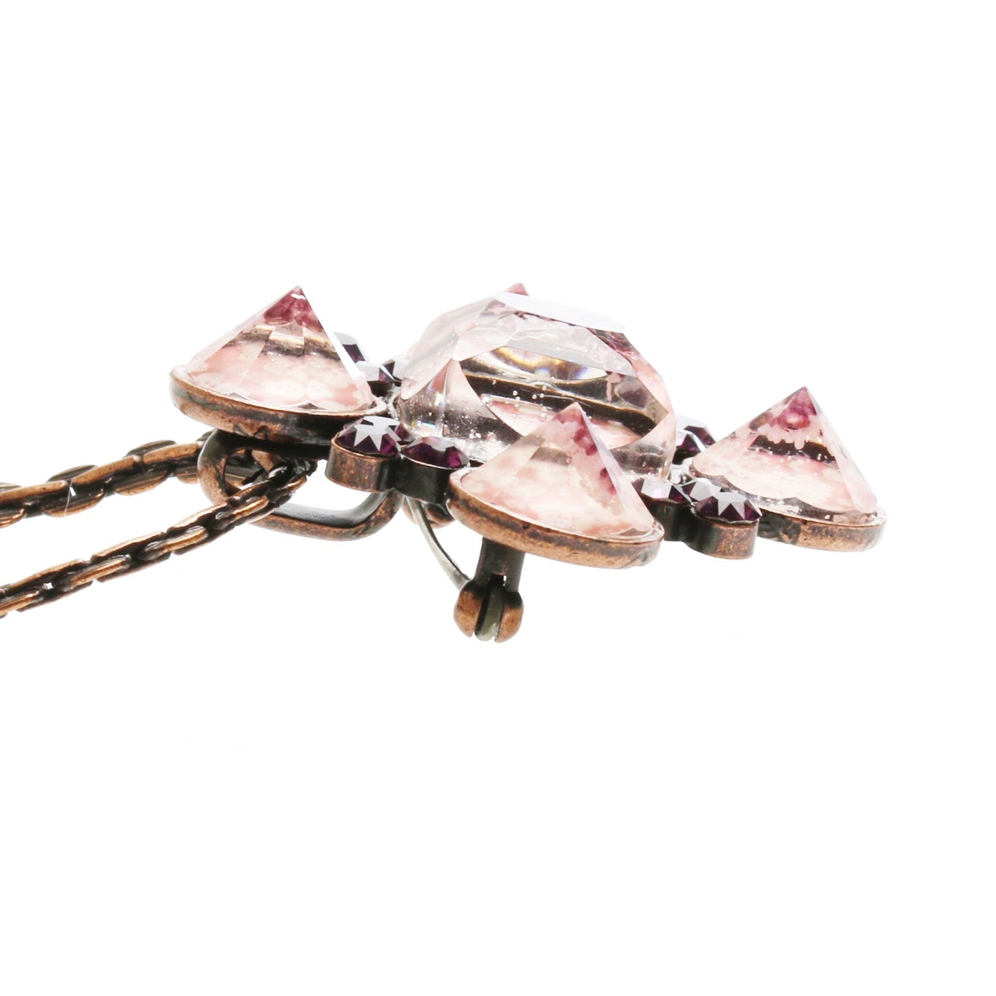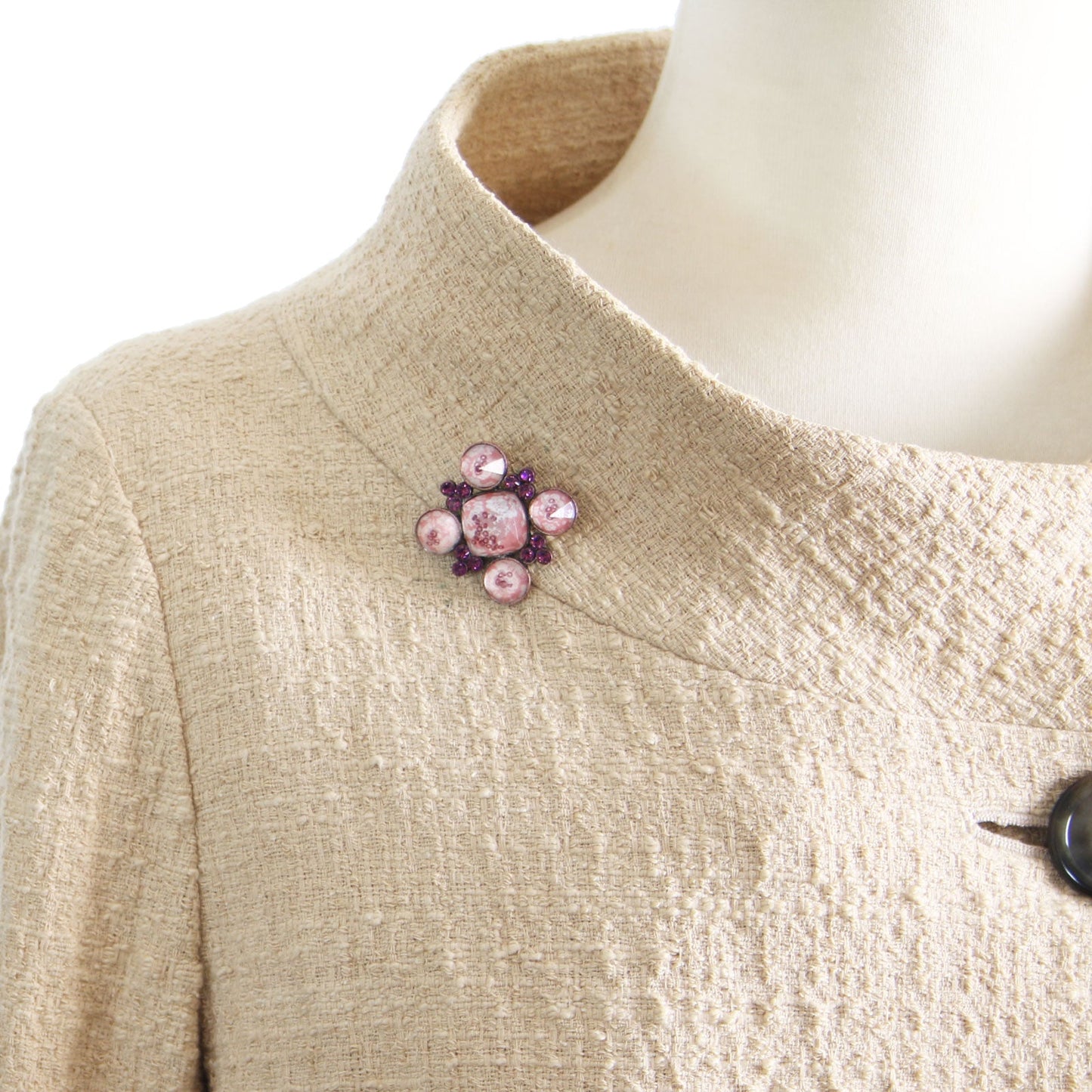 It is a brooch necklace using resin parts of "Plum Cake Series" (Pink). Pink and purple rhinestones of resin are stylish designs that attract the eye. It is a 2-way type which also becomes a brooch by removing a chain. Resin parts and metal parts are handmade.