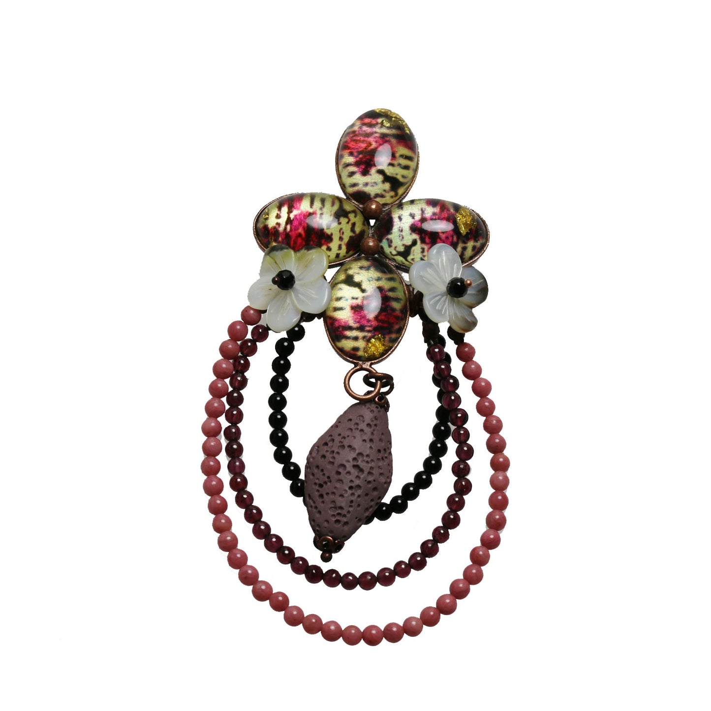 It is a stunning brooch using the resin part from the "Dinosaur Series" (Purple). Garnets, rhodonite, and onyx are arranged in a row. Overall, it has featured with a gradation of the purplish-red color, which is elegant. Its transparent presence is not too flashy. It is fresh and unique jewelry which has a volume like a corsage.