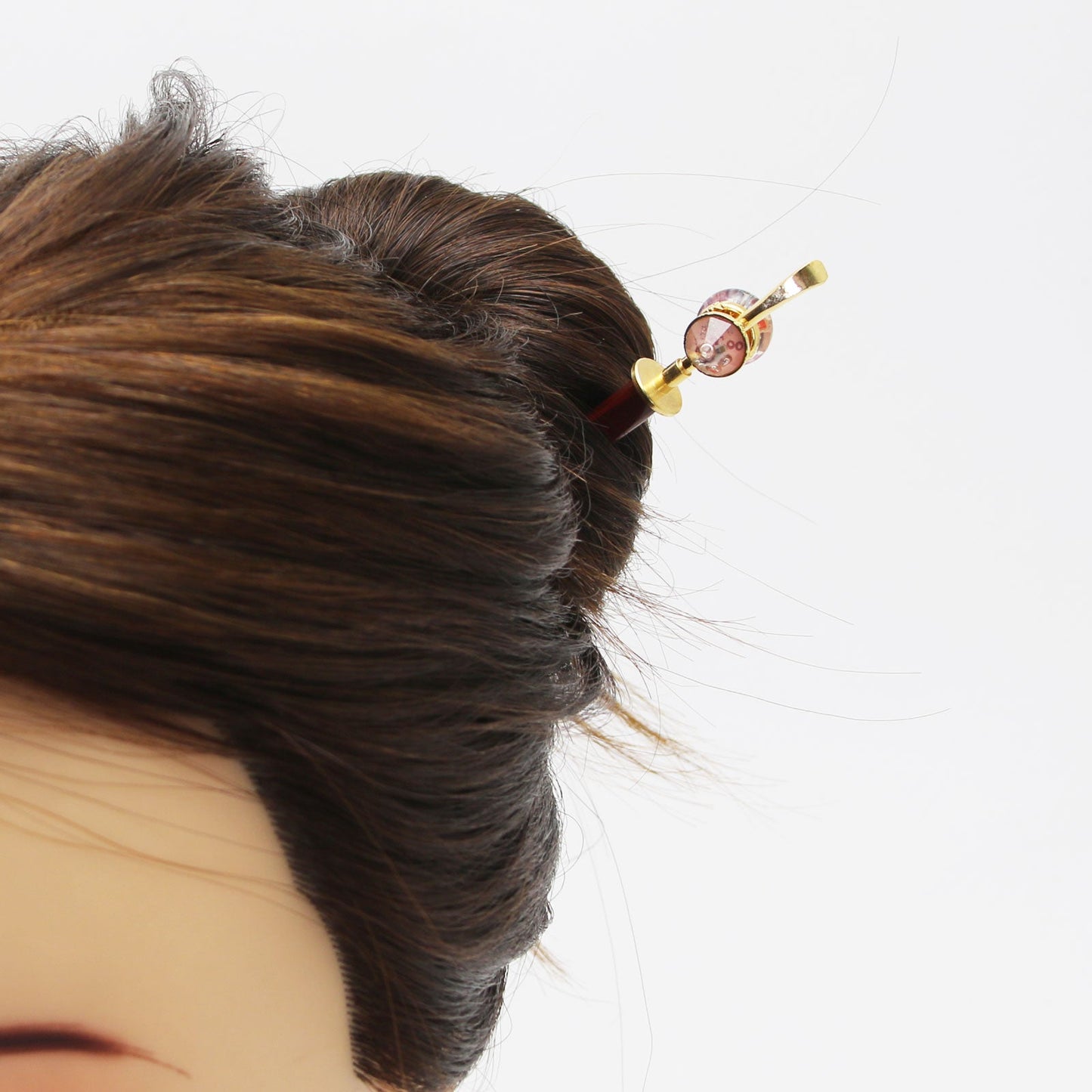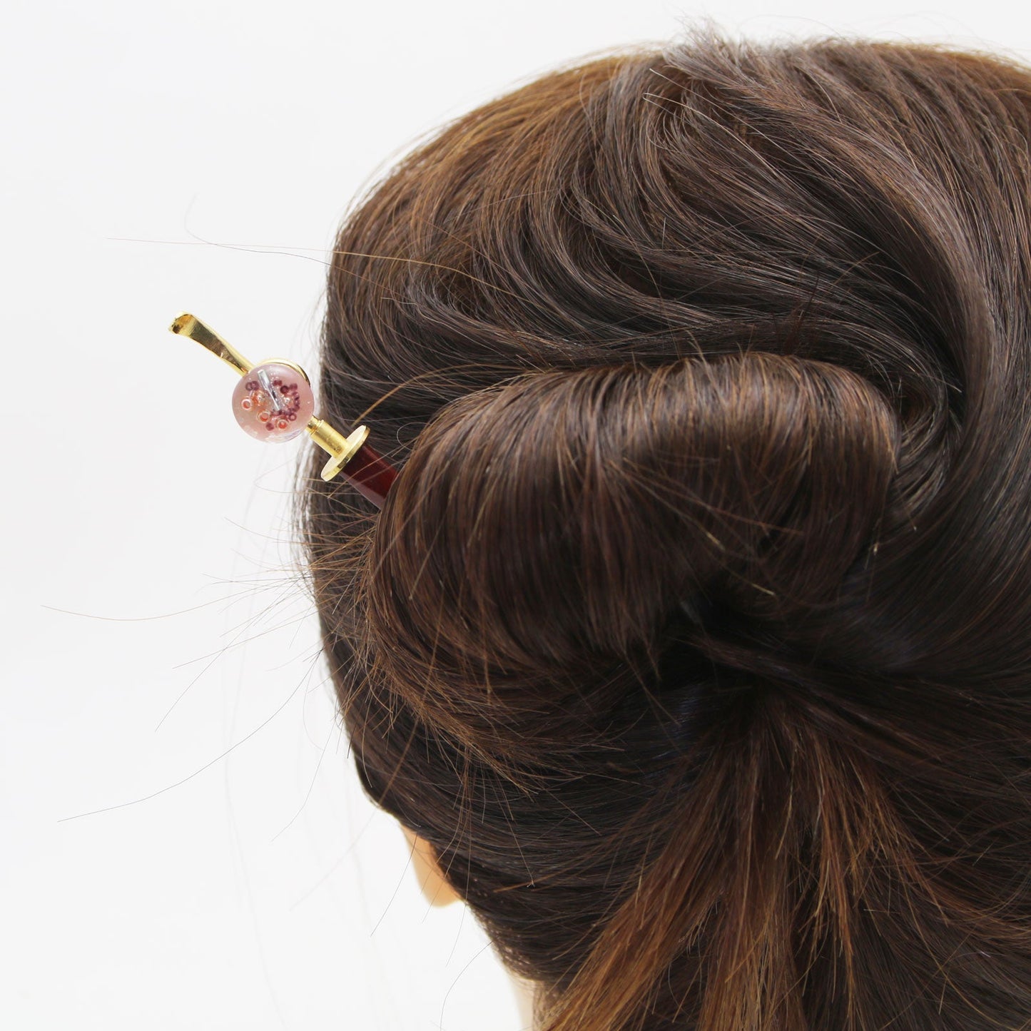 Wooden hairpin using the resin parts of the "Jewel Box Series" (Pink). Cute shades and shapes shine on your hair. The decorative part can be removed. It is an epoch-making pinning which can divide the head-part and head parts. It is one press punching of our shop registered as a utility model product. You can change the mood to change the head and enjoy it.