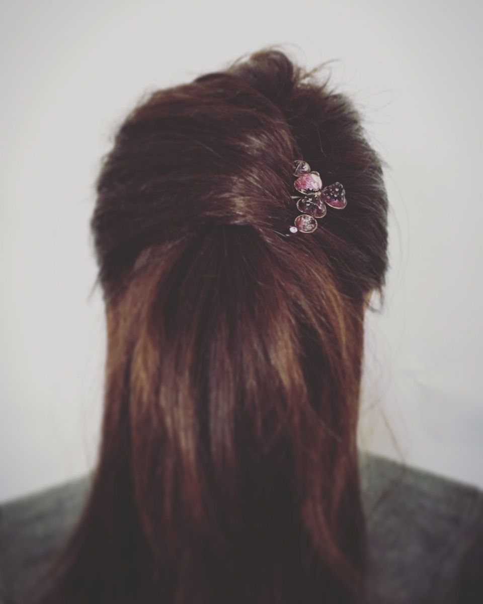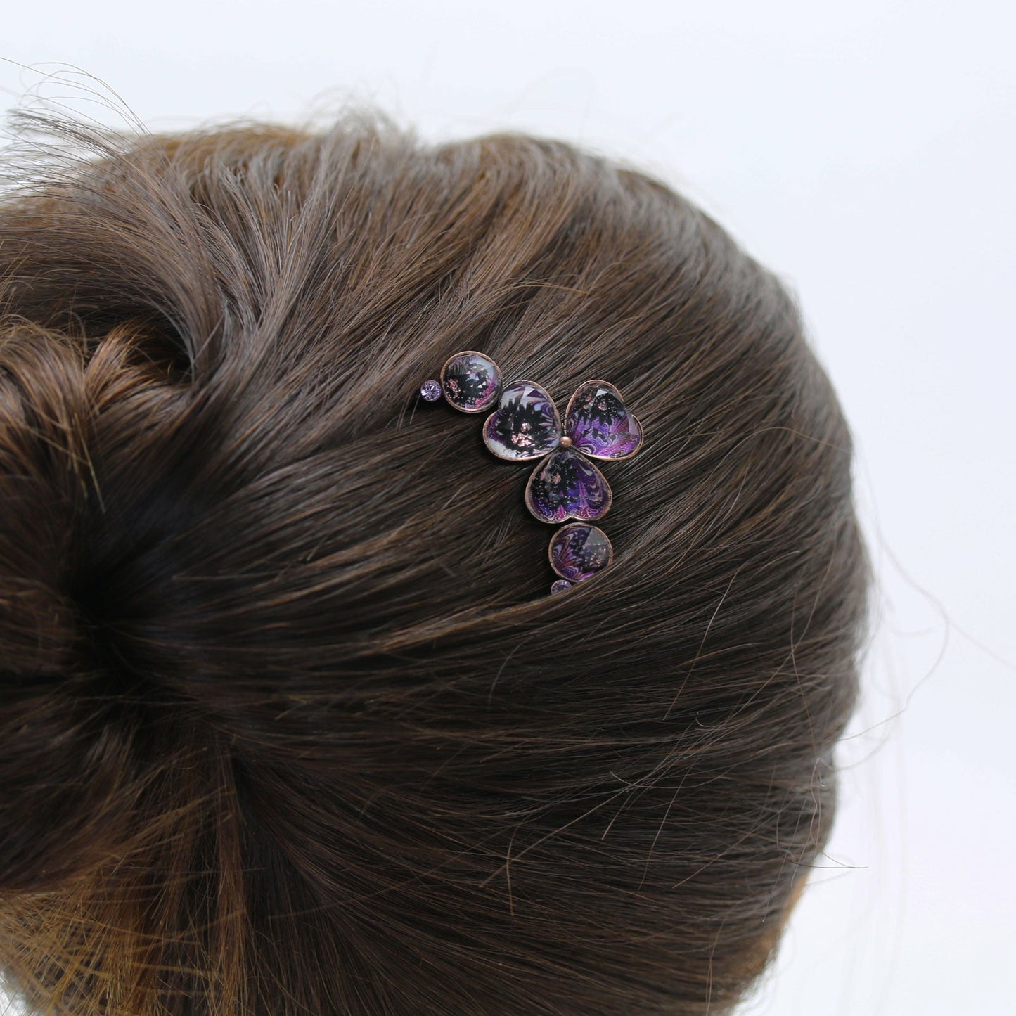 It is a unique flower hair comb using the resin part from the "Marble Series" (Purple). Enjoy the purple marble pattern and the transparency. You can wear it in a small bun or half-up style. Take your style from being attractive to sophisticated with this chic hair comb. It is recommended for daily use or any occasion.