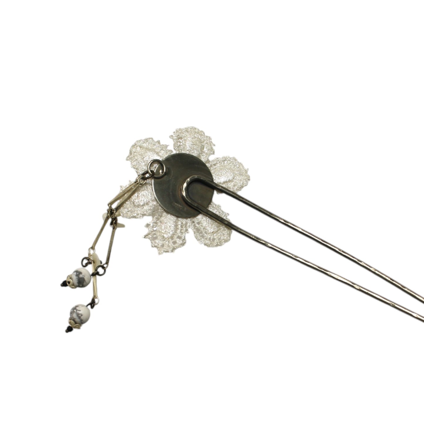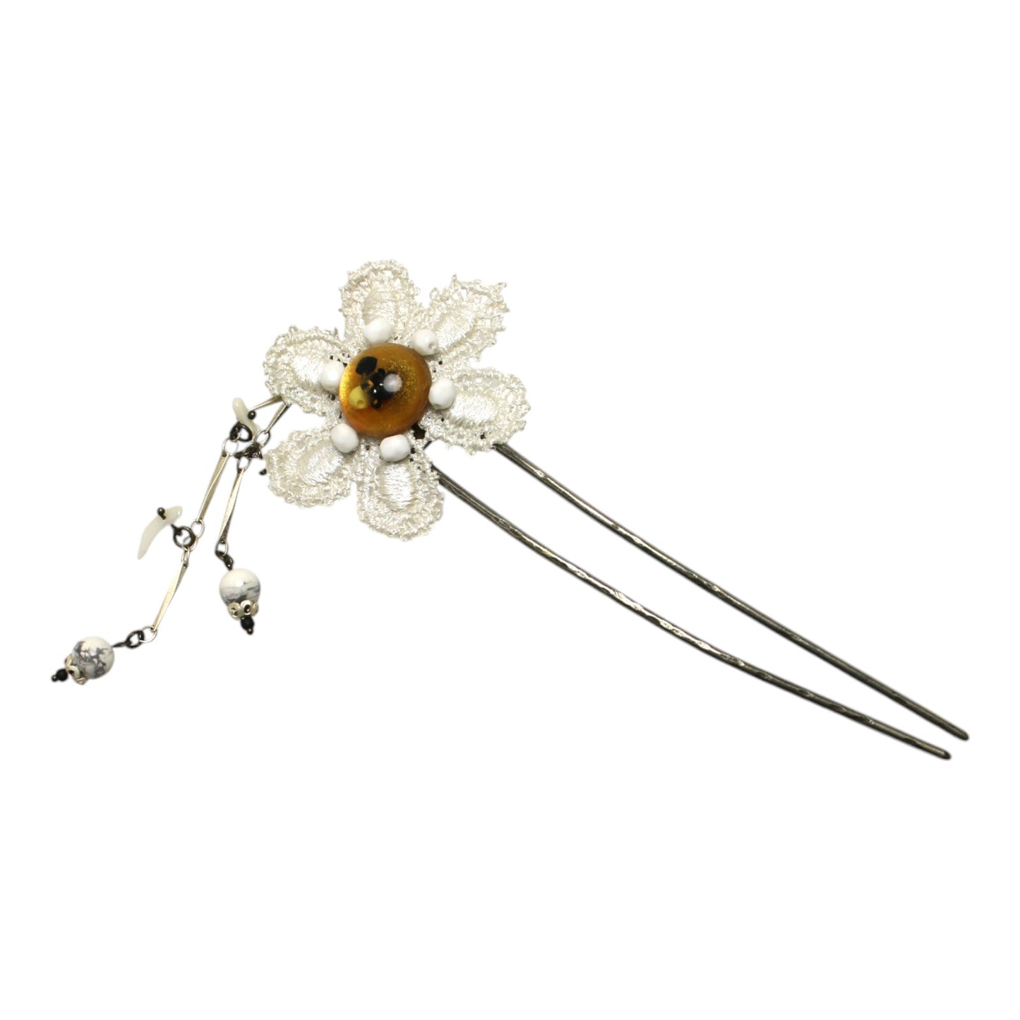It is a two-prong hairpin using the resin part from the "Sesame & Salt Series." The white lace flowers are light and airy. The chain and howlite sway beautifully with every step. You can enjoy hair arrangements from everyday use to Japanese clothing. This hair accessory is also recommended as a gift.