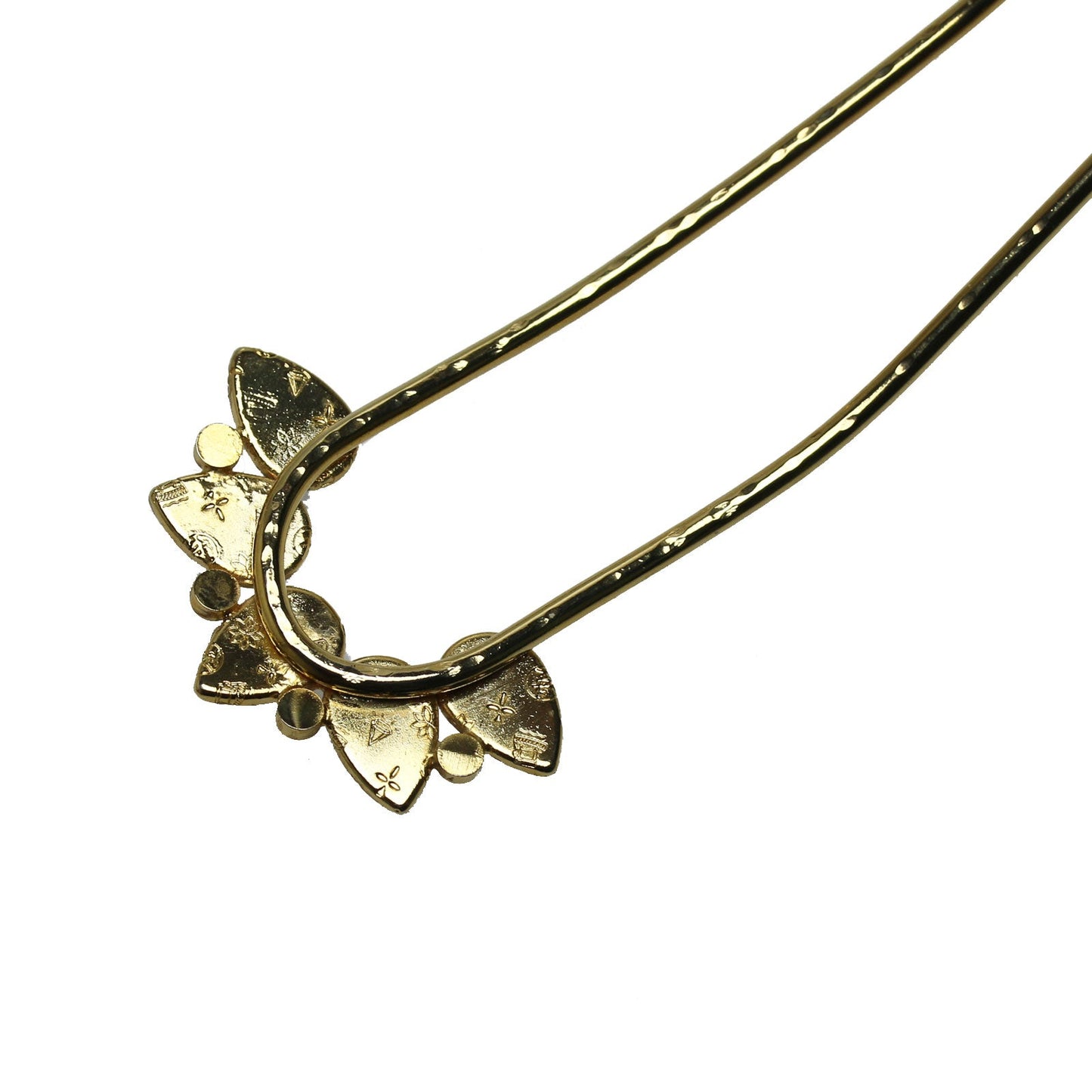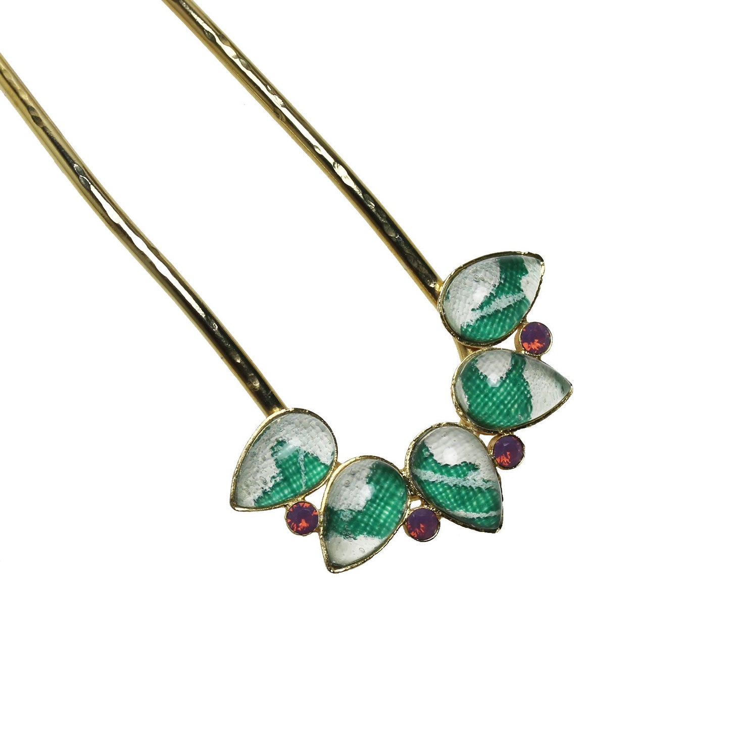 It is a luxury double prong hair stick from the "Splattered Series" made of resin. Each of the different patterns is an attraction because of handmade parts. Accents are the pale purple rhinestones. The color of the material is gold-plated, so it looks good on dark-colored hair. It goes well with daily use as well as on formal occasions. It is a classy hair accessory best for adults. You can give this as a special gift.