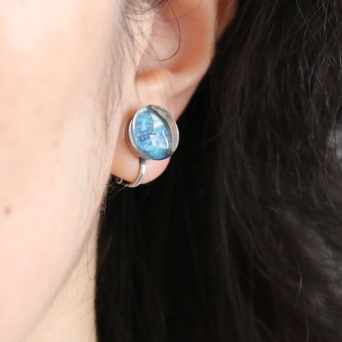 This earrings using the resin parts of the "Lily Series" (Blue). Because the simple round shape, it is easy to coordinate. It is wearing easy lighter than it looks.