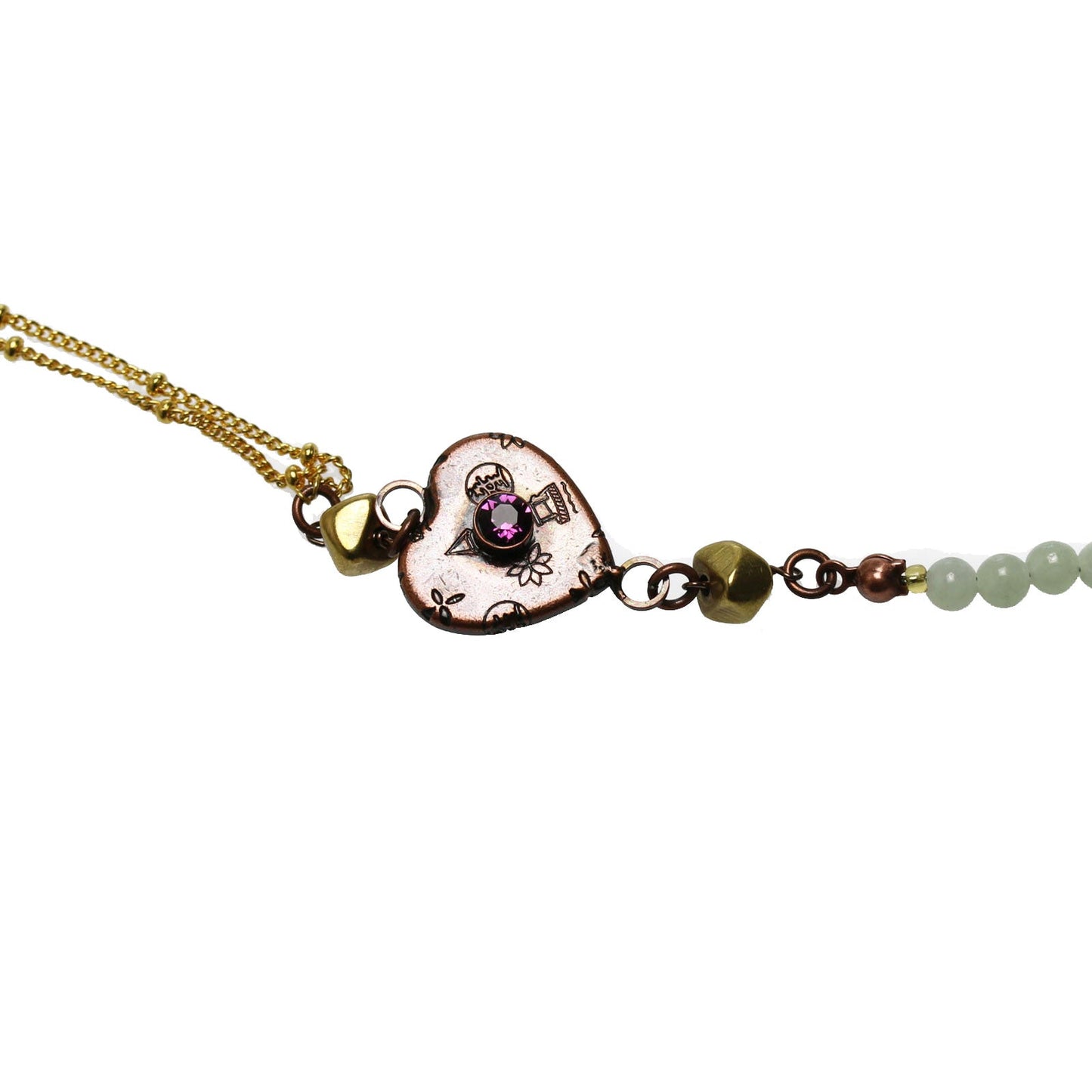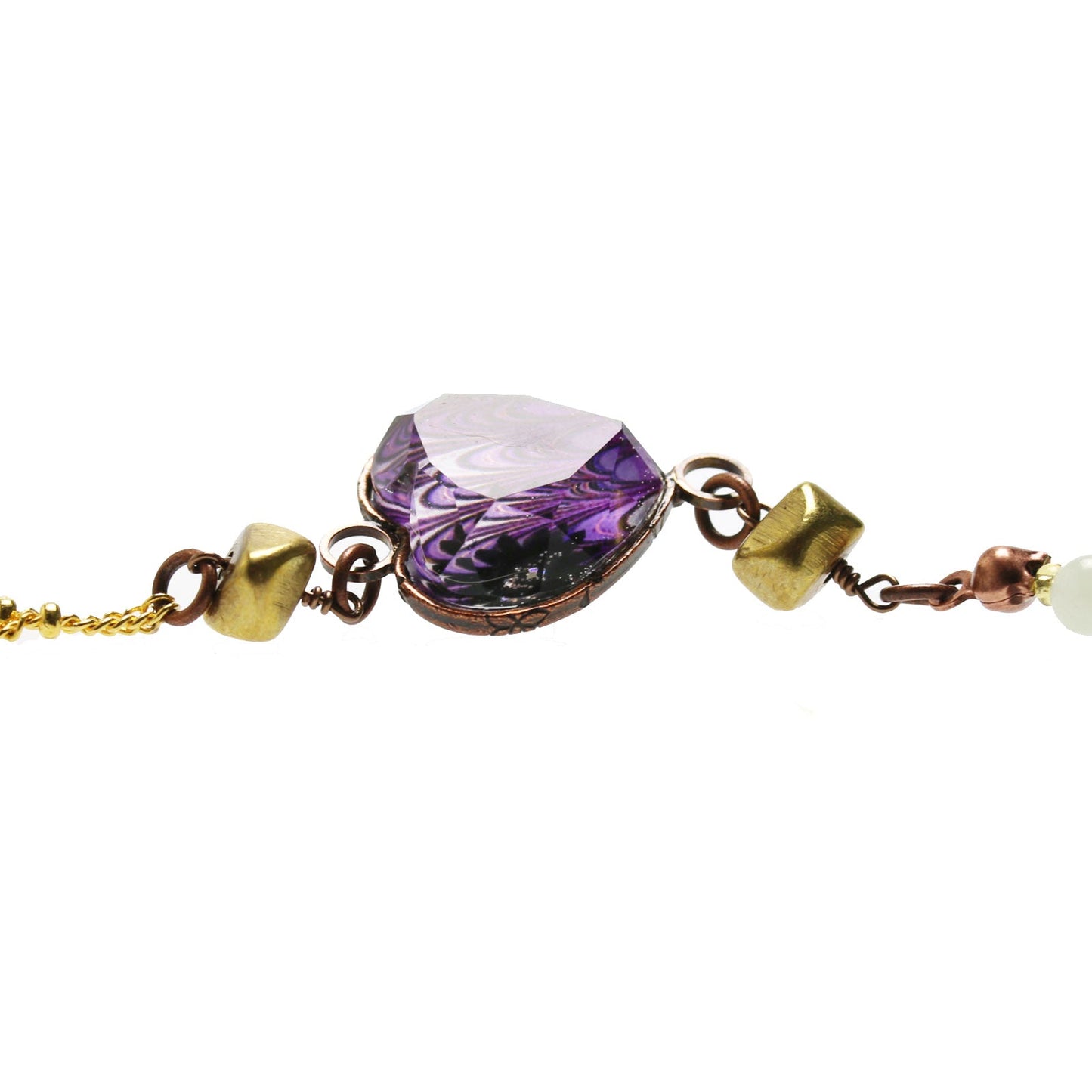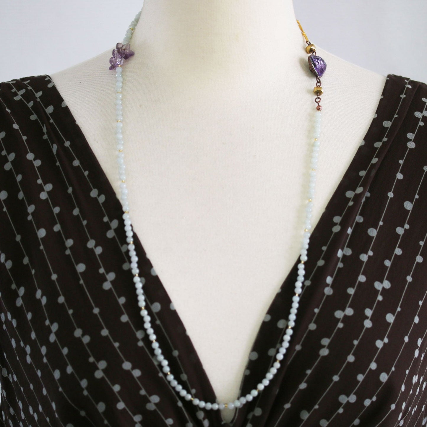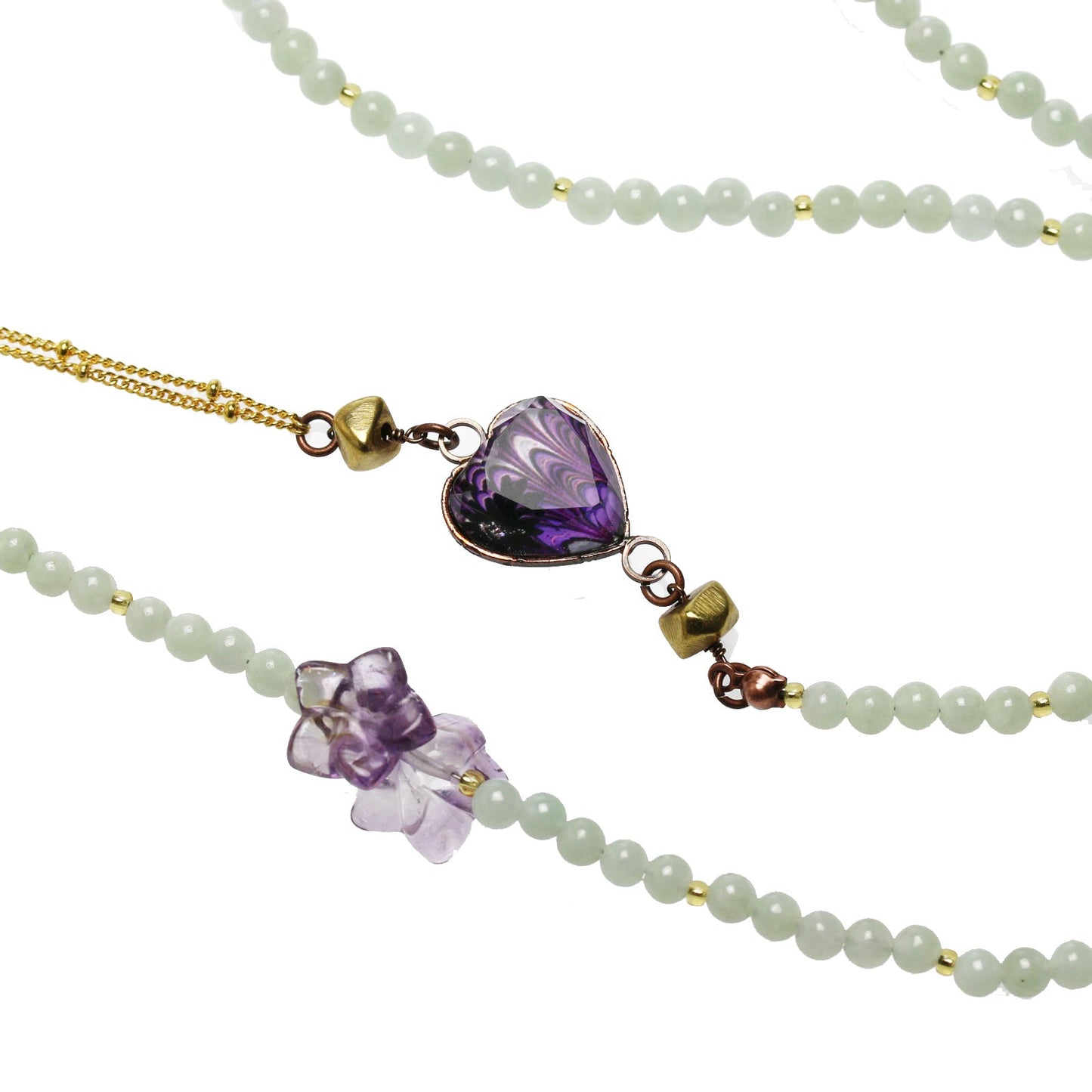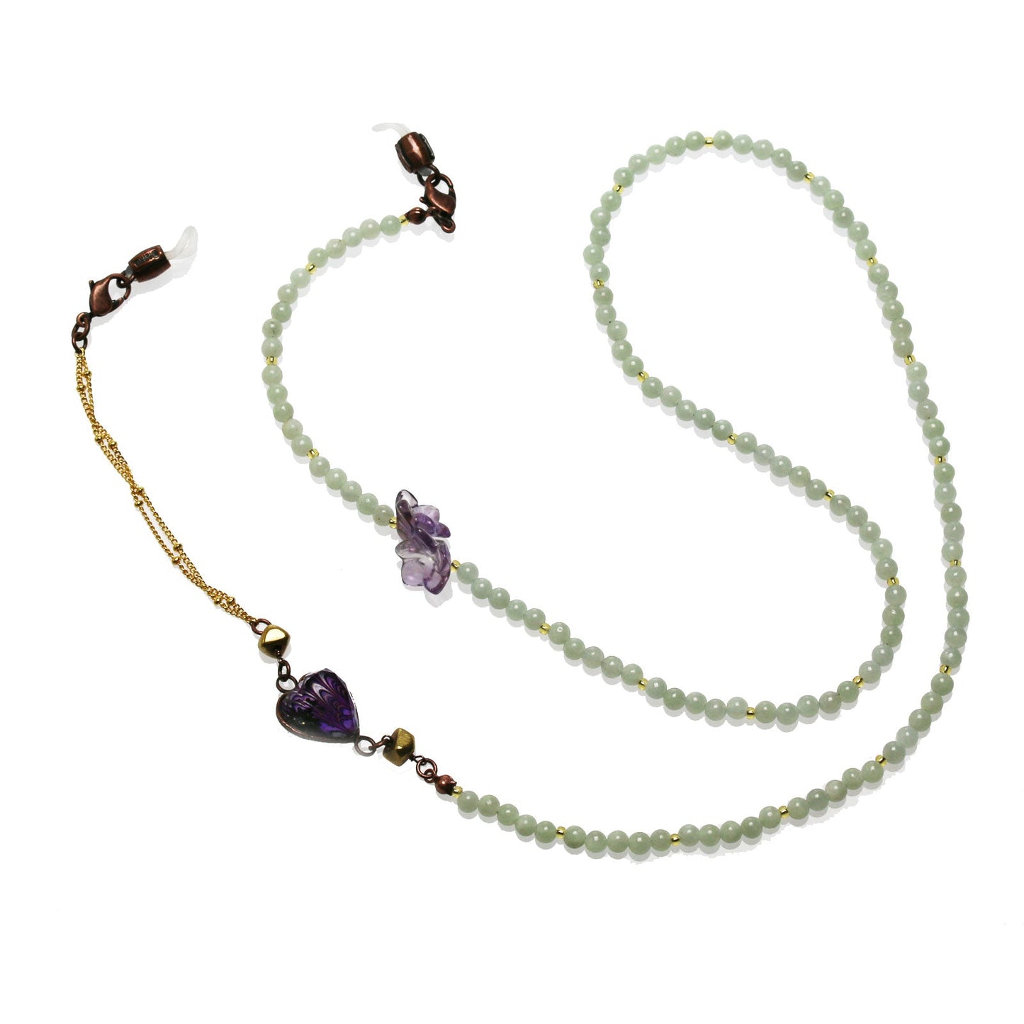 It is an eyeglass chain necklace using resin parts of "Marble Series" (Purple). We changed the left and right decorations. One side wore amethyst in flower shape. The thin green stone is book jade. The rubber part can be removed. It is a 2-way type that you can use as a necklace by connecting left and right fasteners.