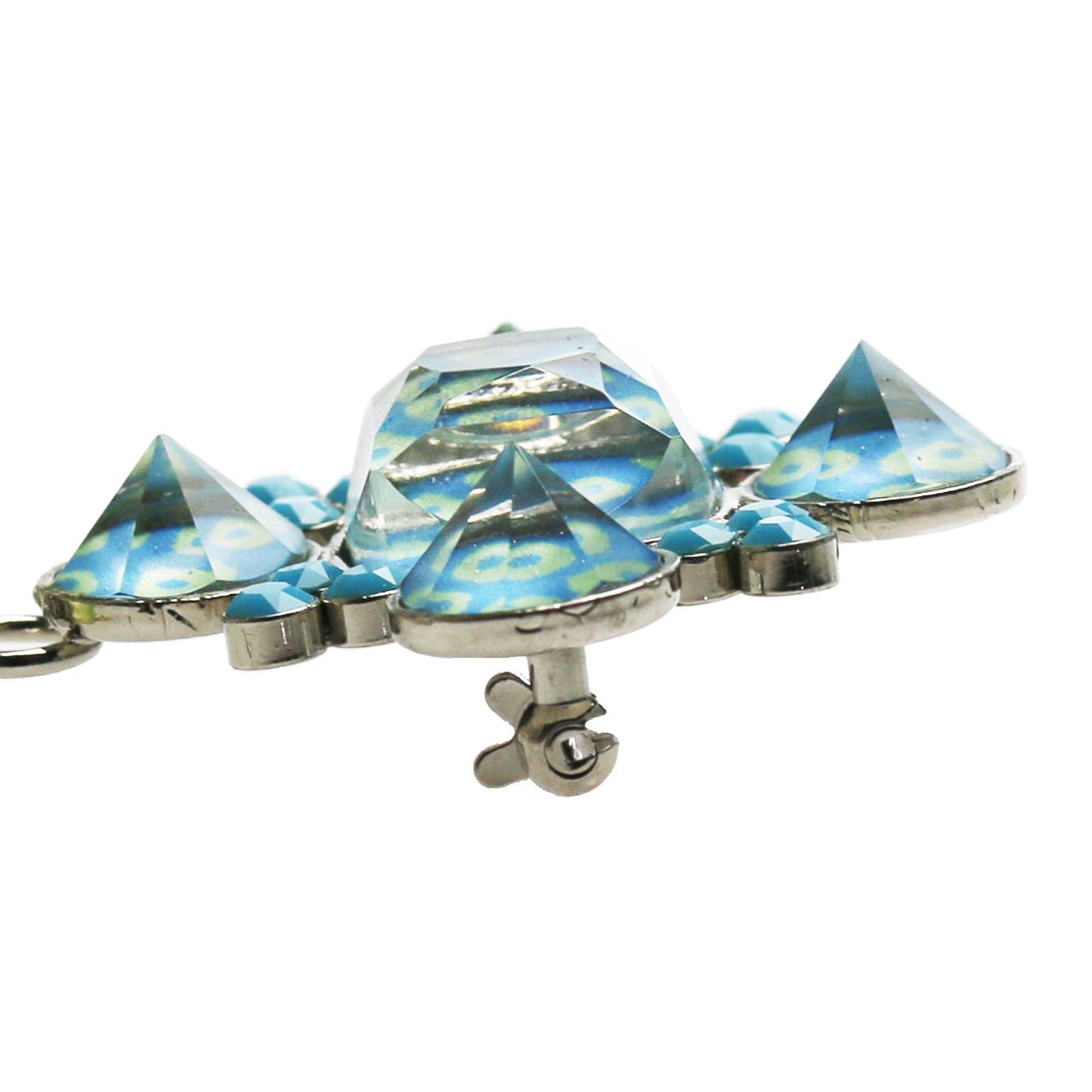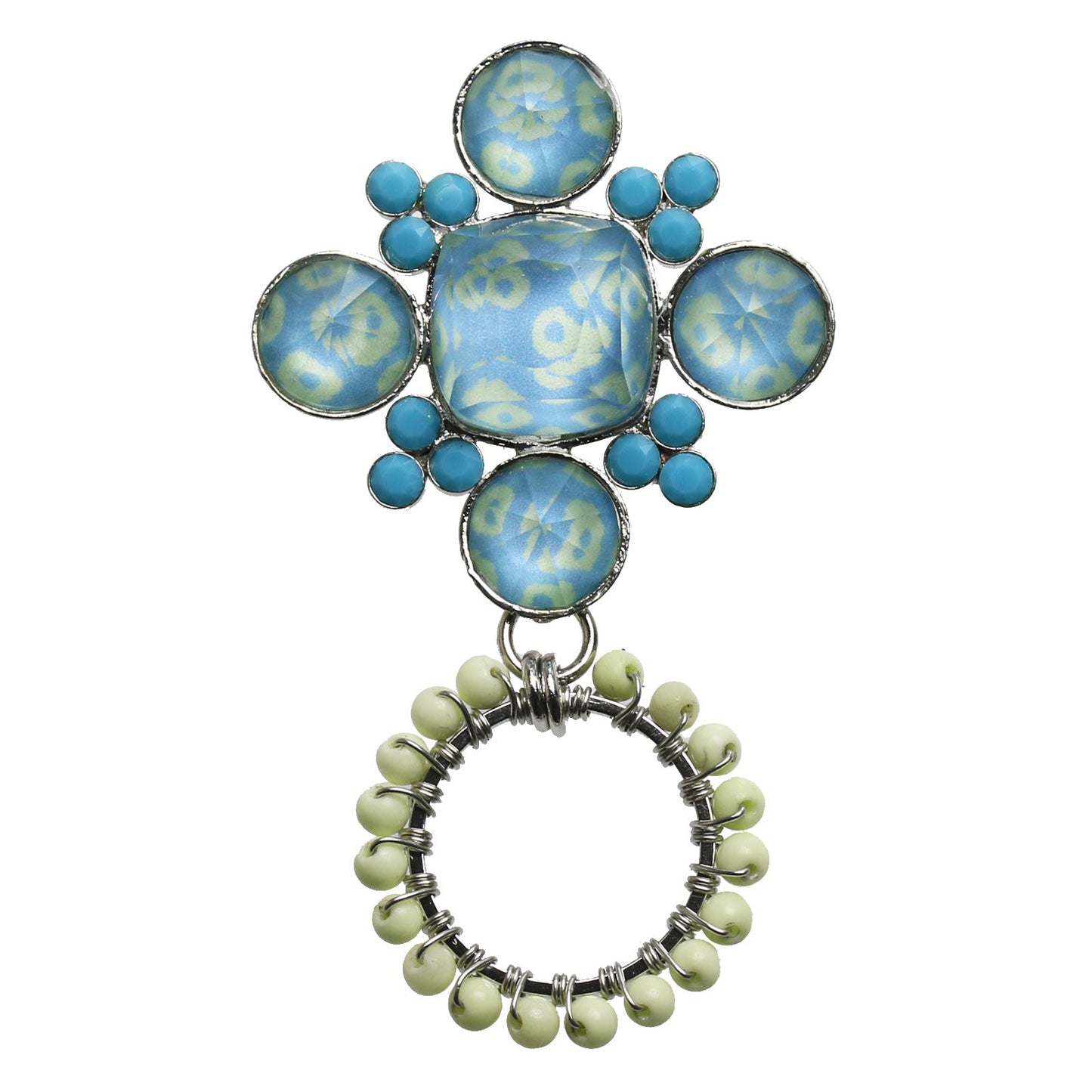 It is an eyeglass holder brooch using resin parts of "Fawn Series" (Blue). Please use it by hanging glasses on the part of the ring knitted with lemon chrysoprase. It corresponds to the width of crow (arm part of glasses) 1.5 cm or less. You can use it as a brooch. Particularly recommended for people wearing and removing sunglasses and reading glasses. It is a must-have item to bring with me when I go out and travel.