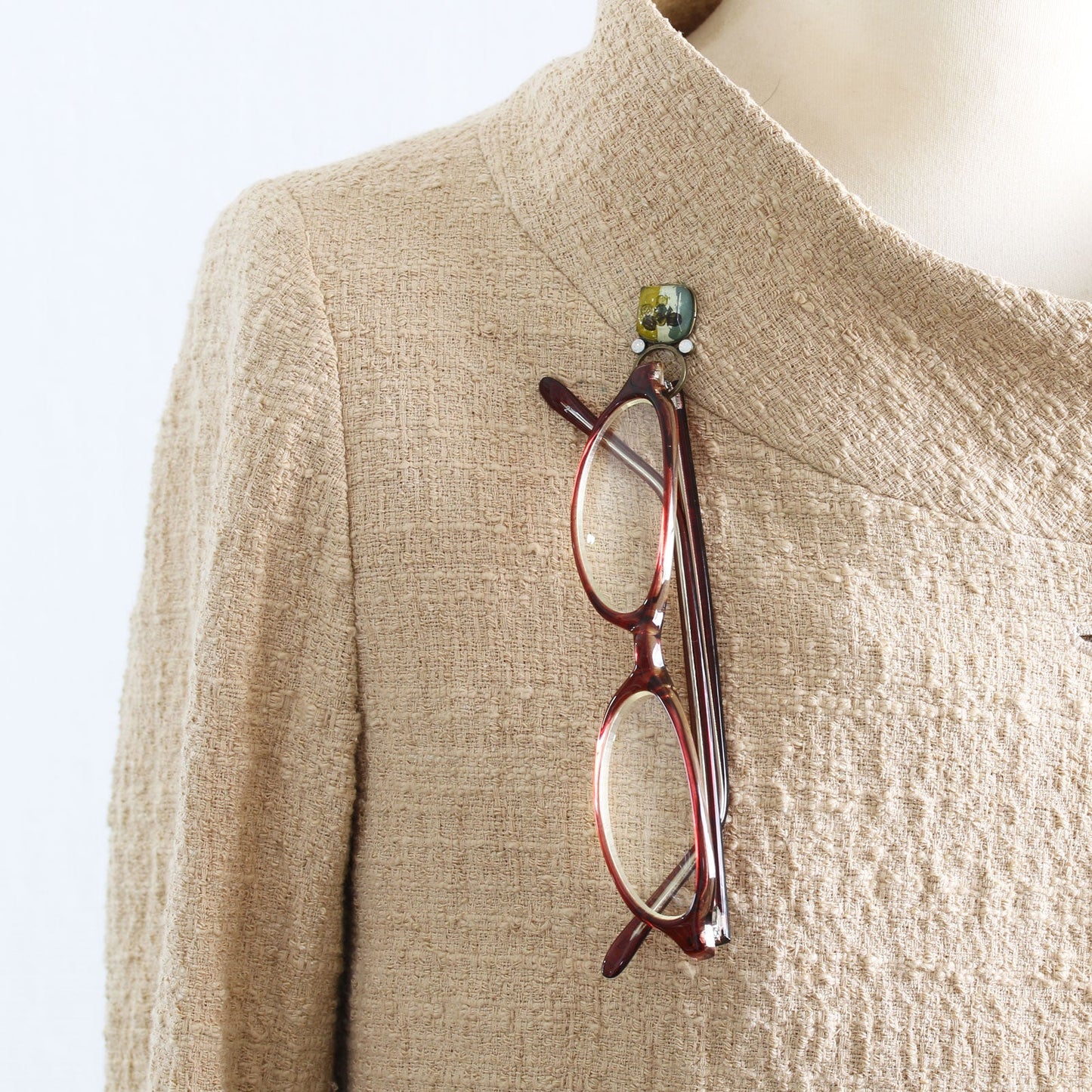 It is an eyeglass holder pin brooch using resin parts of "Ramune Series" (Green). It is easy to coordinate with chic hues. Please use glasses hooked on the ring part. You can use it as an ordinary brooch. Corresponds to the width of temple (arm part of glasses) 1.0 cm or less.
