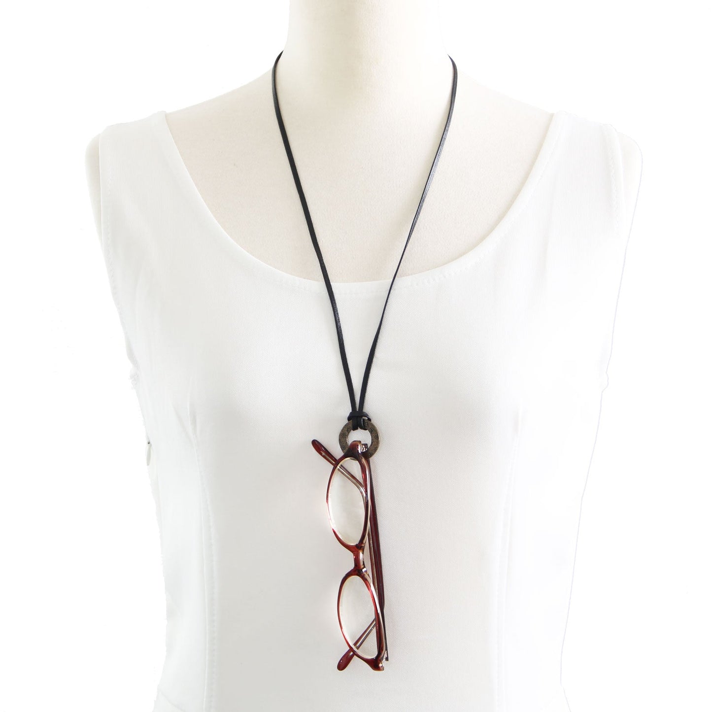 It is an eyeglass holder using resin parts of "Dororon Series" (Black). Please hook the glasses on the ring part and use it. It is 2way type you can use it as a necklace with resin parts in front. It corresponds to the width of temple (arm part of glasses) 1.5 cm or less.