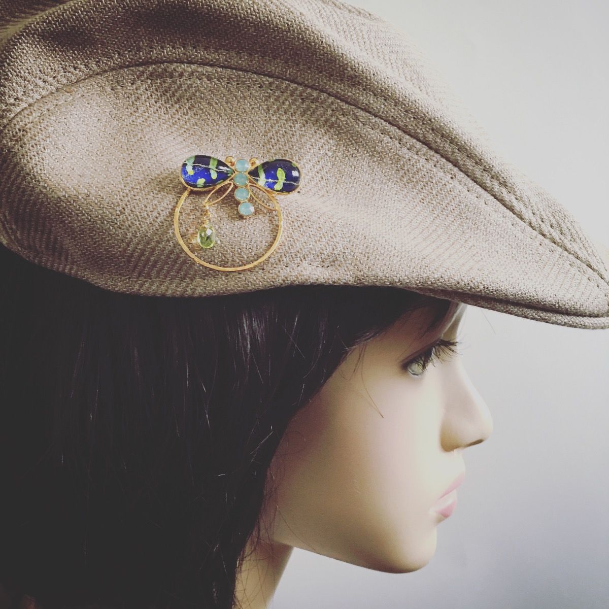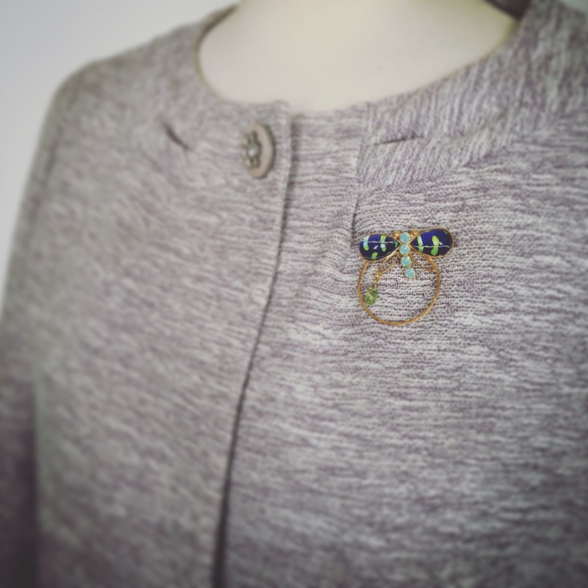 It is an eyeglass holder pin brooch using resin parts of "Vine Series" (Blue). We combined peridot according to the color of the resin. Please hook the eyeglasses on the ring part and use it. You can use it as an ordinary lapel pin. It corresponds to the width of temple (arm part of glasses) 2.6 cm or less.