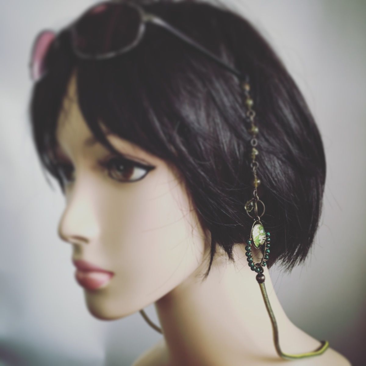 It is an eyeglass chain from the "Lily Series" (White Green) made from resin. We especially ordered the silk string from the craftsmen in Kyoto. We used quartz (dyed), malachite, and peridot to create an overall green gradation. There is an ornament on each side of the ear, so it doesn't become heavy, and you can enjoy its stylishness. It is designed for all ages, so it will last a long time and can make a great gift.