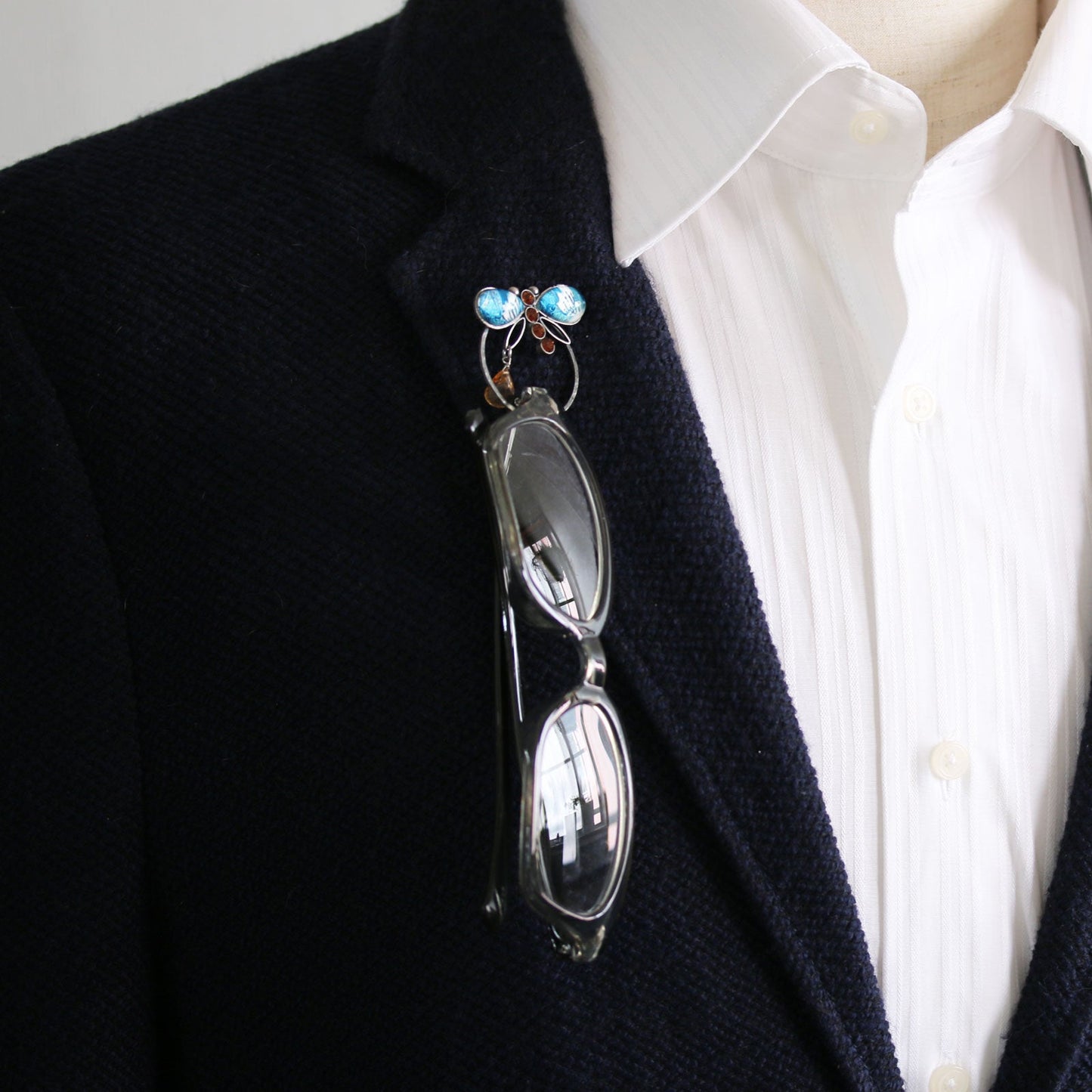 It is an eyeglass holder pin brooch using resin parts of "Lily Series" (Blue). We combined citrine according to the color of the resin. Please hook the eyeglasses on the ring part and use it. You can use it as an ordinary lapel pin. It corresponds to the width of temple (arm part of glasses) 2.6 cm or less.