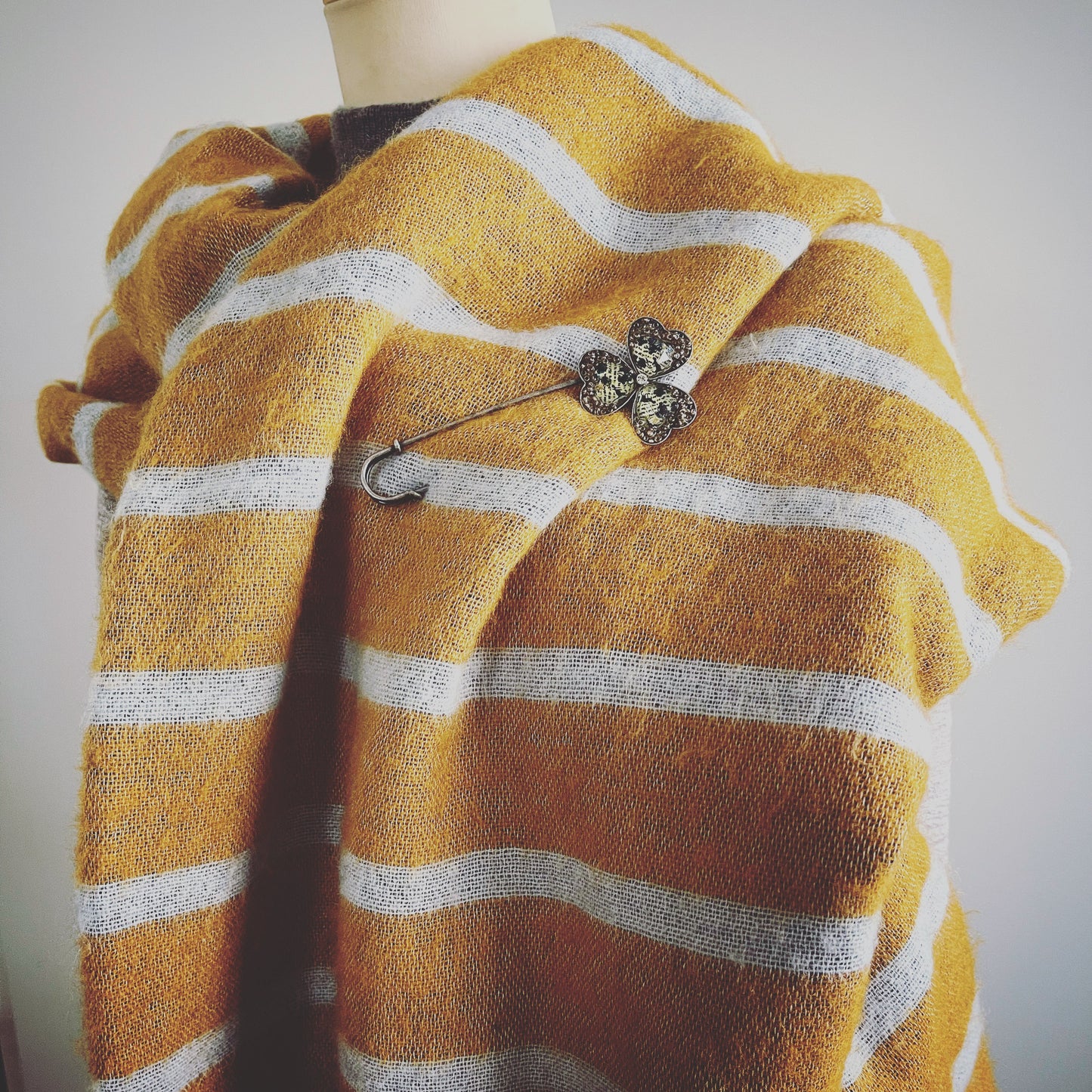 It is a fancy safety pin (flower-shaped) using the resin parts from the "Dinosaur Series" (Navy Blue). The dinosaur and silver beads are accents. Since the pin is thick, you can put it better on rough scarves or garments. This pin is a quick and simple styling solution for any occasion. It is designed for all ages.