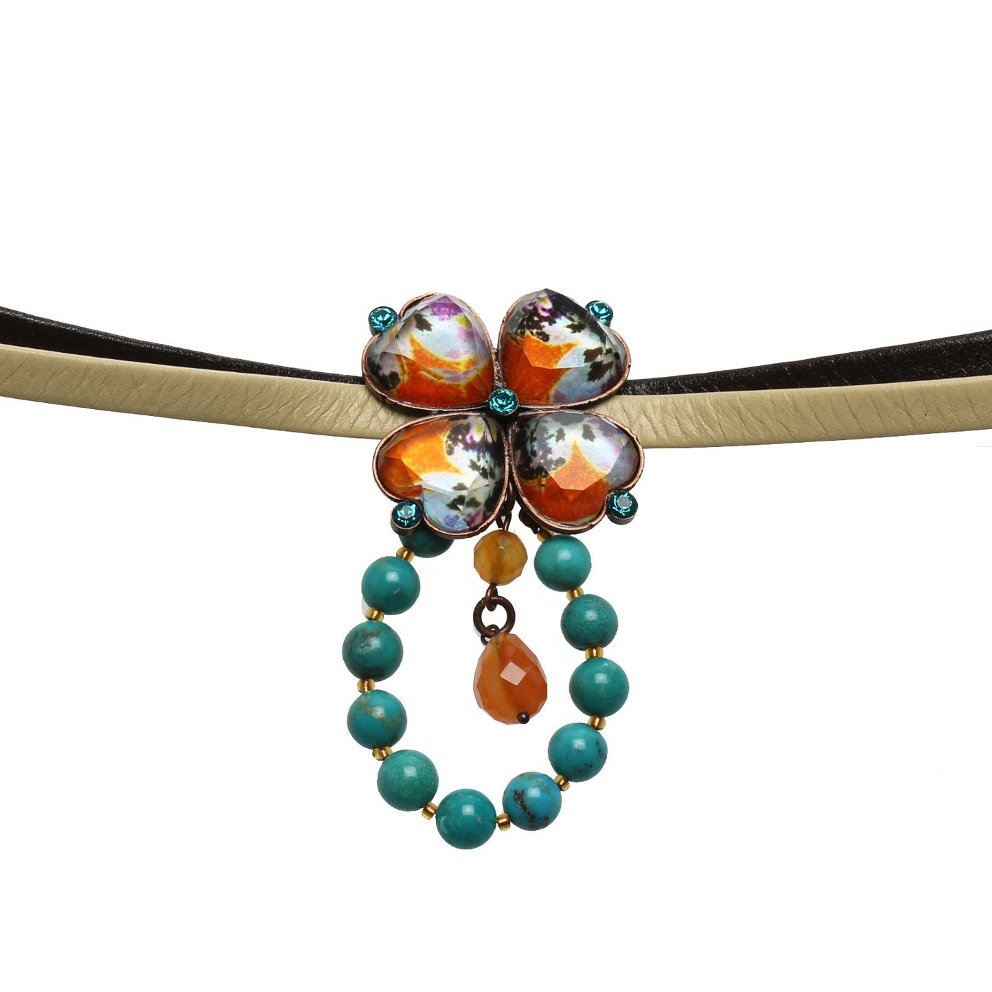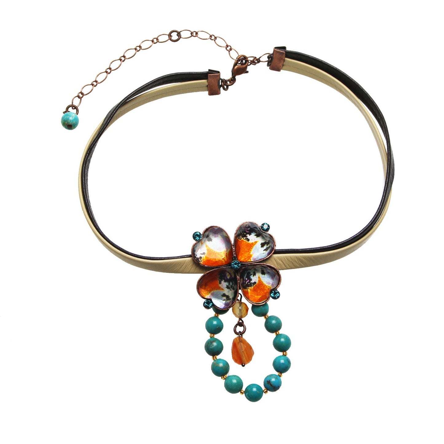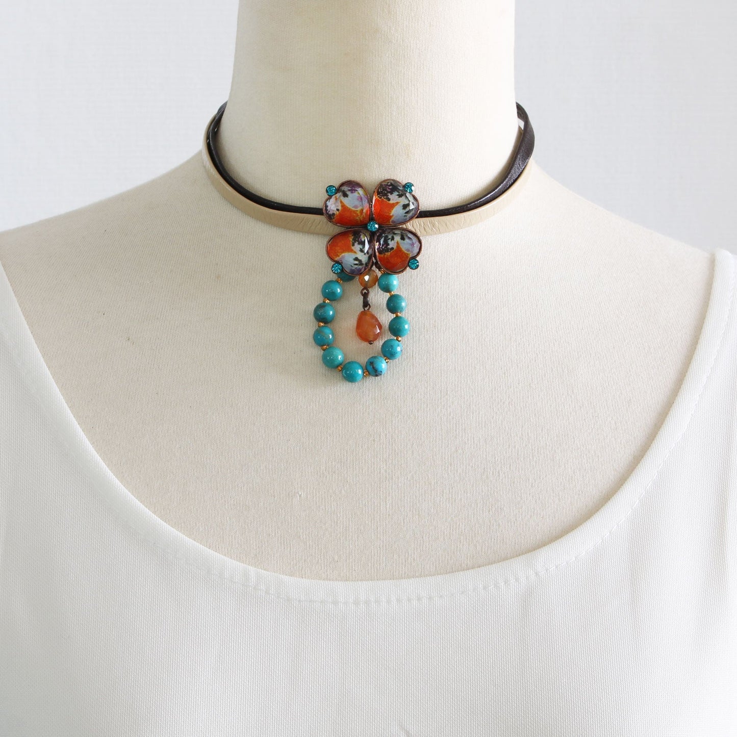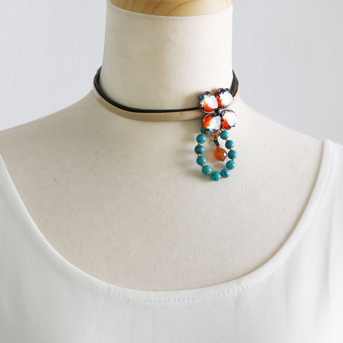 It is a choker combining the resin parts of the "Pansy Series" (Orange) and two leather straps. Pull the eye in a unique design. Recommended for individual and gorgeous fashionable neck.