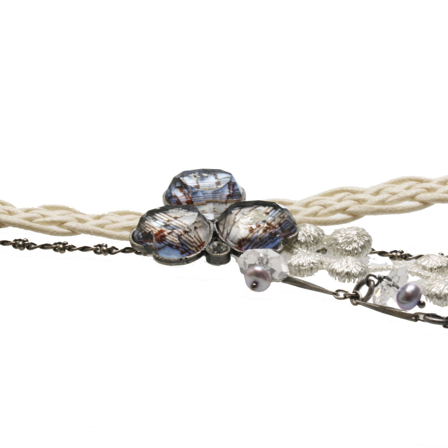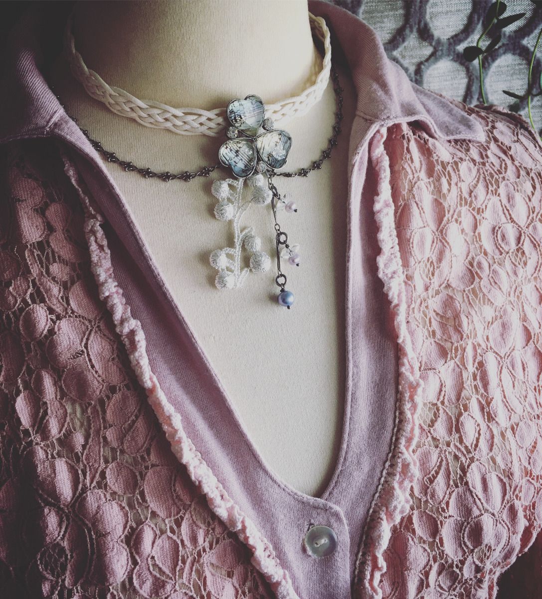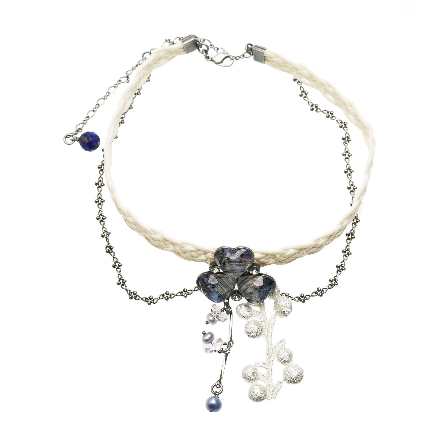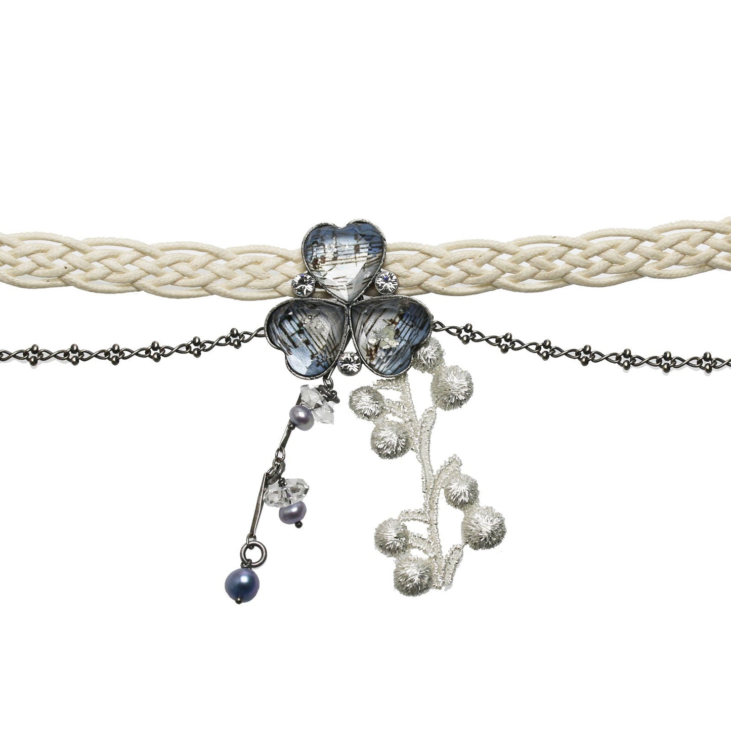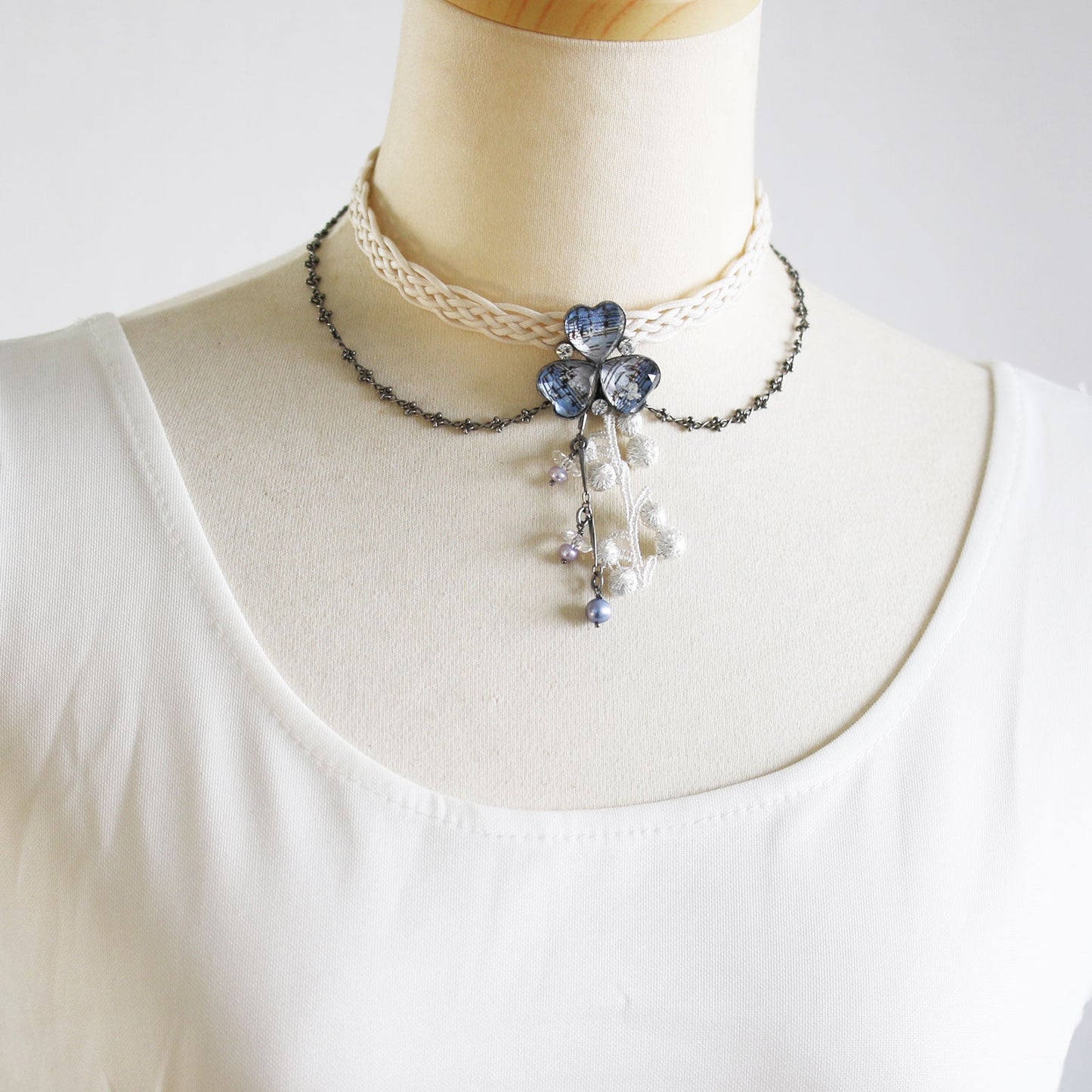 It is a ribbon choker using the resin parts of "Musical Note Series" (Blue). With a combination of light blue and light blue, when you wear it directs your face brightly and gorgeously. Fresh water pearl and crystal were combined according to the color of resin. I put soda-light on the adjuster. This product is made intentionally so that silver or gold powder is put in the resin as a design and the musical note is not seen well. Because I cut the part of the note randomly, it may become a slightly different hue from the photograph.
