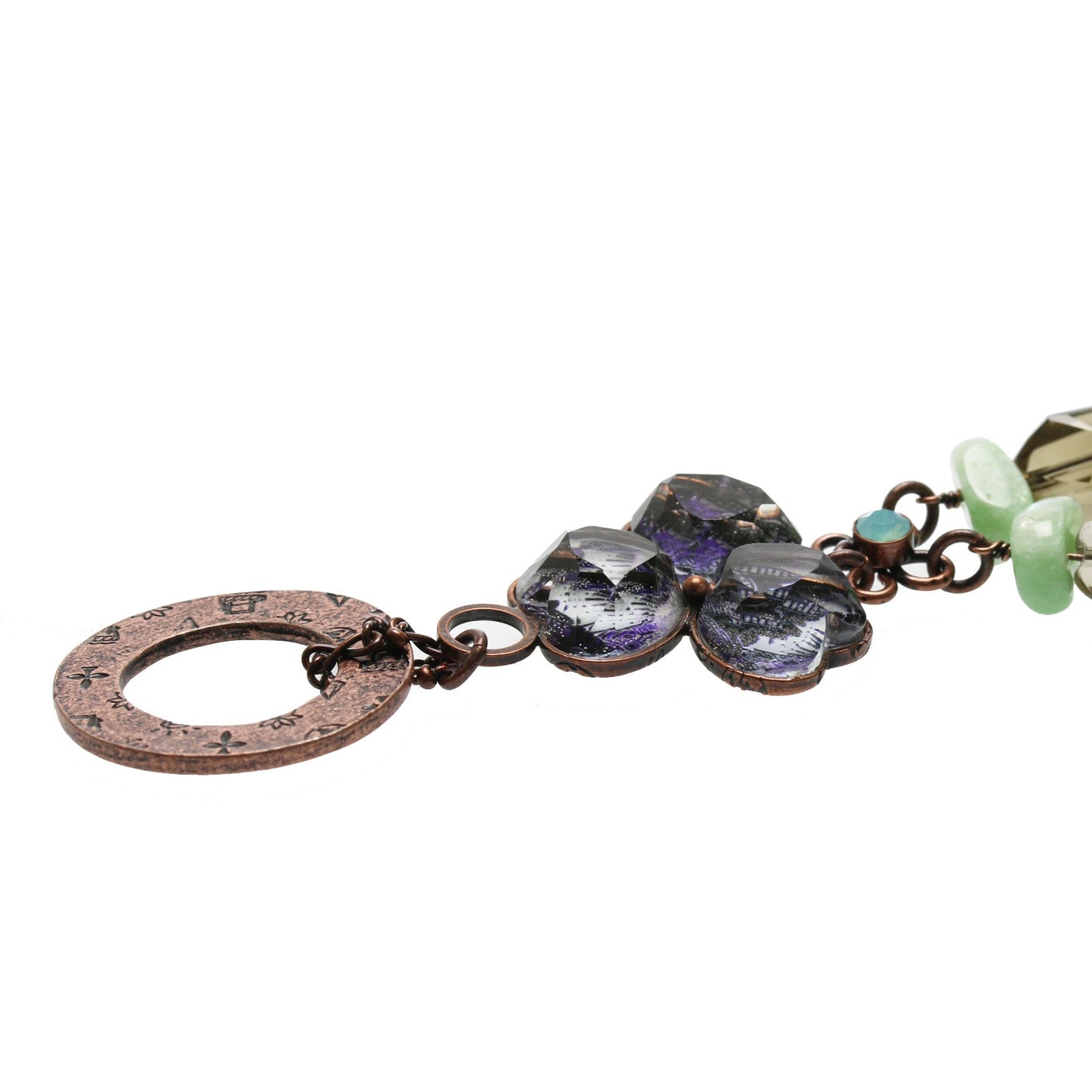 It is an eyeglass holder necklace using the resin parts from the "Lily Series" (Purple). We use the amethyst, Smoky Quartz, Muscat feldspar, Stichtite, Lava Phosphosiderite. Please use Hook the glasses to the ring portion. You can use it as a necklace. It supports to width of glasses temple until 1.5cm.