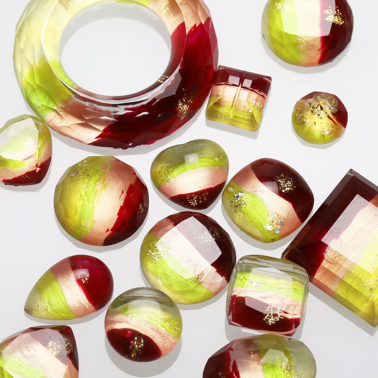 Rainbow Series (Orange): These are the rainbow series. I painted with a manicure directly on the bottom part of a transparent resin and drew a rainbow-like border. The golden lame accents the pattern.
