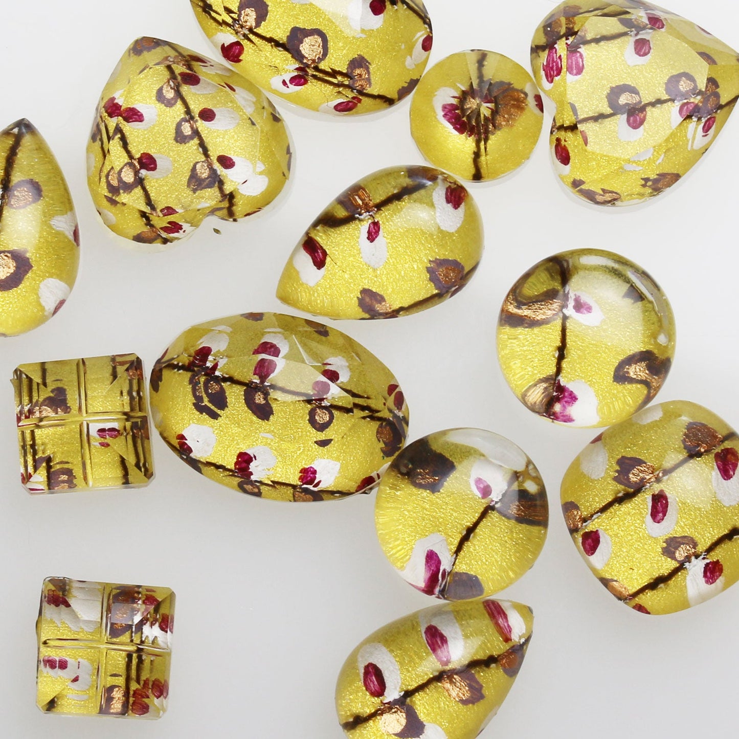 Vine Series (Gold + Red): These are another vine series. After sewing with brown thread on a special paper which glows in gold, I drew a swingy pattern with white, gray, enji, metallic gold paint one by one.