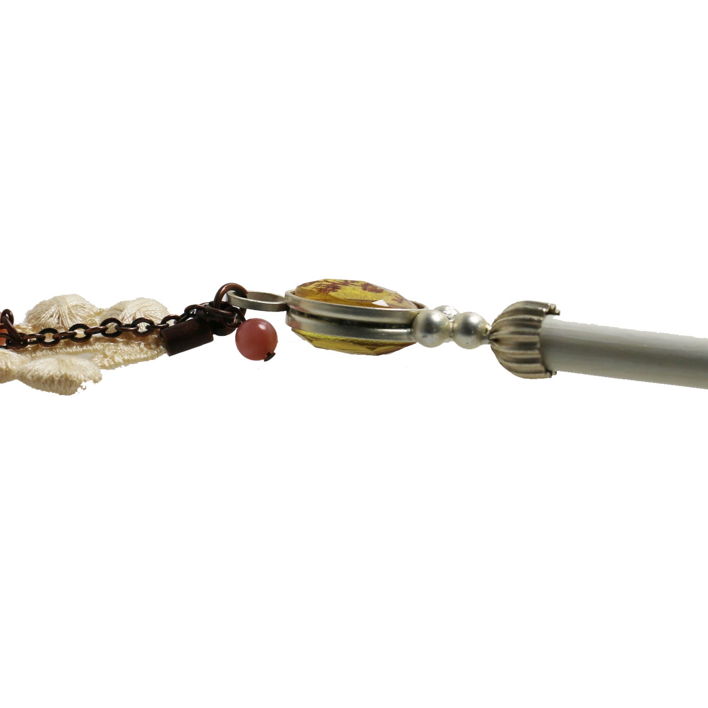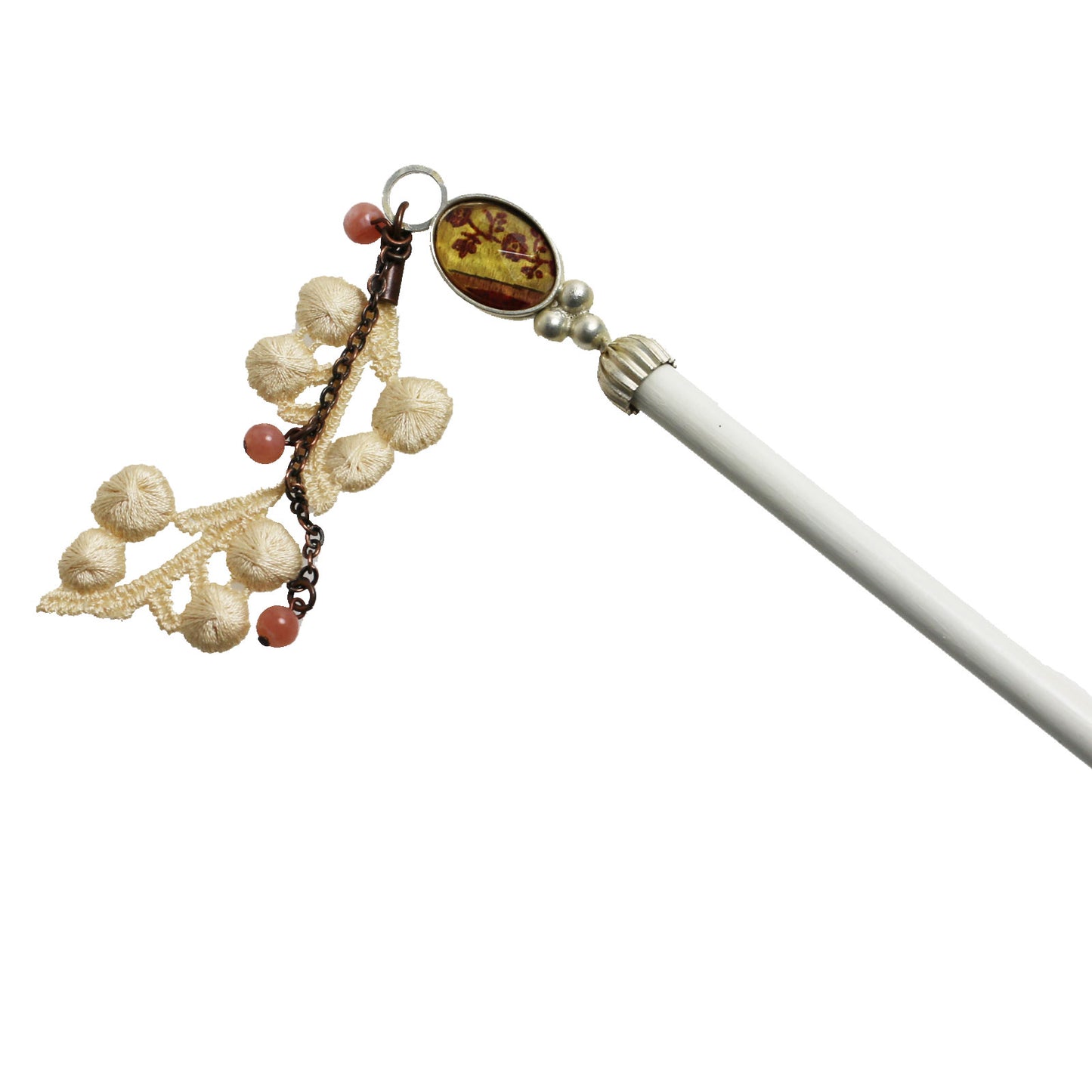 It is a while-painted wood hairpin using the resin parts from the "New Rose Tree Series"(Pink). Every time you move, the ivory lace with leaves and pink rhodonite swings. The feminine atmosphere is astonishing.