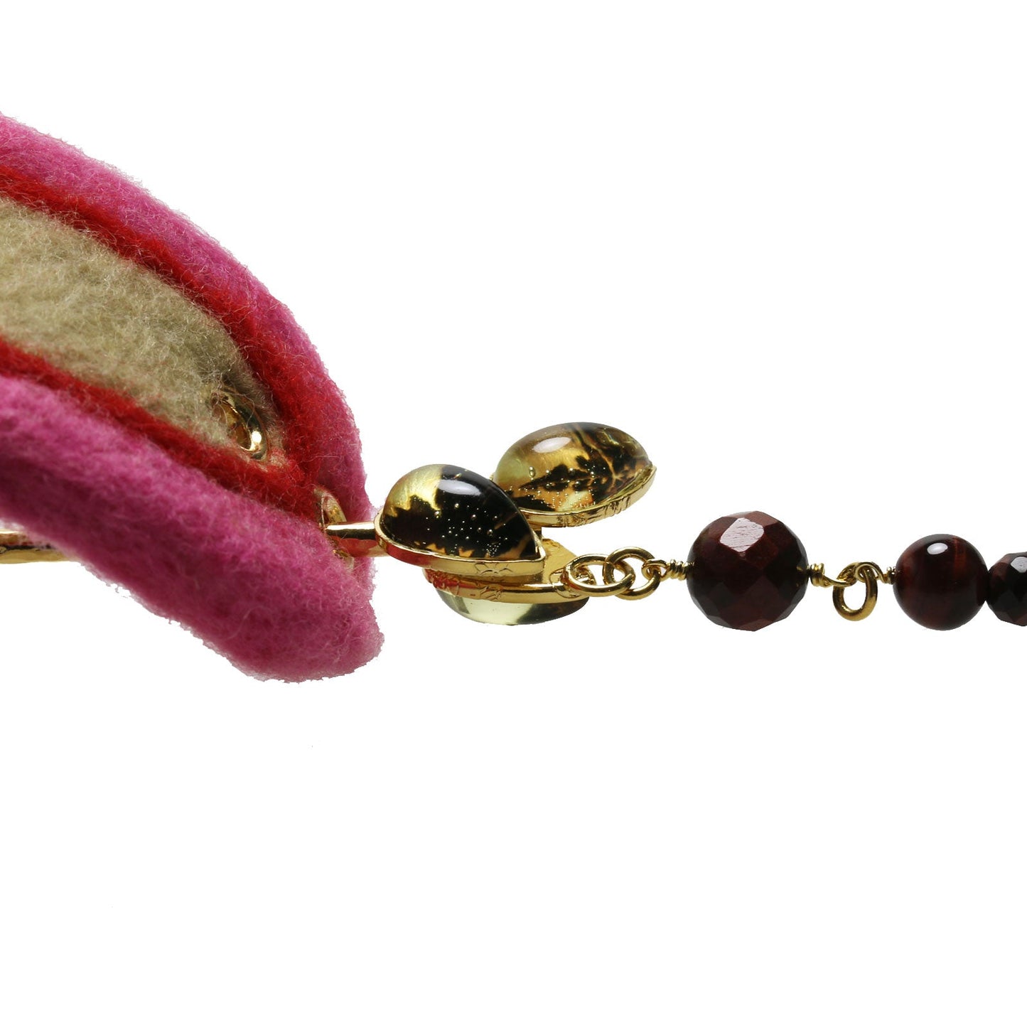 It is a barrette from the "Backyard Series" made of resin. It is felted to the compressed felt using a needle with pink, beige, and red wool. The hair stick has a stunning design with a hanging tiger's eye. It has a point with an attractive and chic atmosphere.