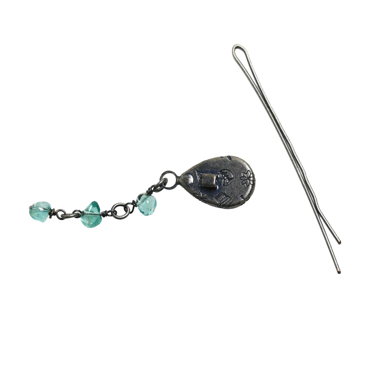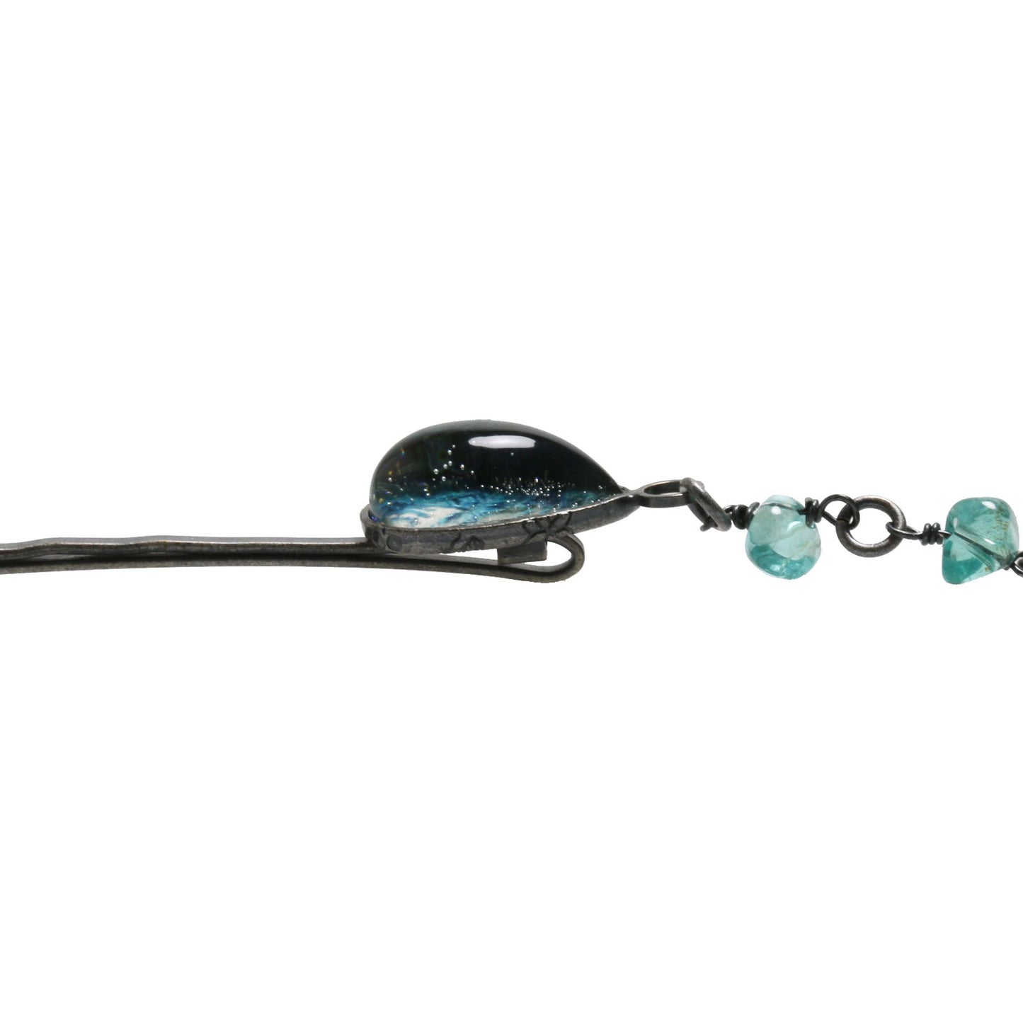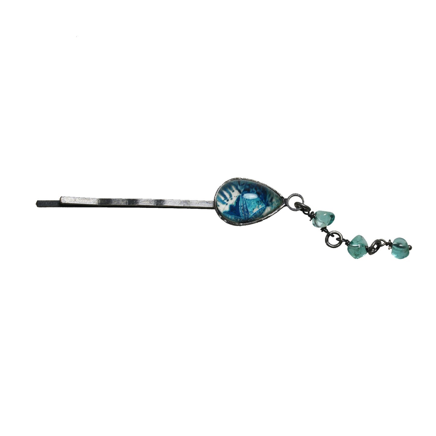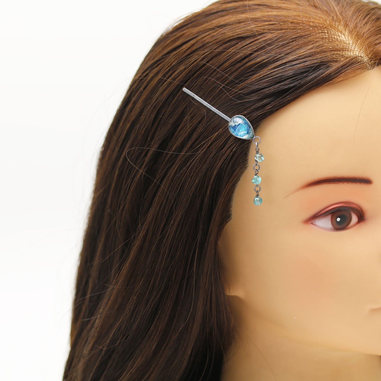 It is a hairpin using the resin part of the "Lily Series" (Blue) waterdrop shape. It has an ornate design with three apatite hanging and coordinating with color. When you pin it on your bangs, you look like a maiko. The decorative parts can be removed from the hairpin.