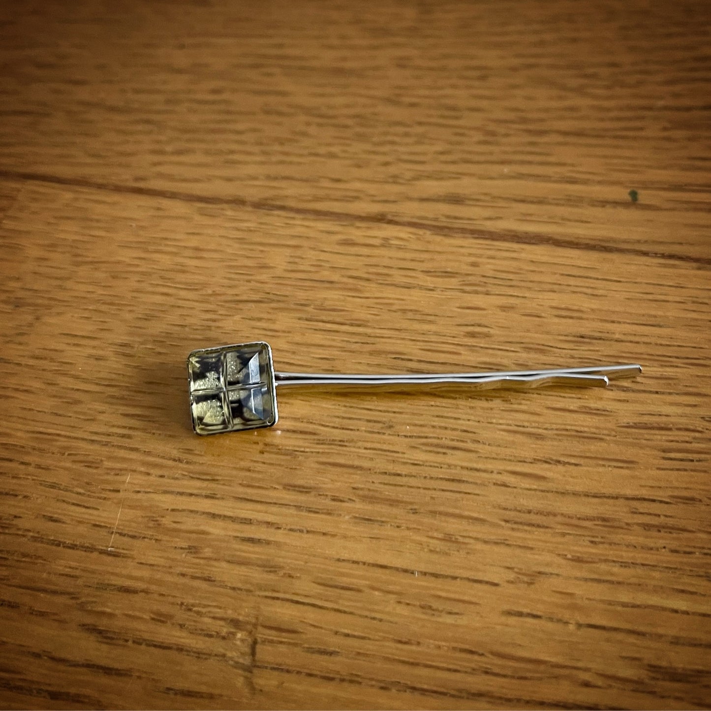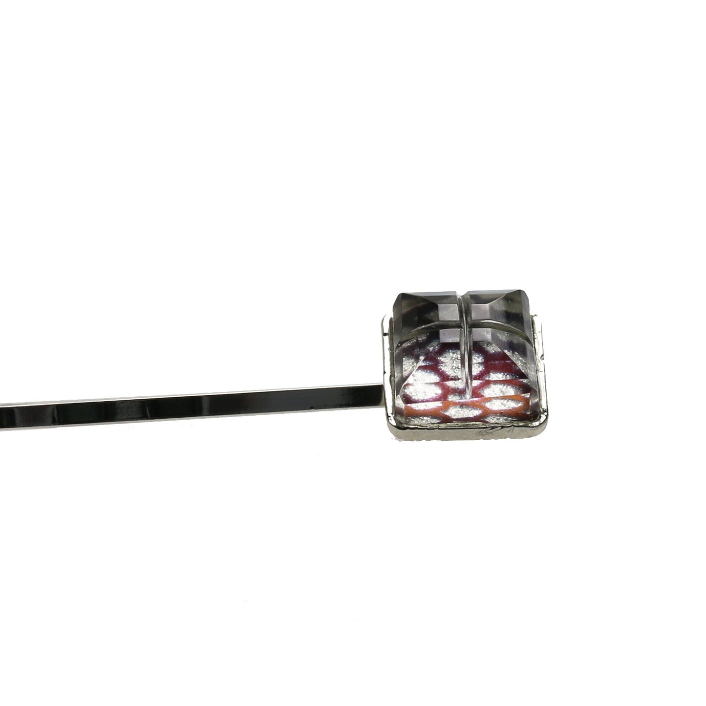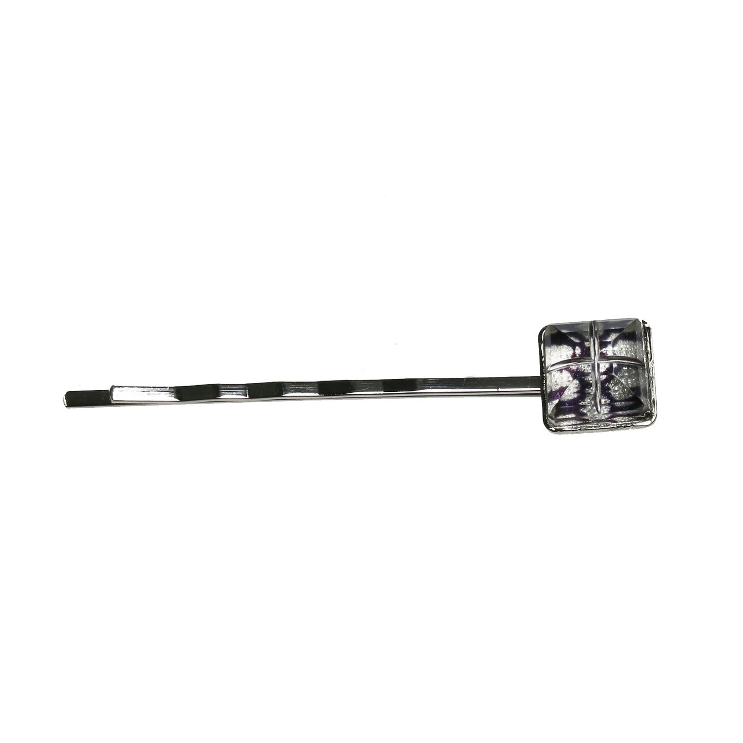 It is a "slide-type" hairpin using the resin part of the "Navy Blue Socks Series." Since it has silver lames, it suits the rhodium metal. It is recommended for men since it has a simple design. It can easily be worn by simply gliding the clip onto the part of the hair according to the style that you wish to do.