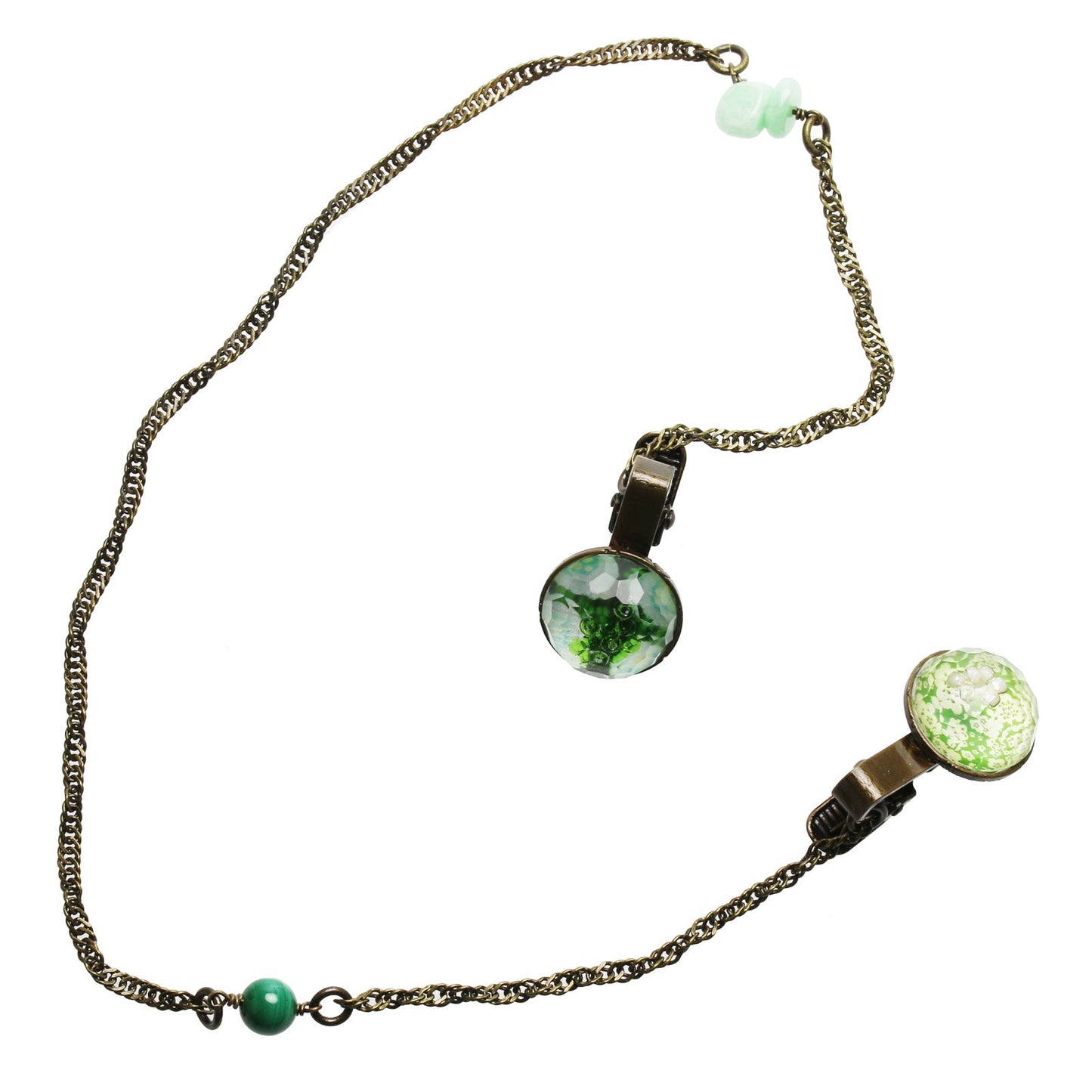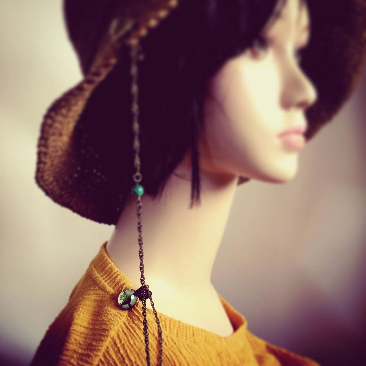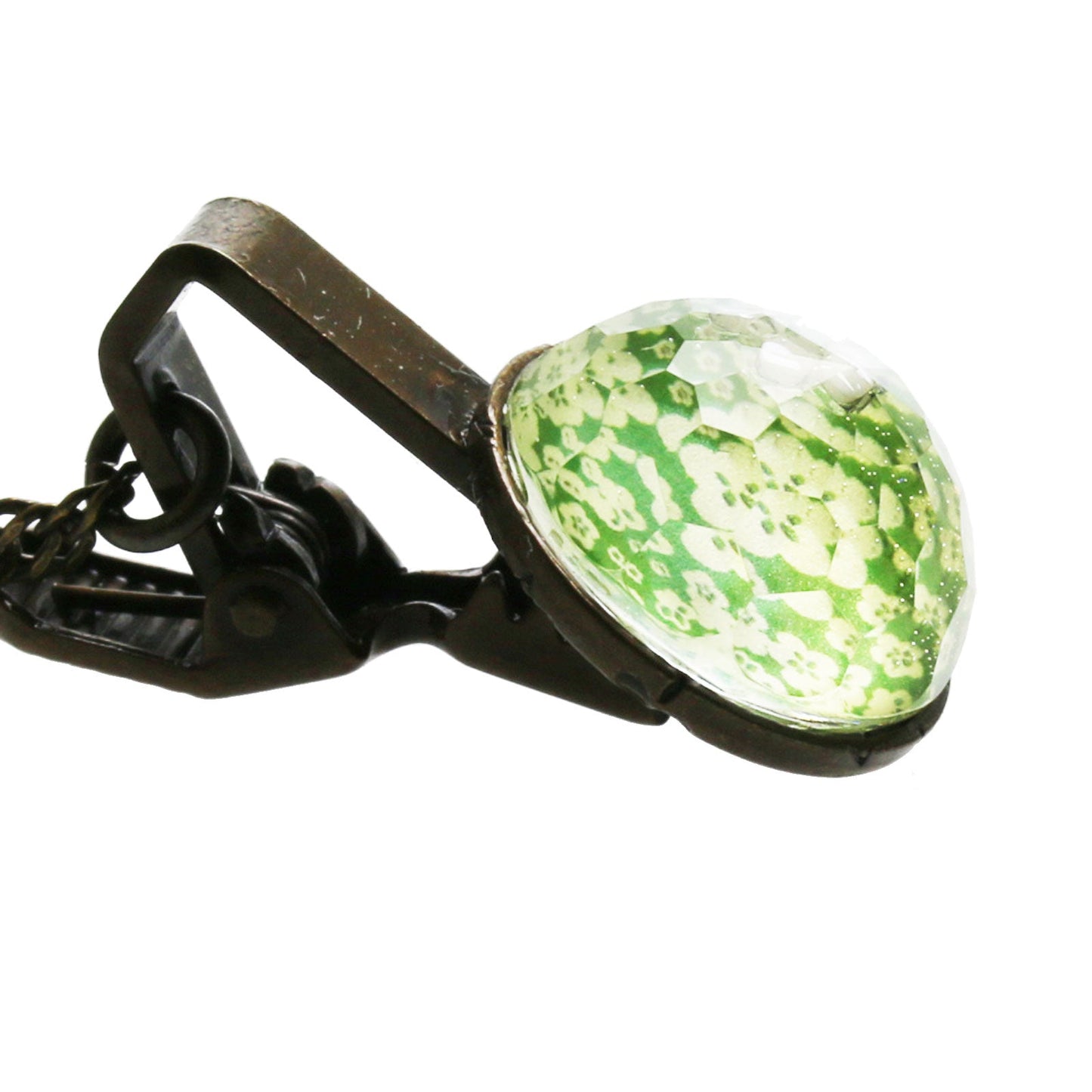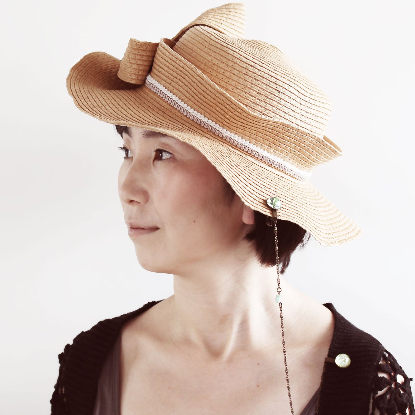 It is a hat clip using plastic parts of "Plum Cake Series" (Green Tea) and "Watermelon Series (Green)". In accordance with the color of the resin, Malachite and Muscat Feldspar were combined. Not only to keep the hat from flying into the wind, you can enjoy the unique hat fashion.