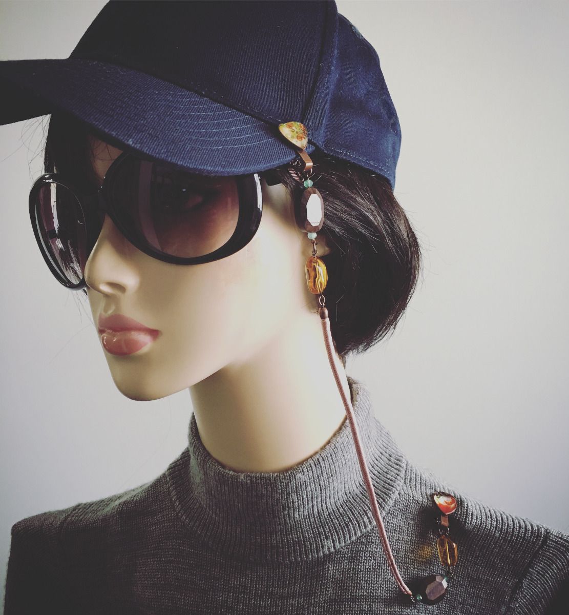 It is a hat retainer using the resin parts from the "Pansy Series" (Orange) and "Candy Series" (Grey) heart shape. Aventurine, wood beads, and citrines are combined to match the color of the resin parts. The pink silk braid is specially ordered from the craftsmen in Kyoto. It is a clip, so it can be easily fastened to your hat. It prevents flying away from the wind. You can enjoy a unique fashion style.