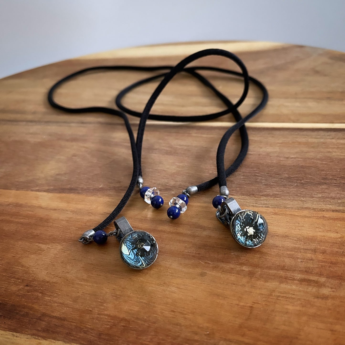 It is a hat retainer using the resin part of the "Marble Series" (Blue). The fine surface cut and its transparency is attractive. It is a combination of lapis lazuli and quartz that goes well with the color of the resin. Clip it to the brim of your hat and tie the ribbon under your chin. Not only does it prevent from flying away in the wind, but it also makes a unique accent. It can be an ideal gift.