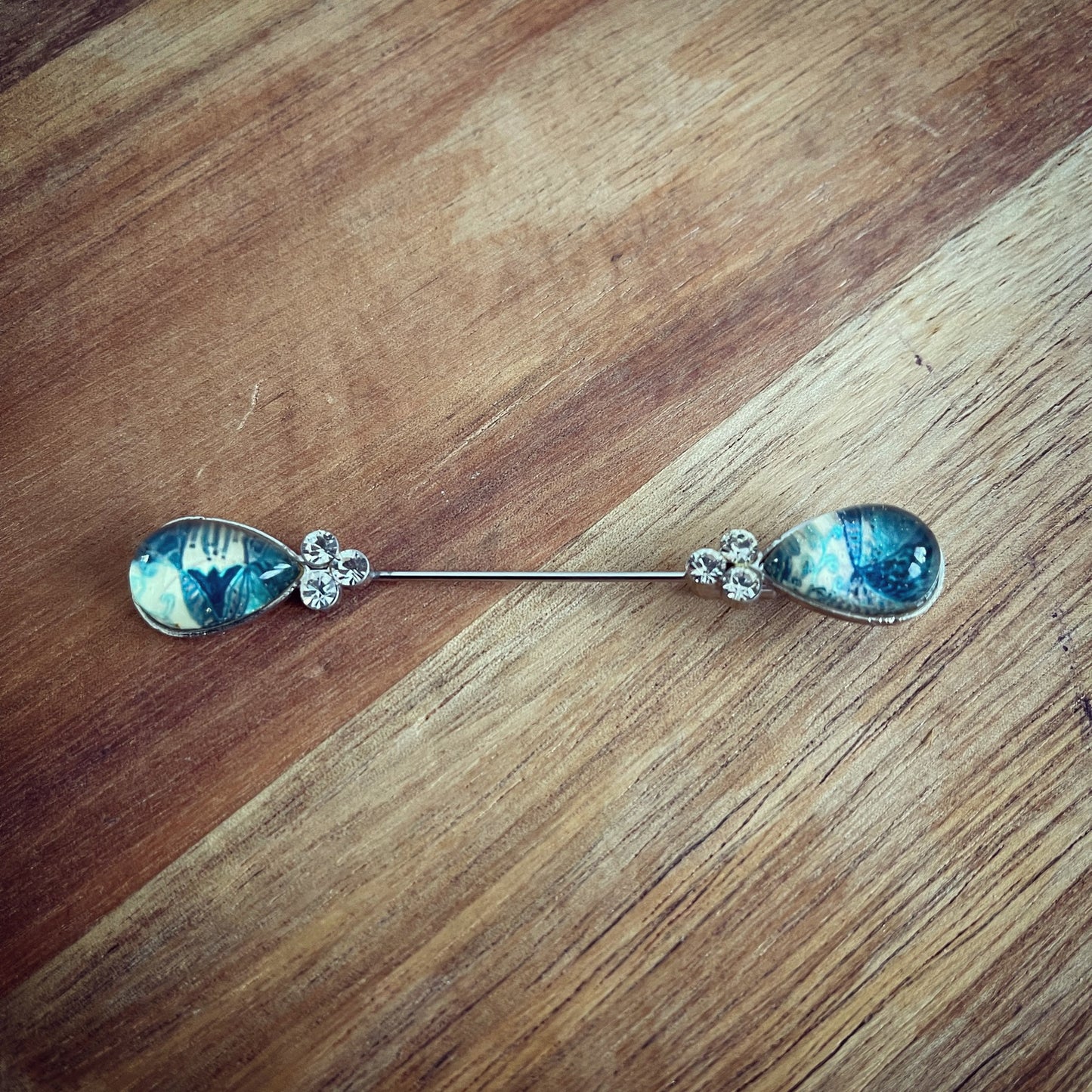 It is an ornamental hatpin that uses a drop-type resin parts of "Lily Series" (Blue). We put a decoration to metal fittings side. Please use it as a lapel pin or cardigan brooch. Transparency of rhinestone shine brilliantly. It is also recommended as a unique gift.