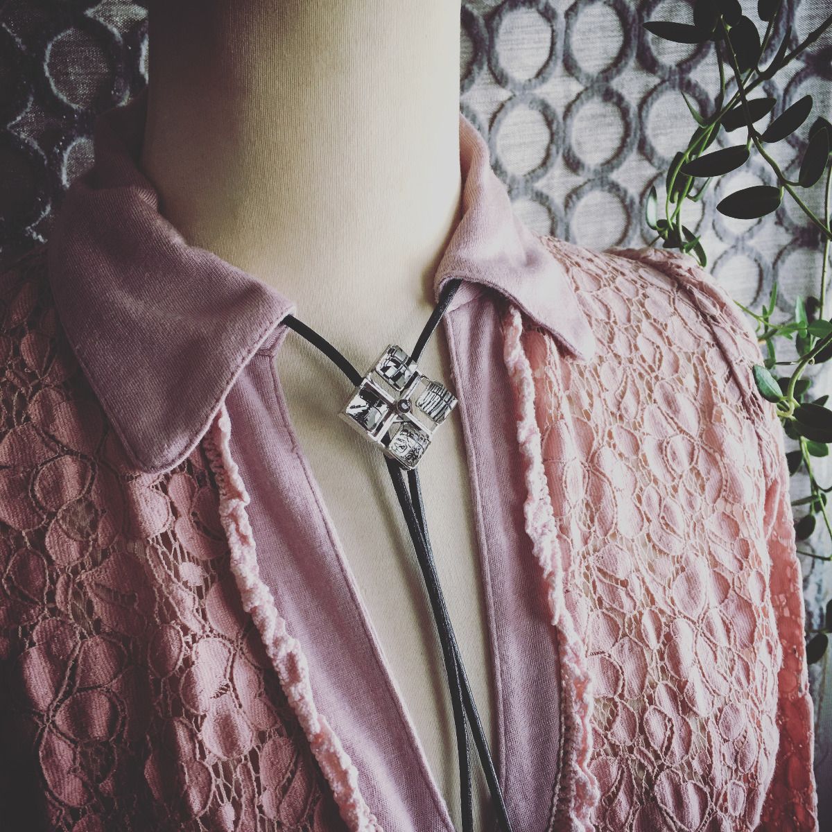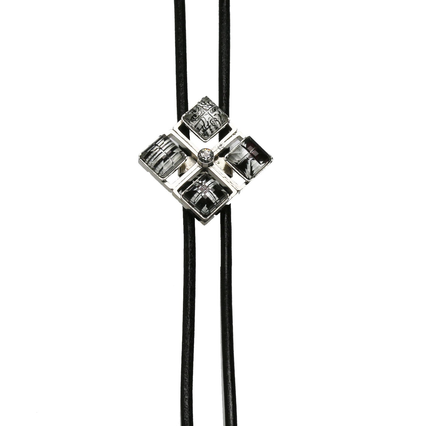 It is a leather strap bolo tie from the "Black & White Series" square shape made of resin. It is a stylish design combined with four different pattern parts. In addition to shirts, we recommend wearing it with a t-shirt or a polo shirt to accentuate a casual look.