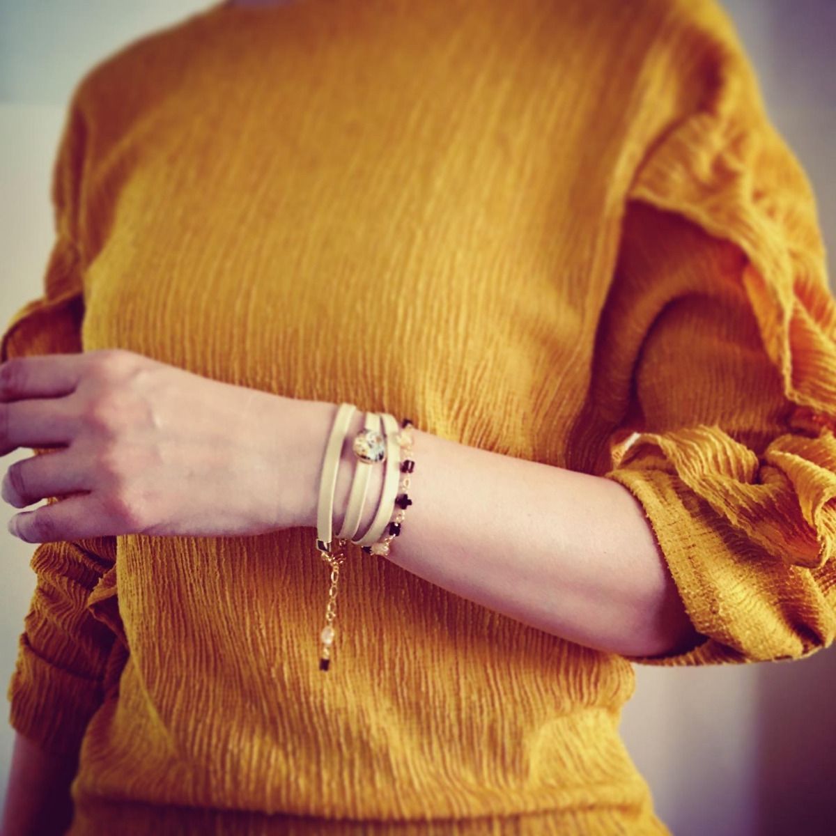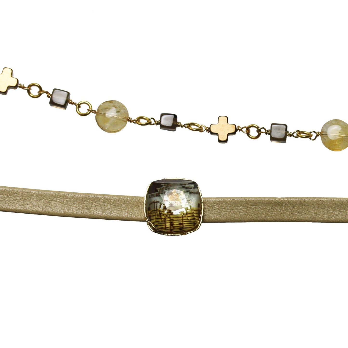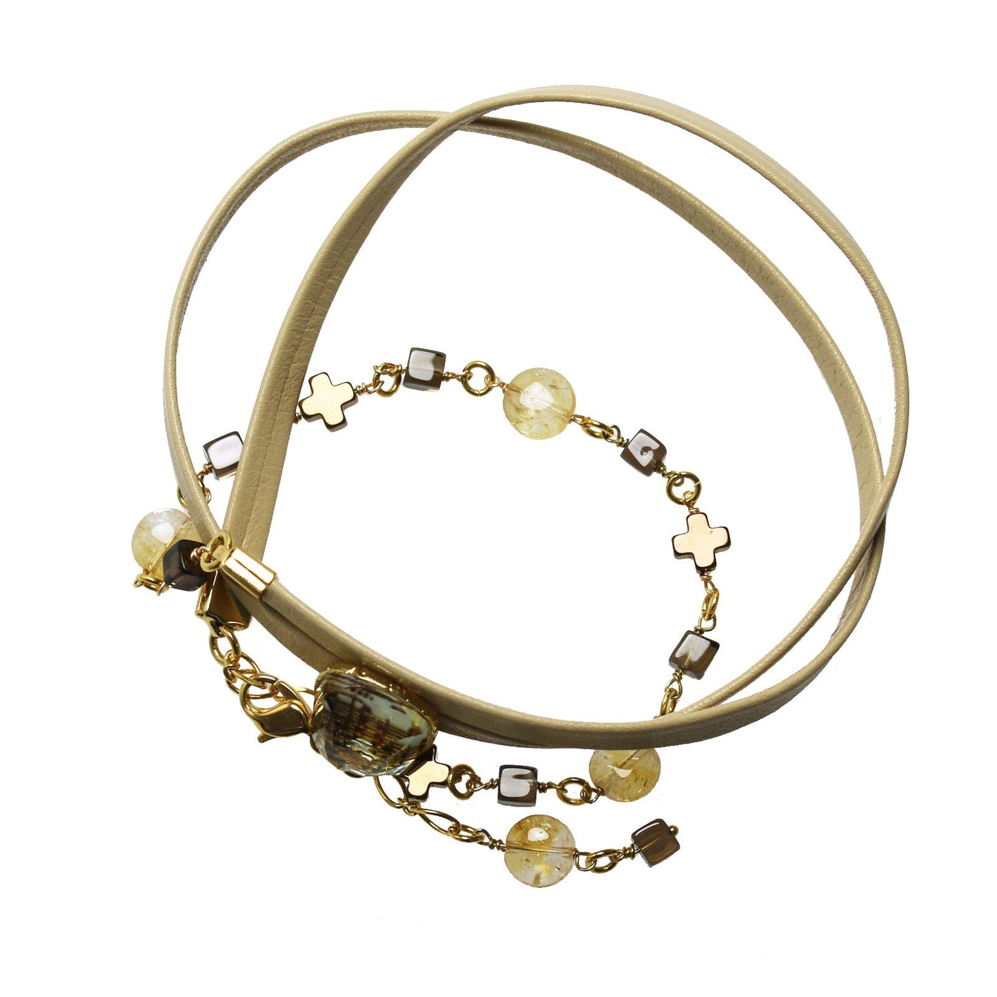 It is a bracelet from the "Musical Note Series" (Yellow) made of resin with leather. It has citrine, smoky quartz, and hematite as a combination according to the color of the resin. This product is made intentionally so that silver or gold powder is put in the resin as a design and the musical note is not seen well. Because I cut the part of the note randomly, it may become a slightly different hue from the photograph.