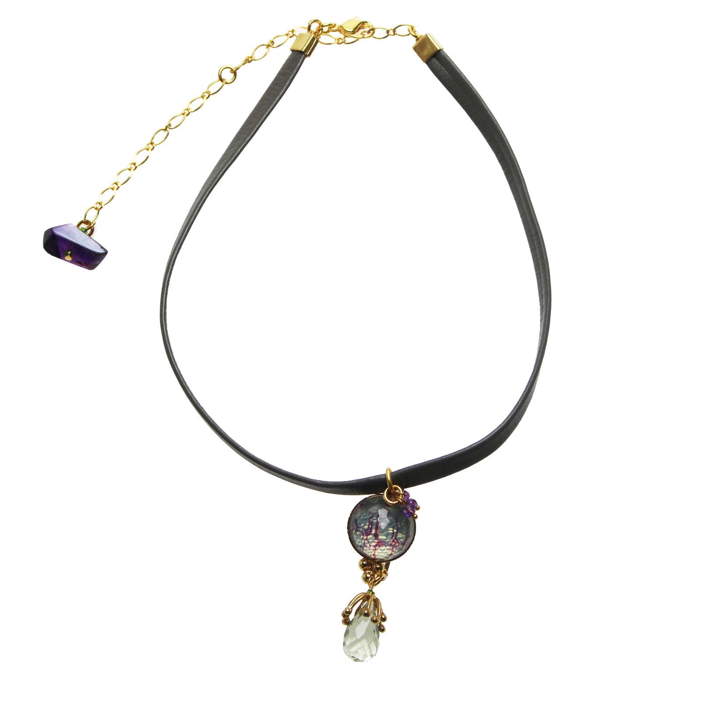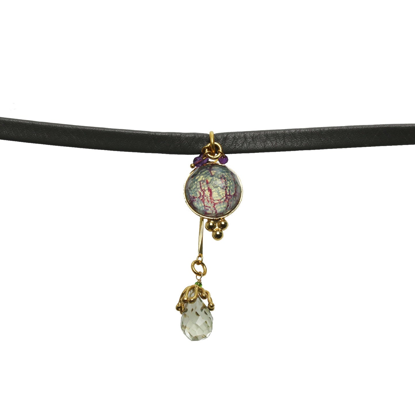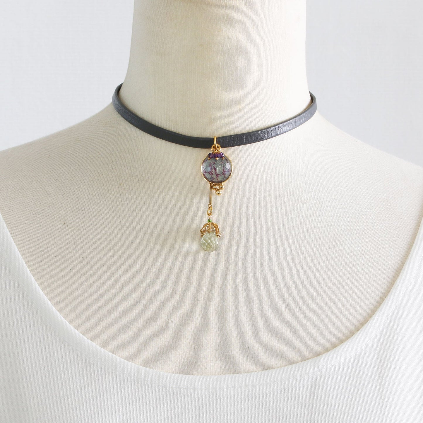 It is a leather string choker using round resin parts of "Water Surface Series" (Blue). Purple amethyst and green amethyst to match the shade of resin shake the unique design. You can enjoy the unique fashion of the chest.