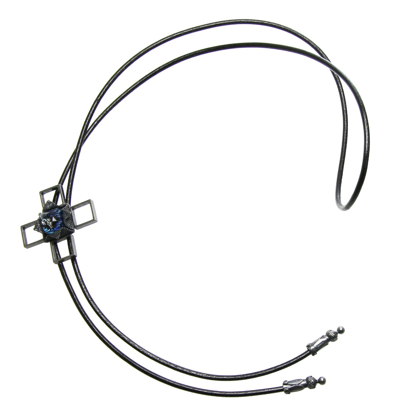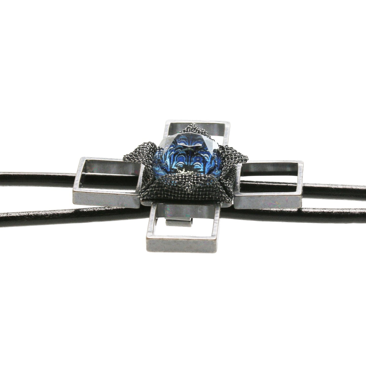 It is a leather strap bolo tie combining square resin parts and mesh parts of "Marble Series" (Blue). Chic hues and unique shapes attract eyes. Mesh parts are unique shapes folded like origami. Pleasing to casual attire accents. Resin parts and metal parts are handmade.