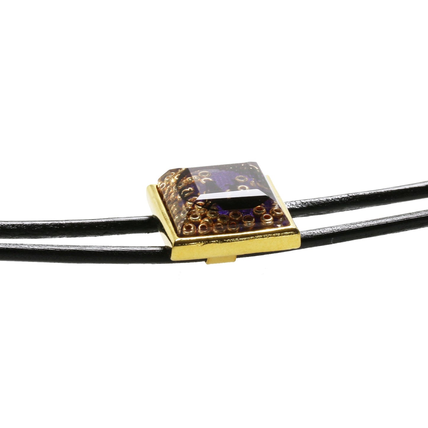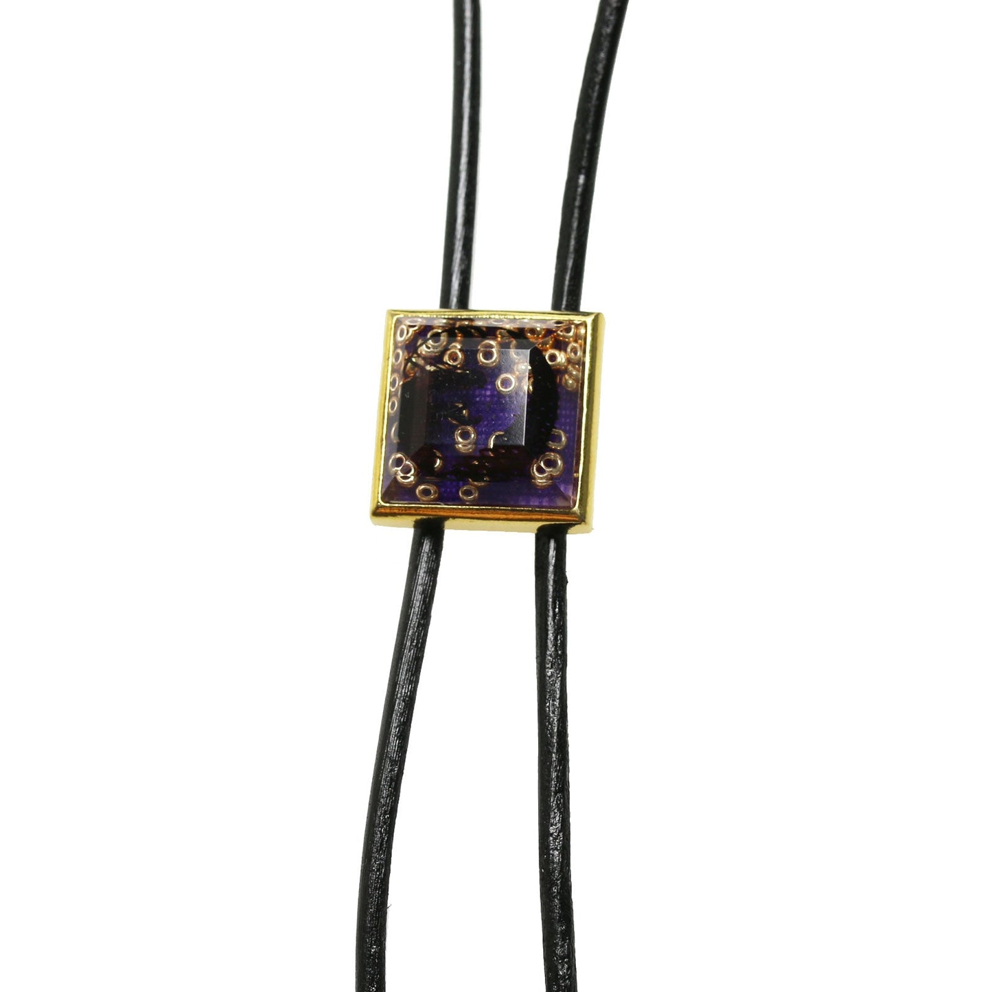 It is a leather bolo tie with the dragon illustration and gold beads submerged in the resin part. Because the background is purple, it has an overall chic design. It is recommended for those who want to enjoy fashion casually, and it is also easy to coordinate. The decorative part can be moved up and down, so it suits not only shirts but also knitwear, dresses, polo shirts, etc. It is designed for both men and women.