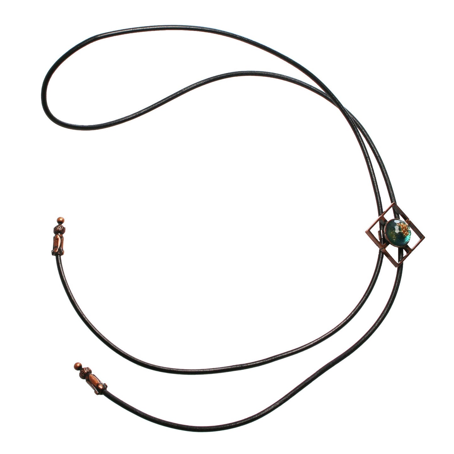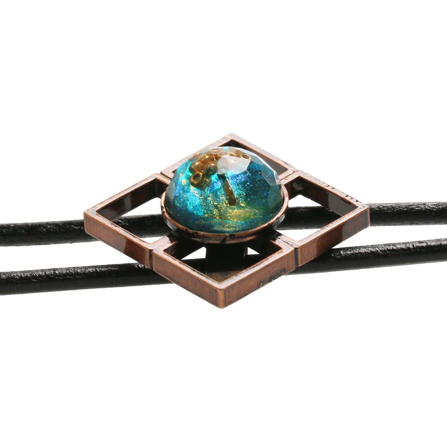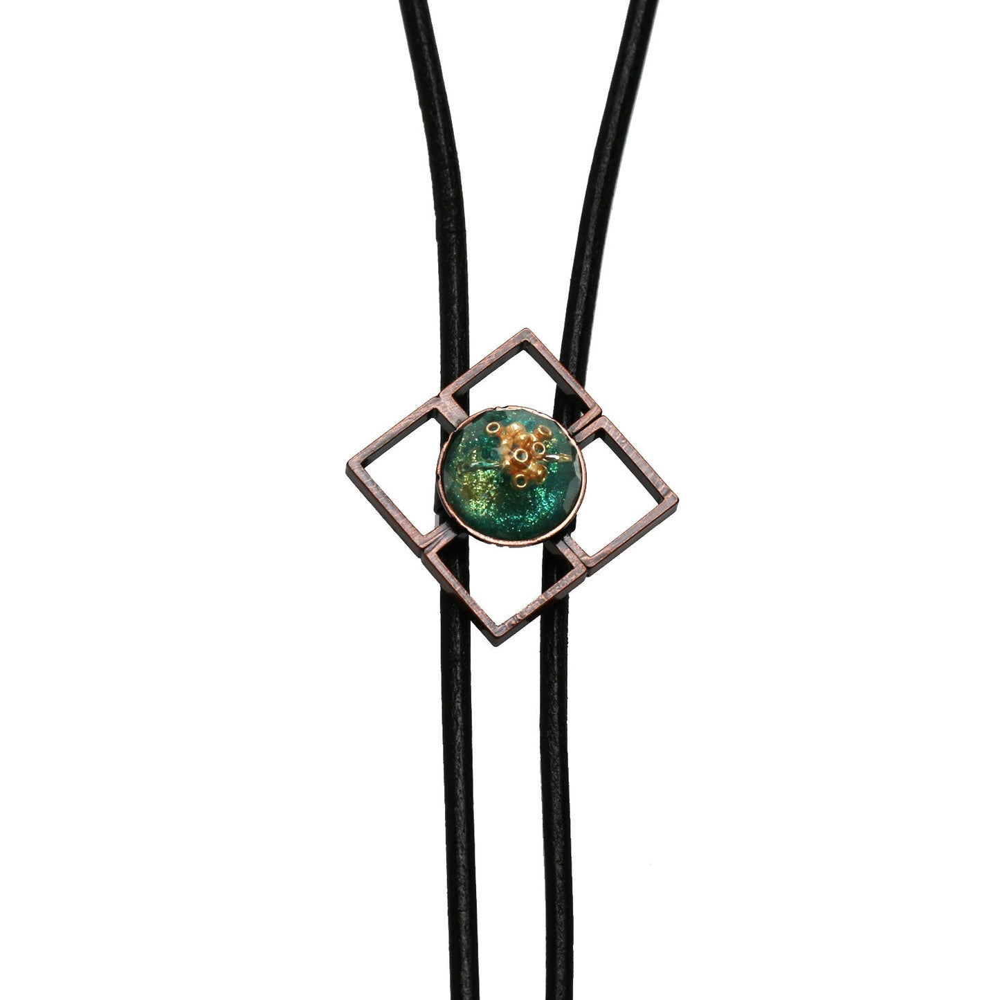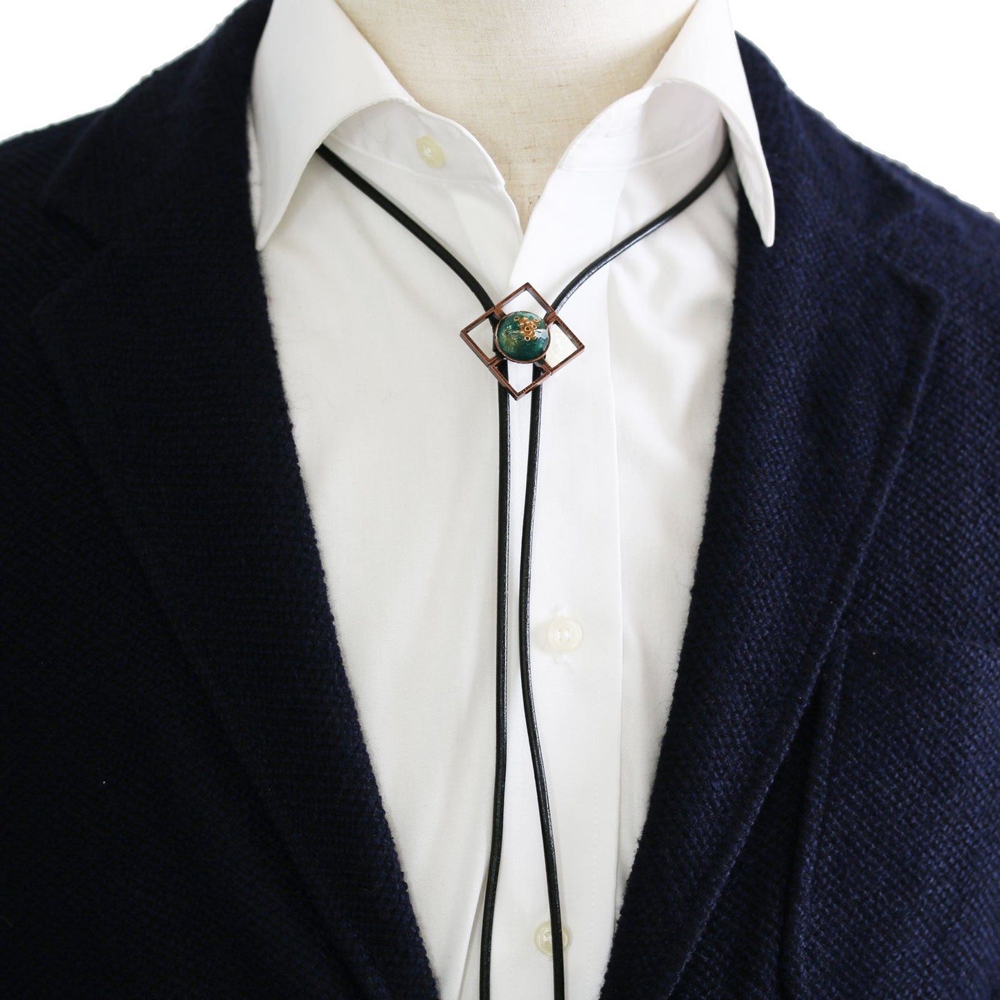 It is a leather strap bolo tieusing round resin parts of "Jewel Box Series" (Emerald). It attracts the eye in a unique shape and chic shades. Pleasing to casual attire accents.