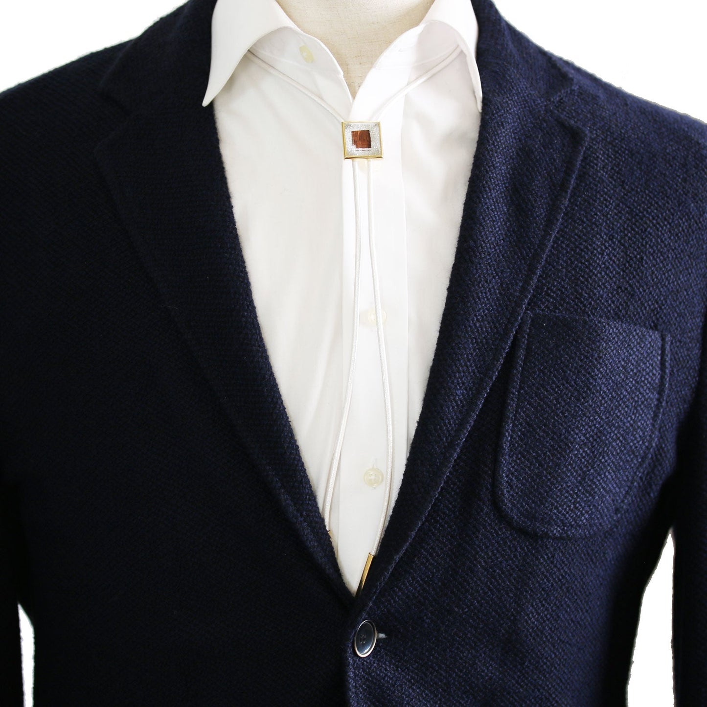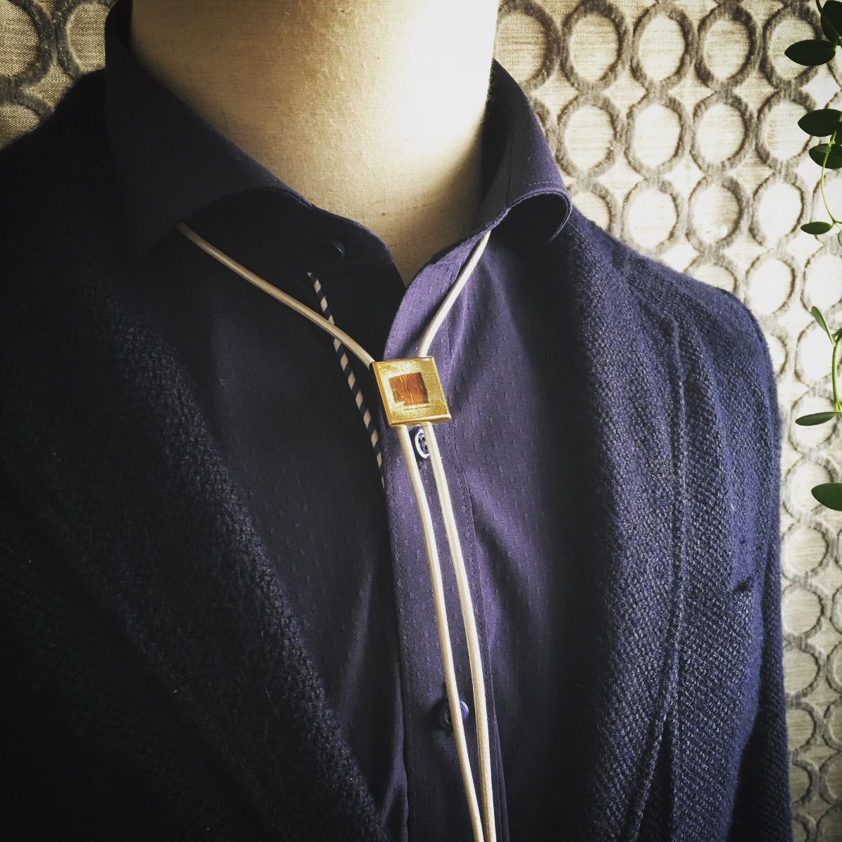It is a leather strap bolo tie using square resin parts of "Wood & Lame Series". The brown part in the middle is a grain pattern. It is a recommended bolo tie that you can use for both casual and party specifications.