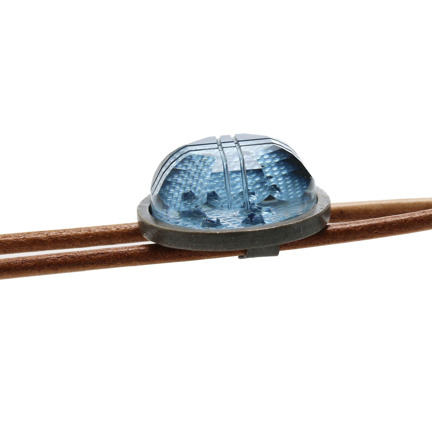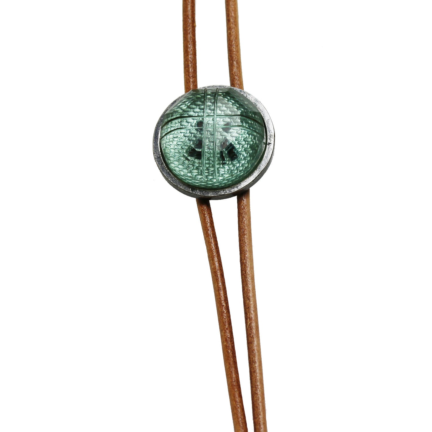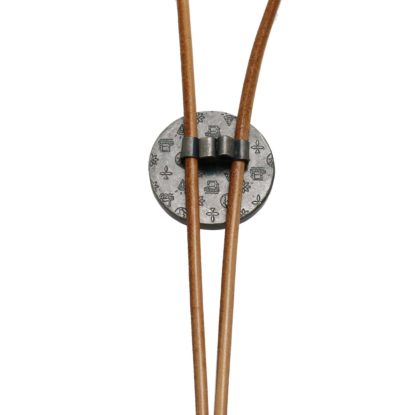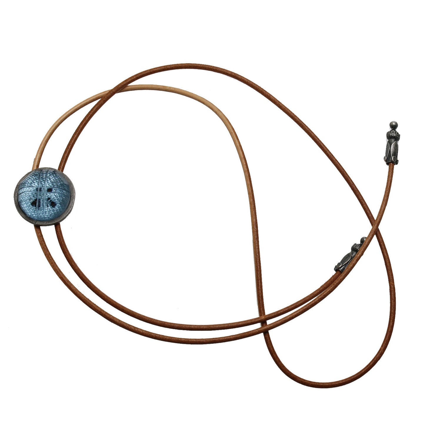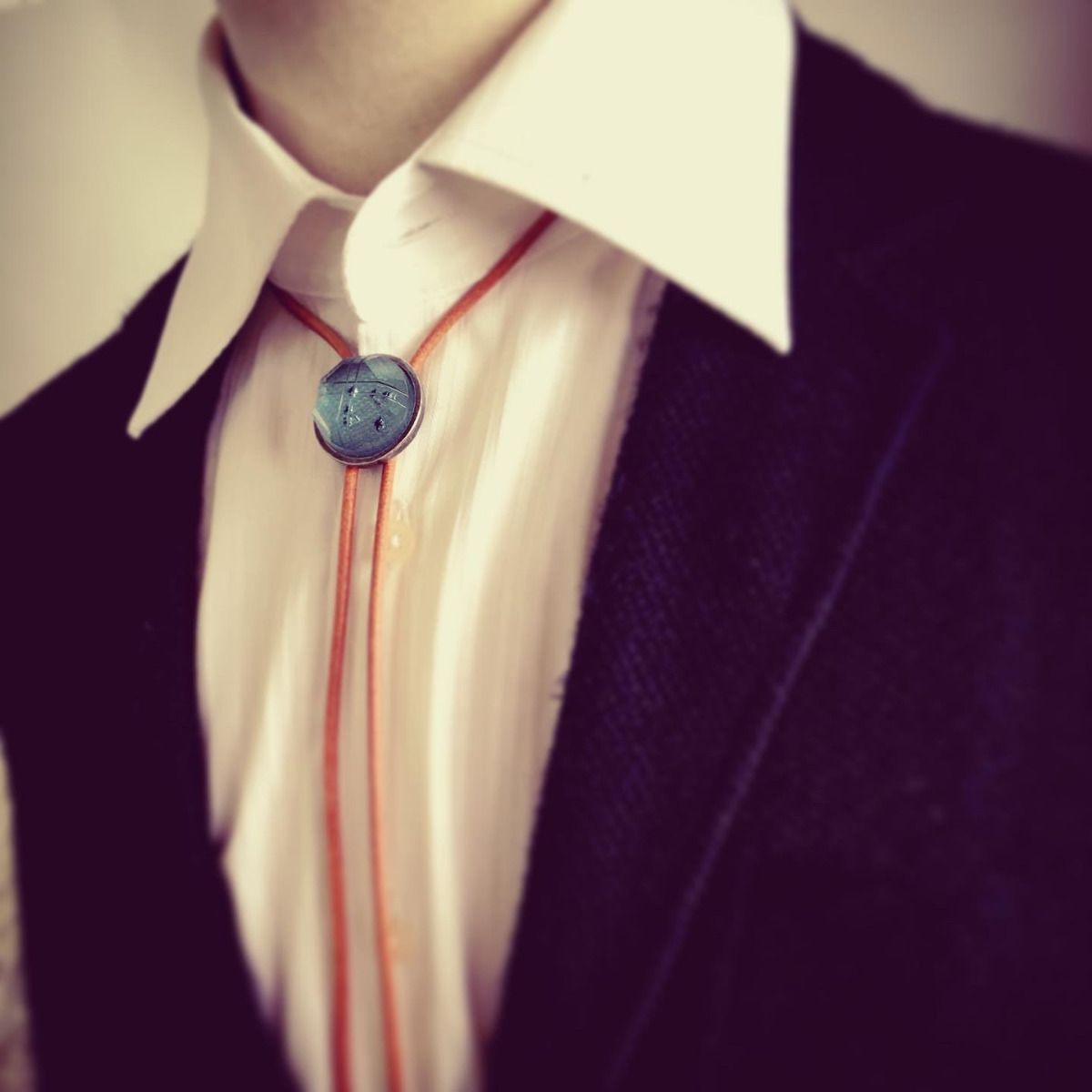 It is a leather strap bolo tie using round resin parts of "Dandy series". It is easy to coordinate with a simple light blue. Pleasing to casual attire accent. "Dandy Series" designed as a button. Four holes were made in uneven color paper, after hardening with resin, painted dark brown color from behind. The contrast with the color seen from the four holes is the point.