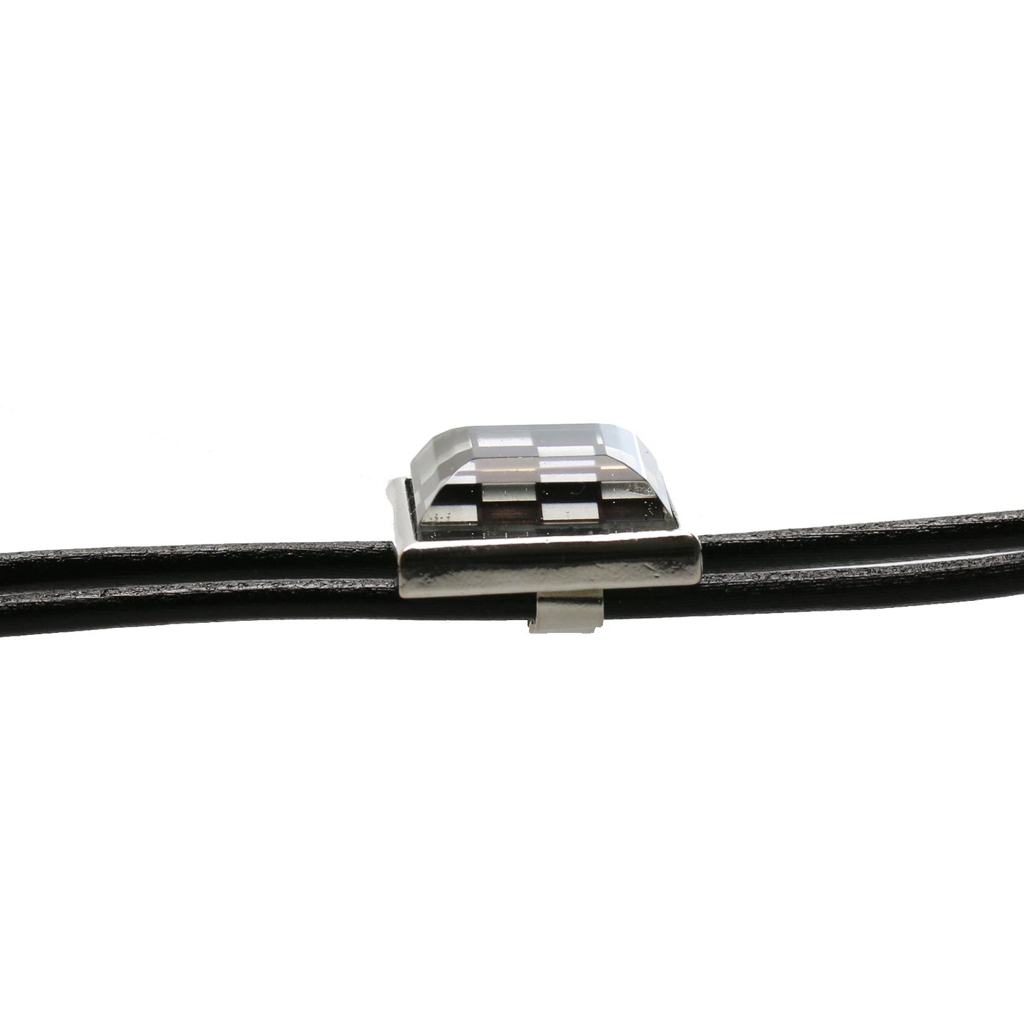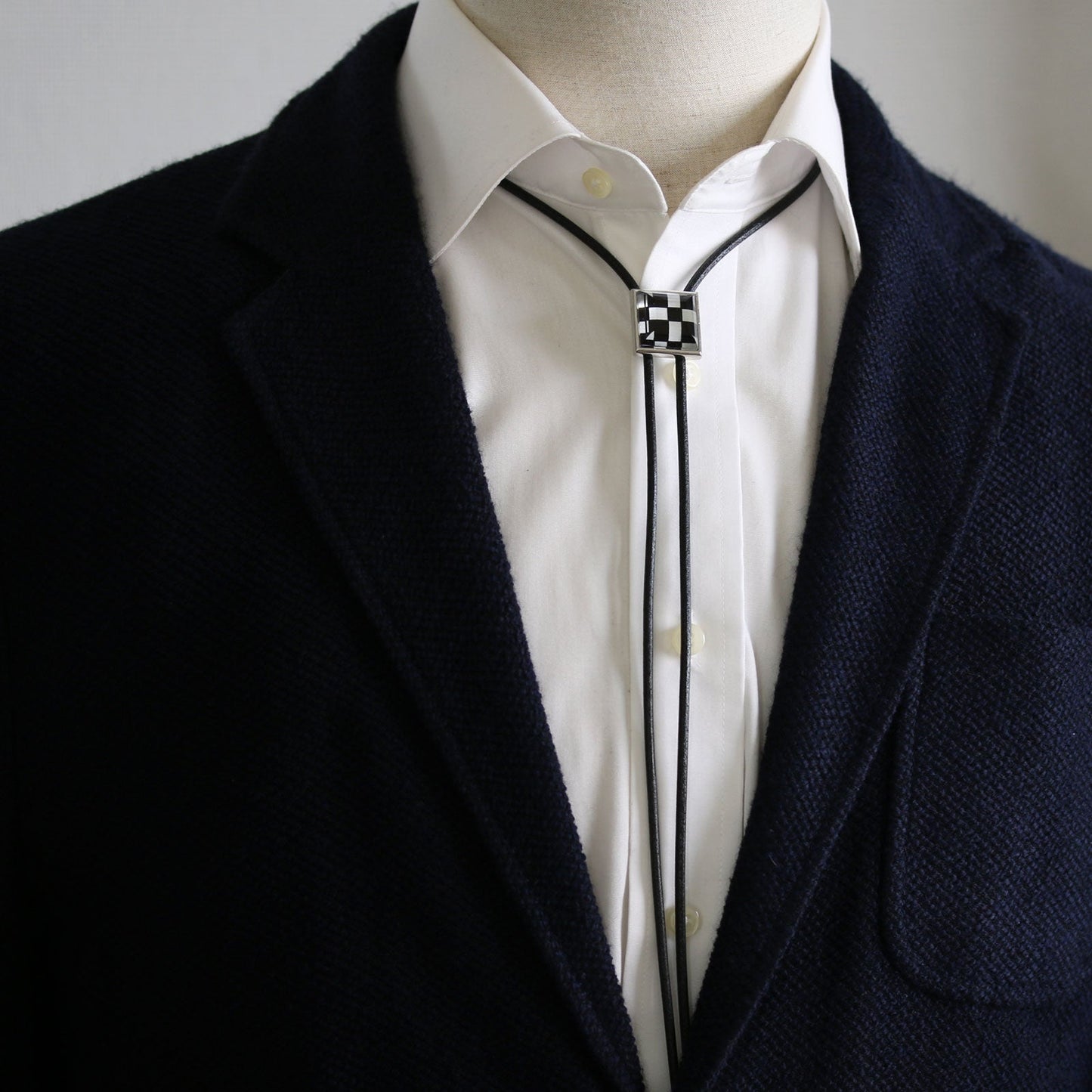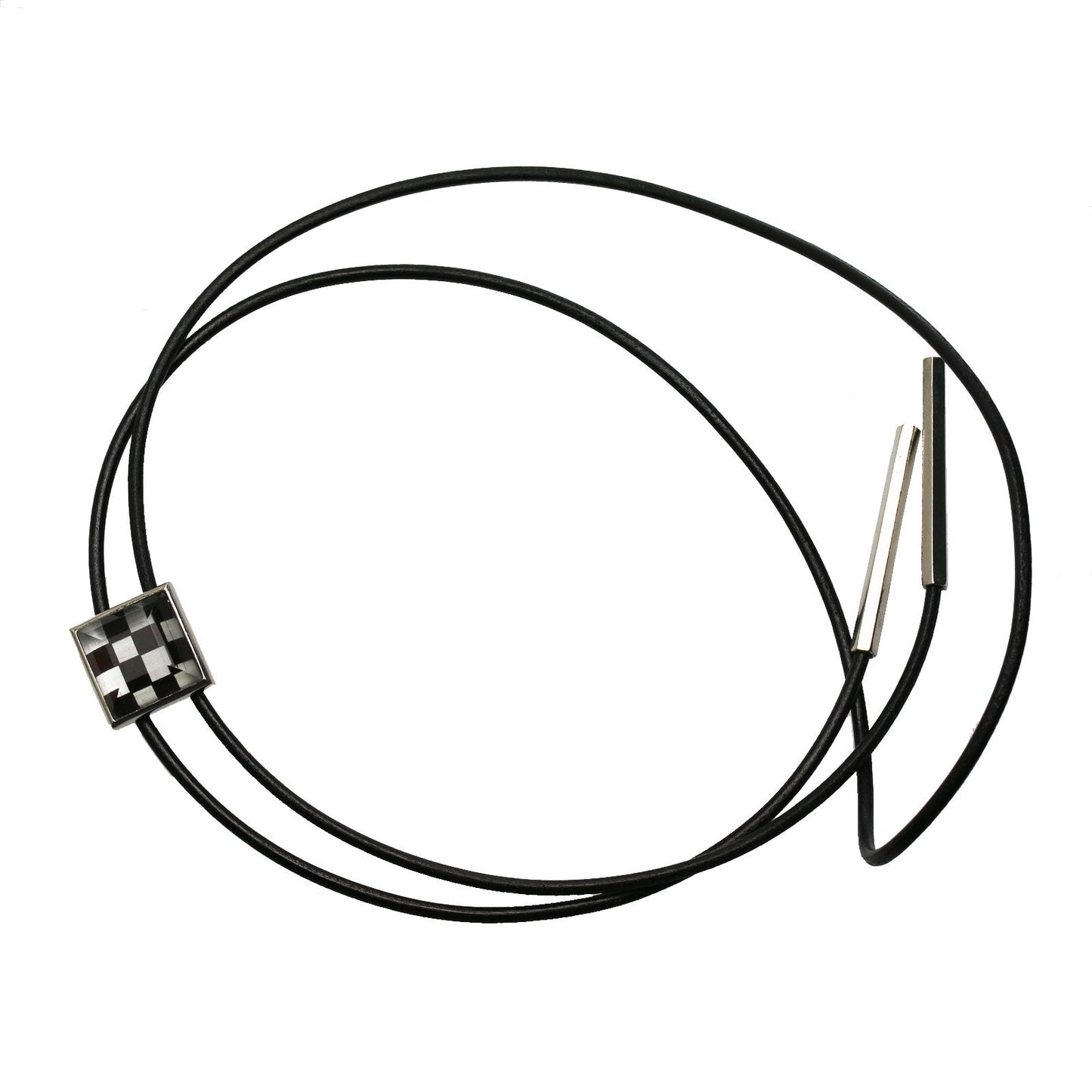 It is a leather strap bolo tie using resin parts of checkerboard pattern of "Black and White Series". It is easy to coordinate with a simple shape and chic hues.
