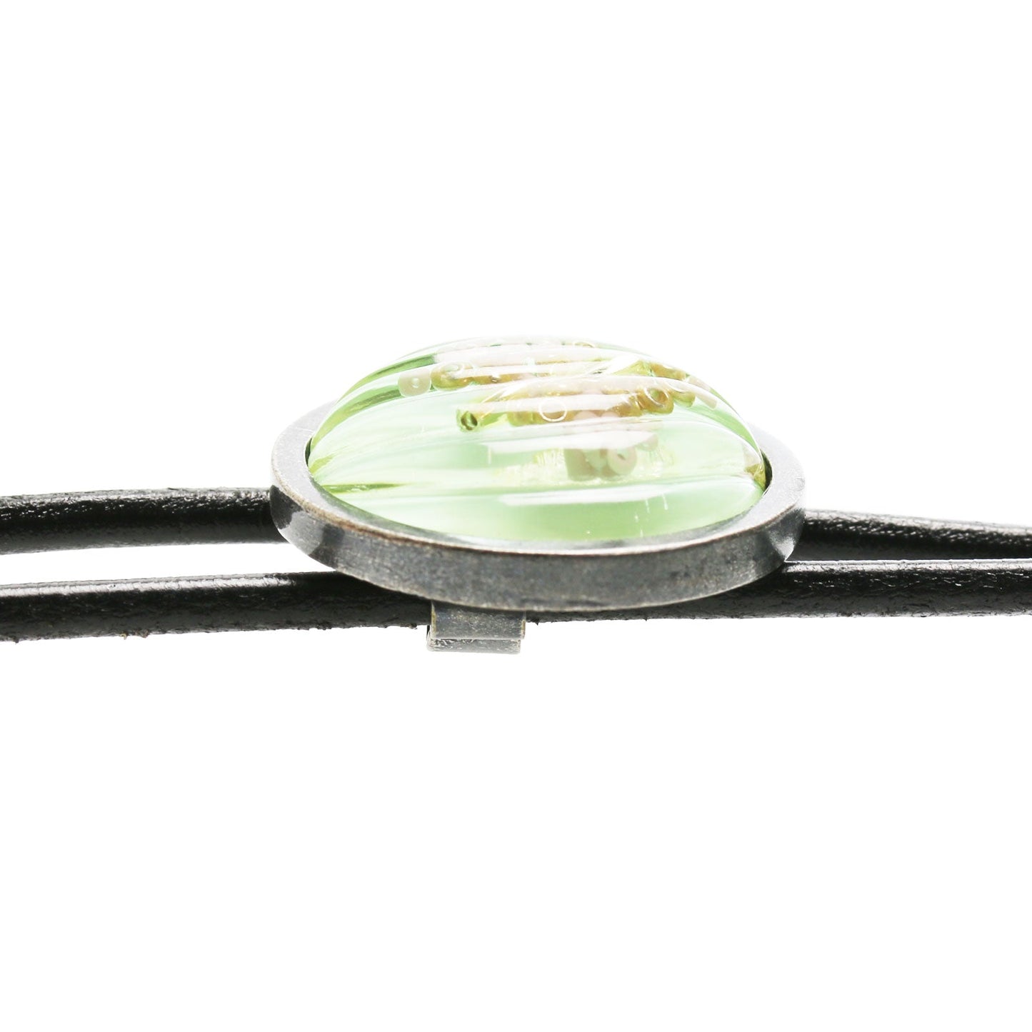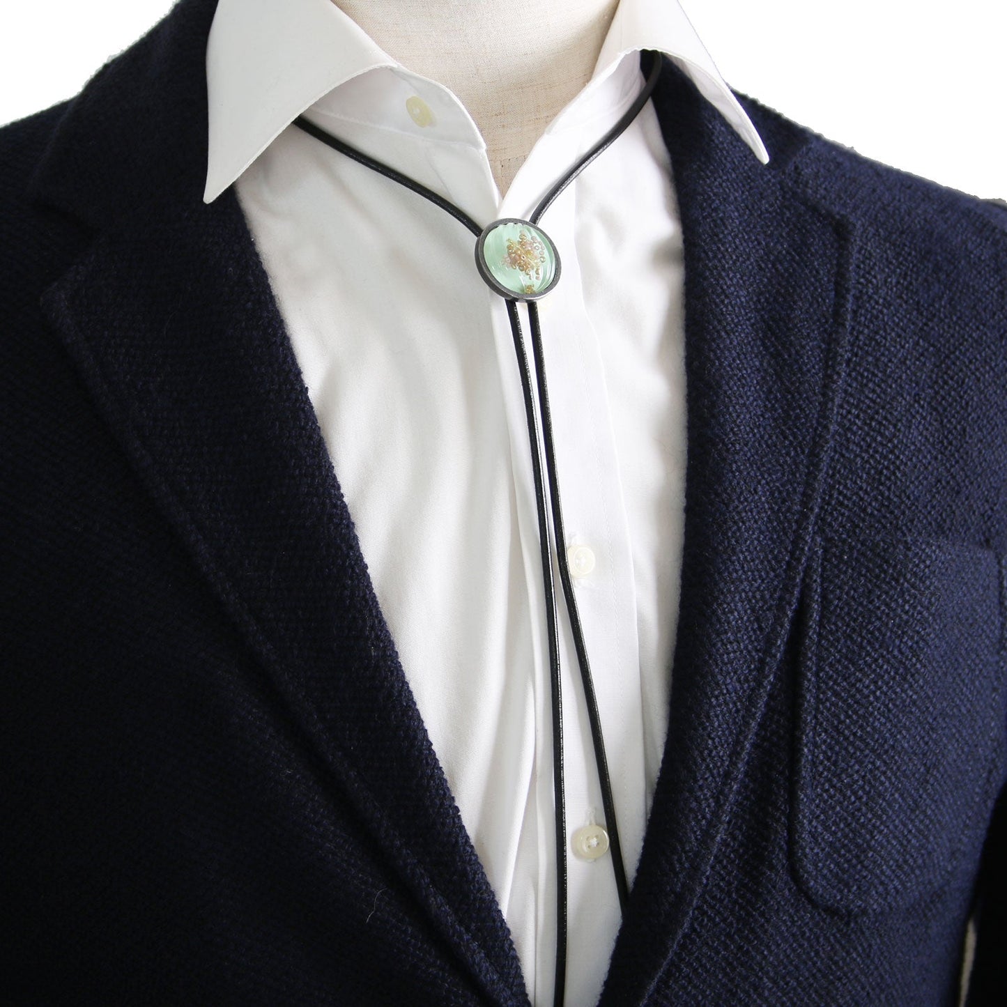 It is a leather strap bolo tie using round resin parts of "Jewel Box Series" (Blue). It is gorgeous design that the beads in the resin shine brightly.